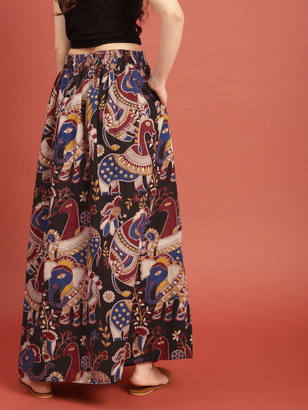 Black & Maroon Kalamkari Hand Block Print Ethnic Sustainable Maxi Pure Cotton Skirt with Gathers