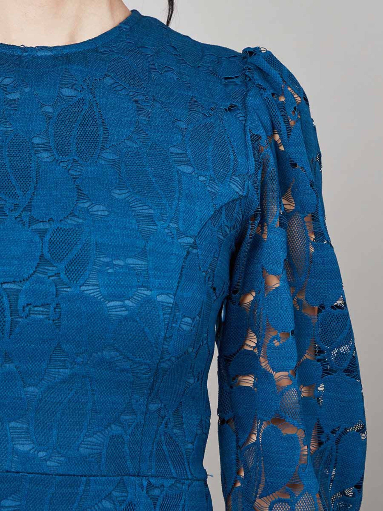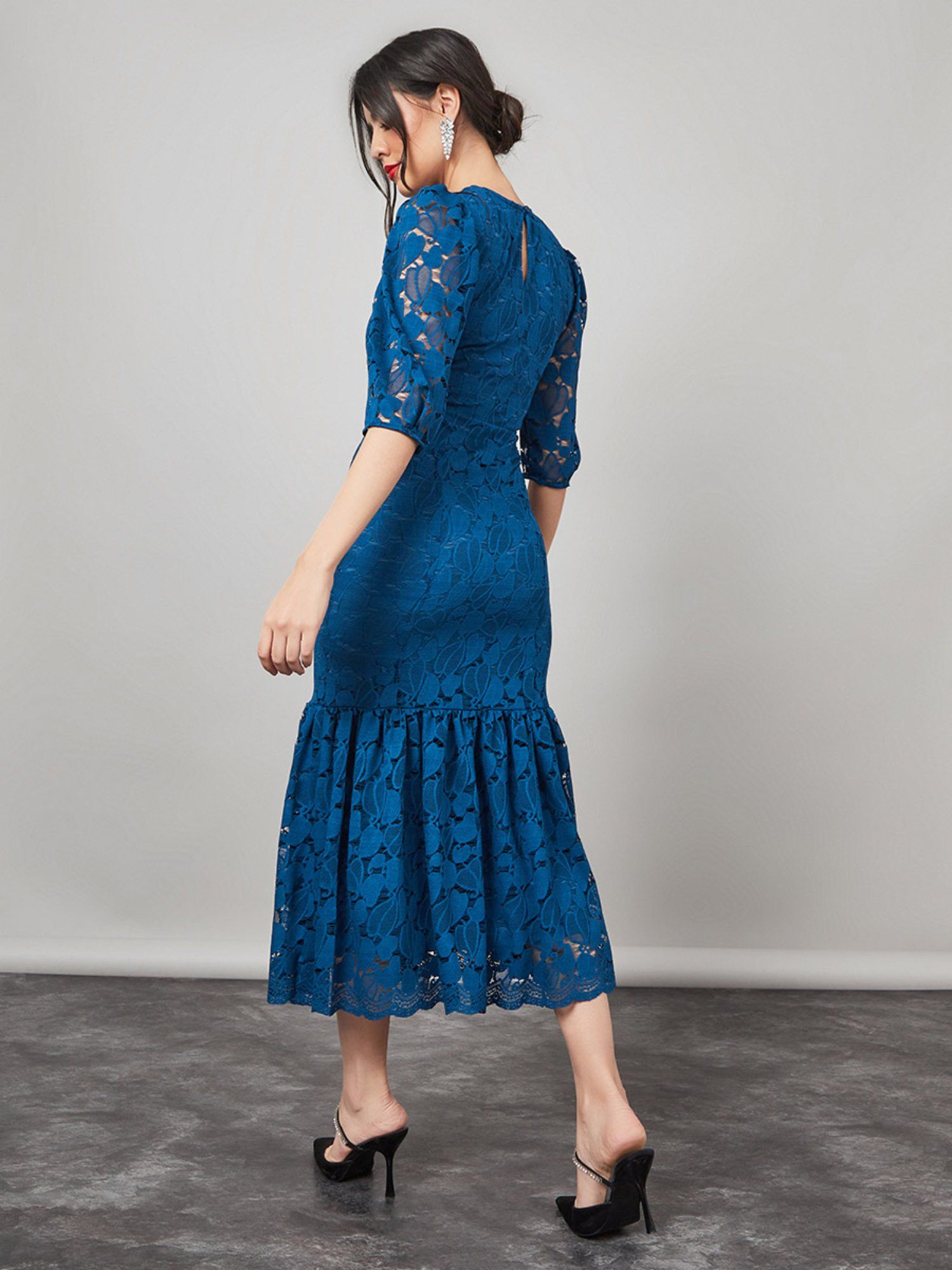 Blue Puff Sleeves Lace Insert Frill Hem Bodycon Midi Dress