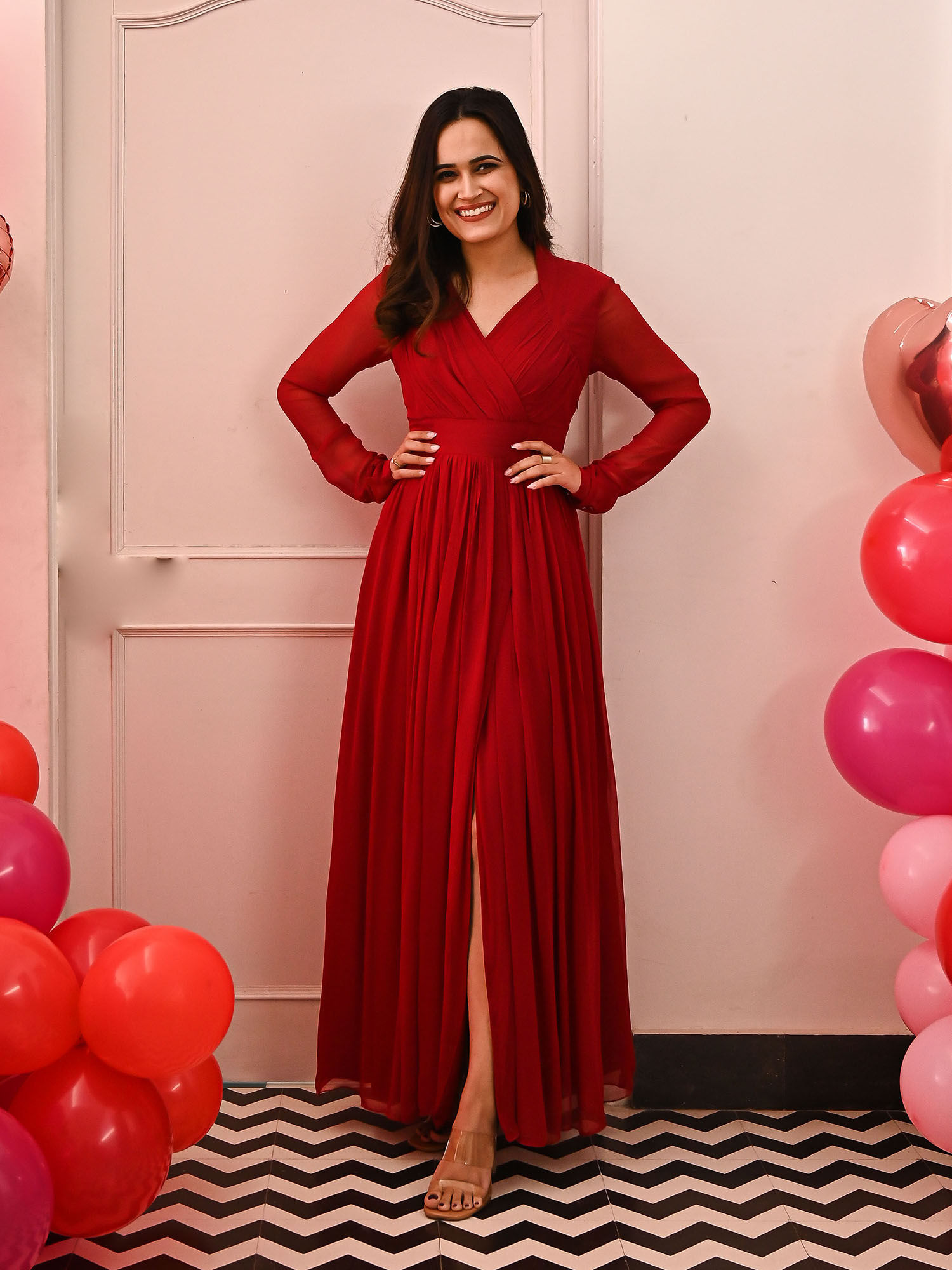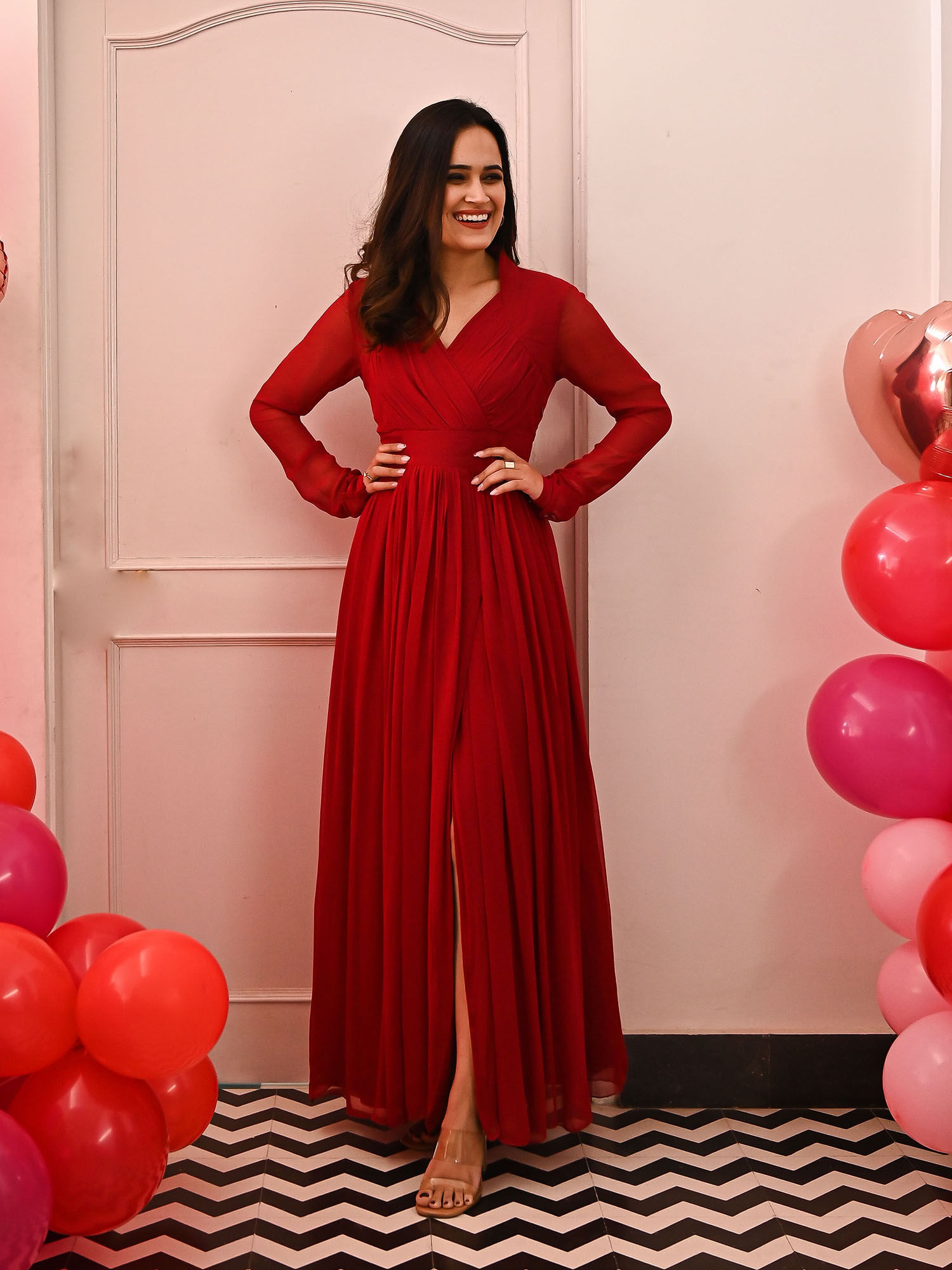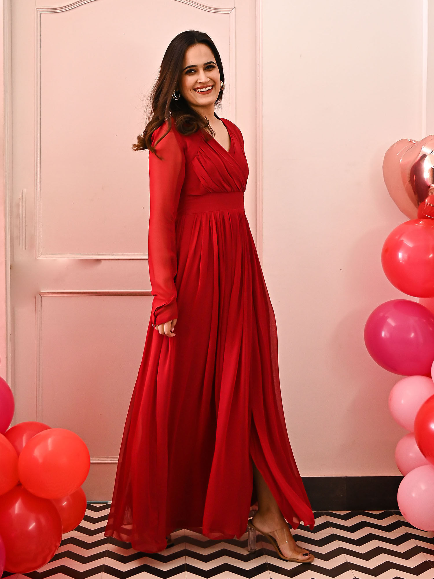 his long garnet dress made with high quality georgette fabric is everything you want for a night to remember...