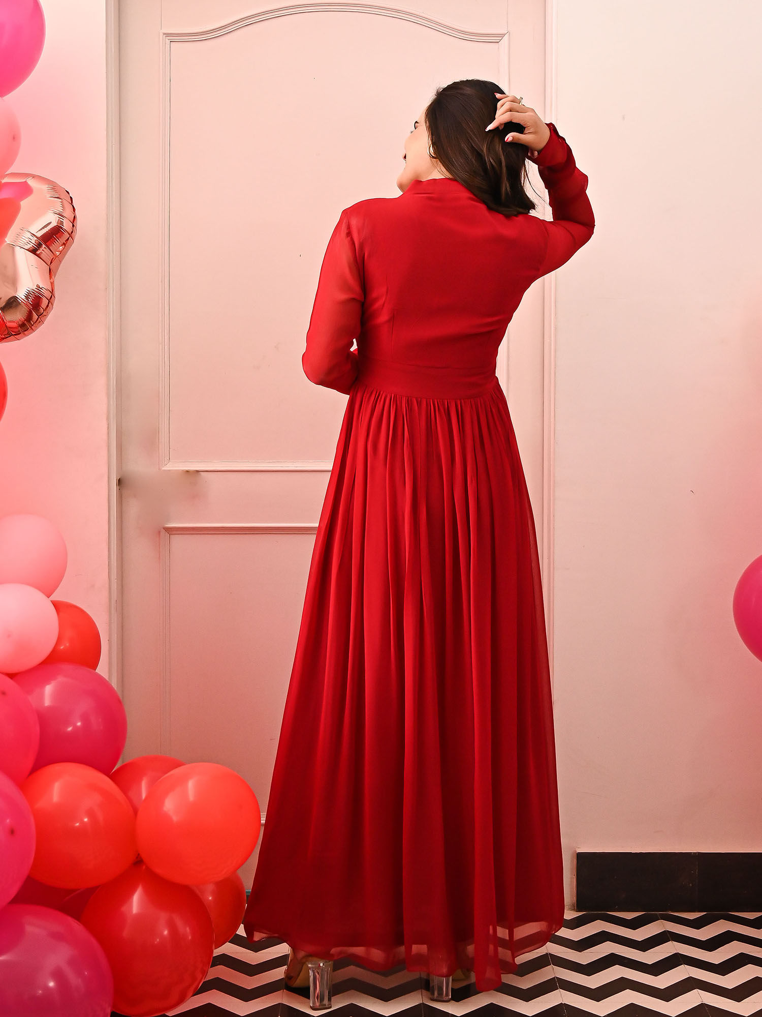 649-1690 [Color = Red ] [Size = XS, S, M, L, XL, 2XL] his long garnet dress made with high quality georgette fabric is every...