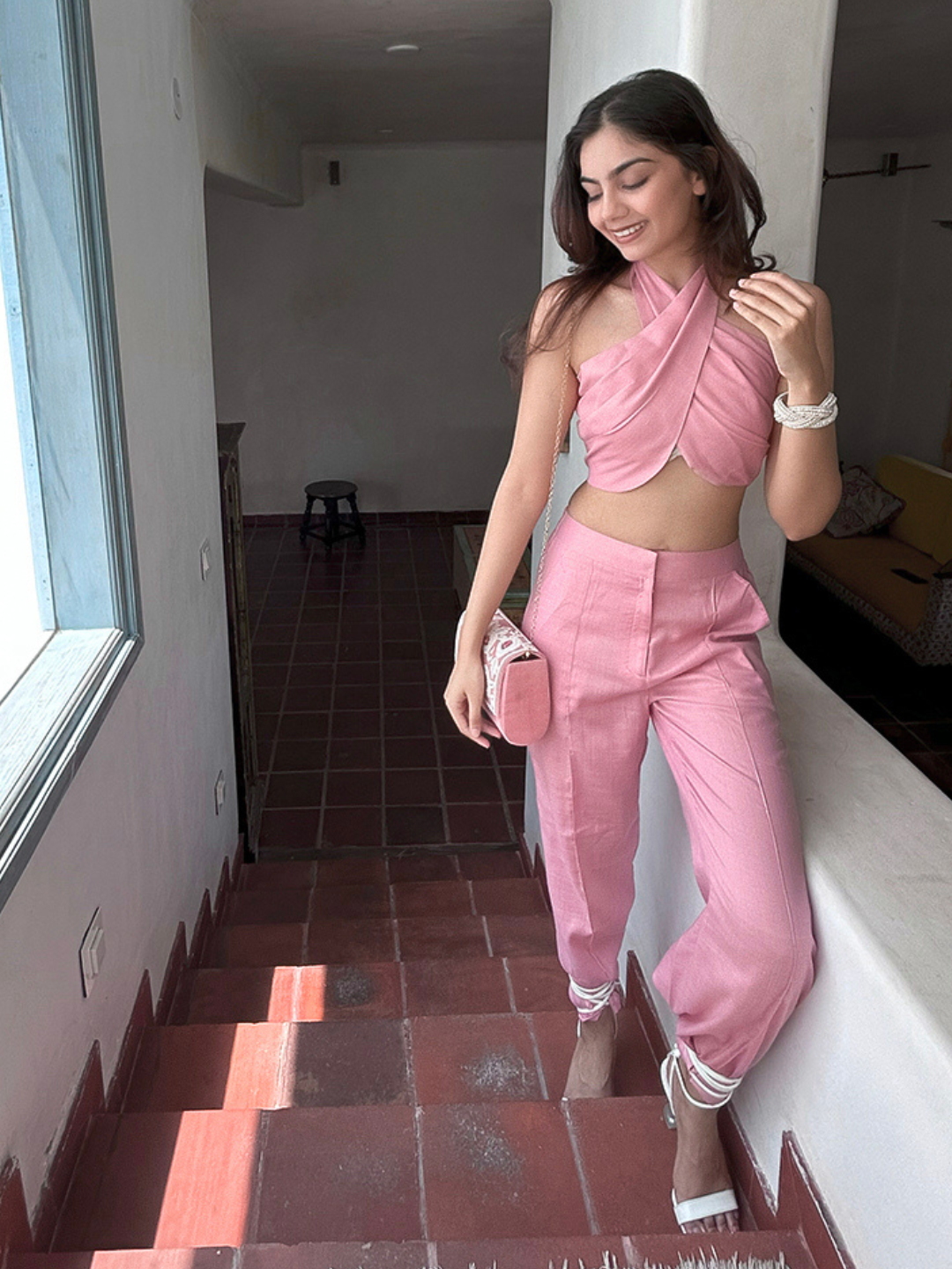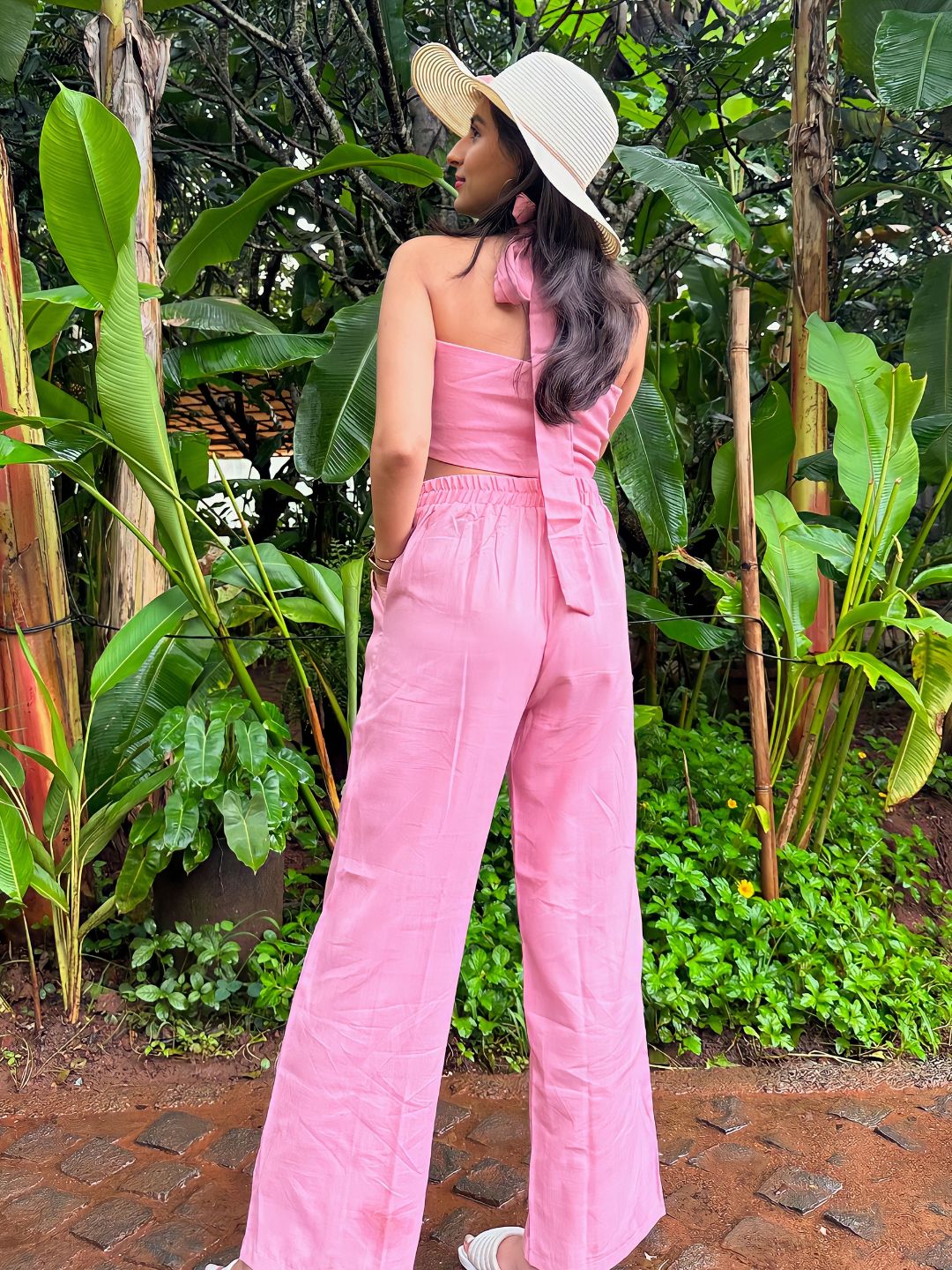 Level up your party looks with the Linen Two piece Co-ord set! The set features linen pants and a linen halter neck crop top. The pants have a super soft back elastic for the perfect fit. Special technology has been used to make sure our linen fabric wrinkles very less. ....