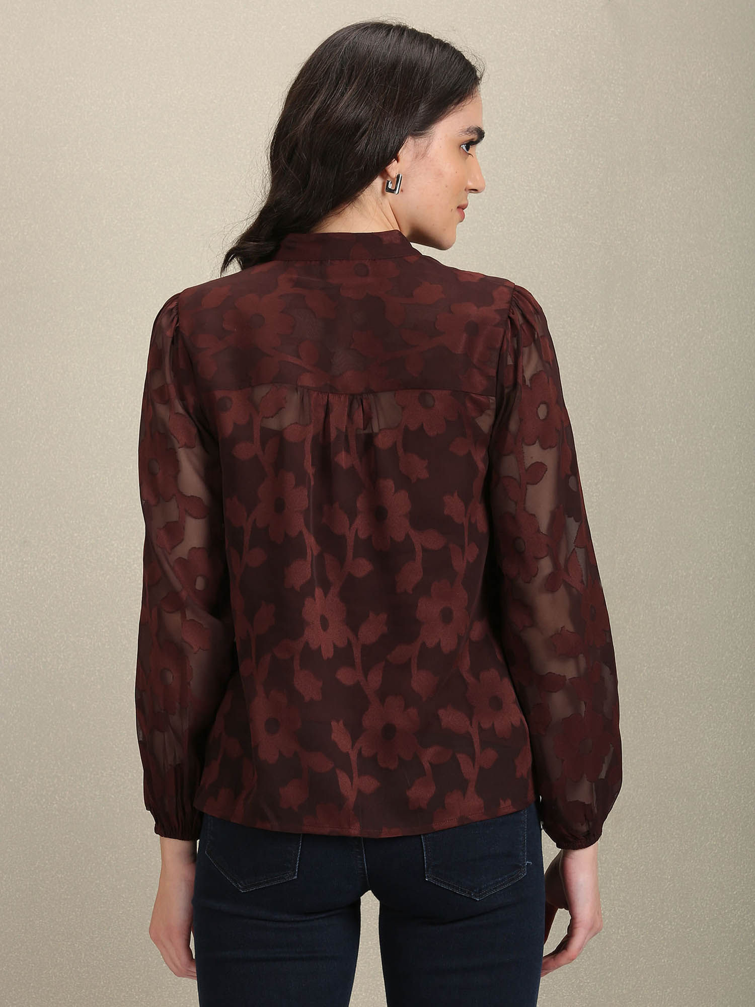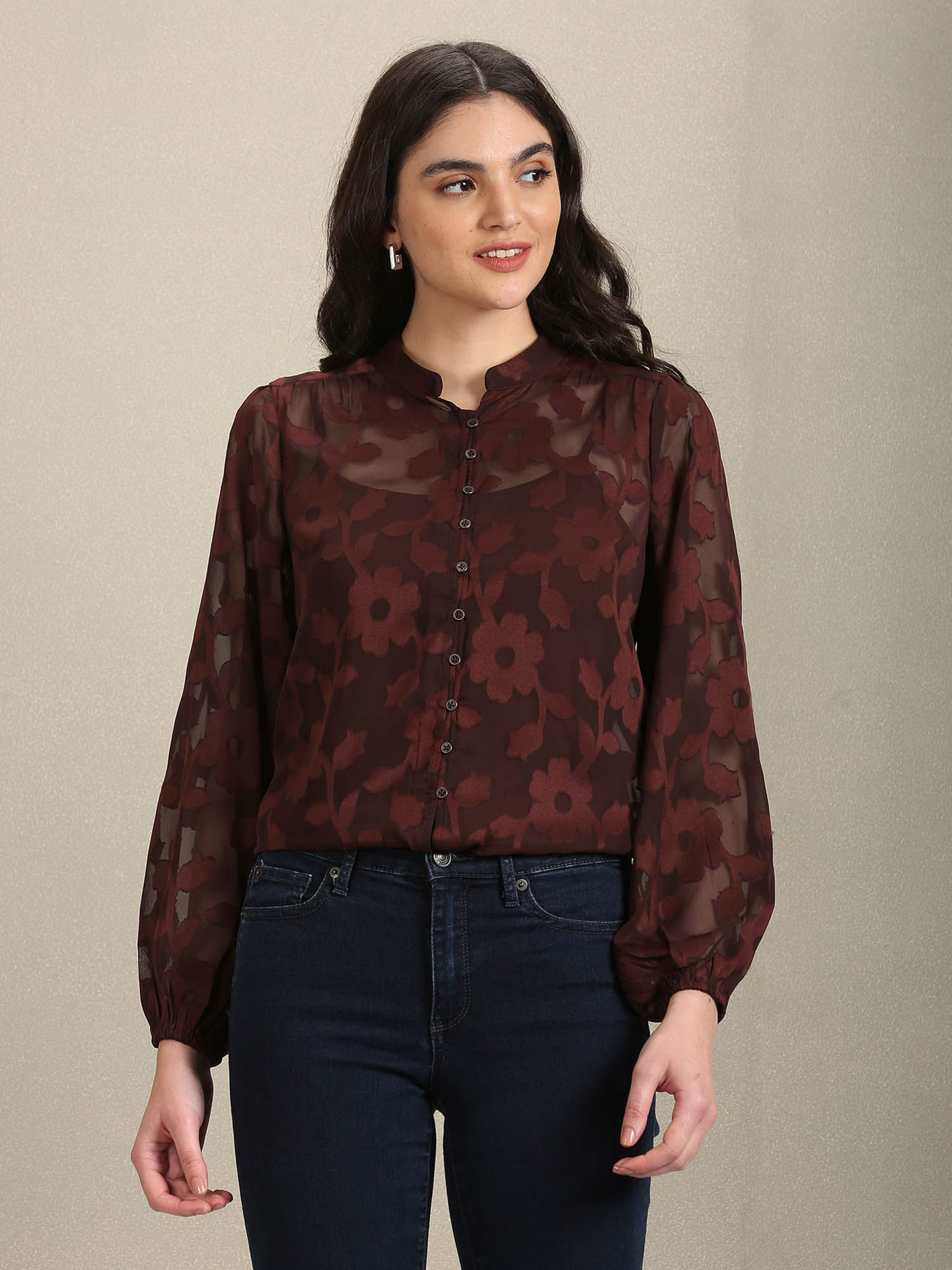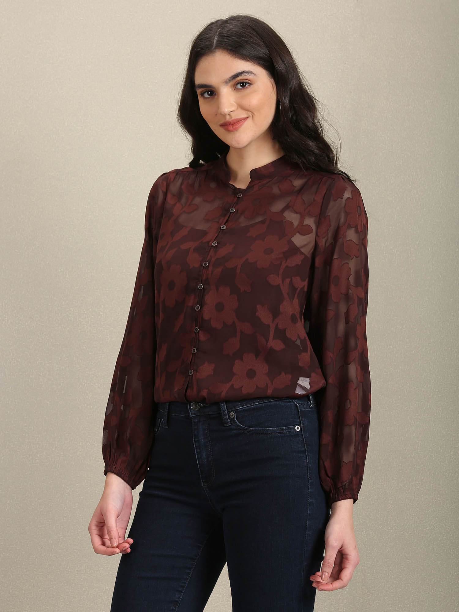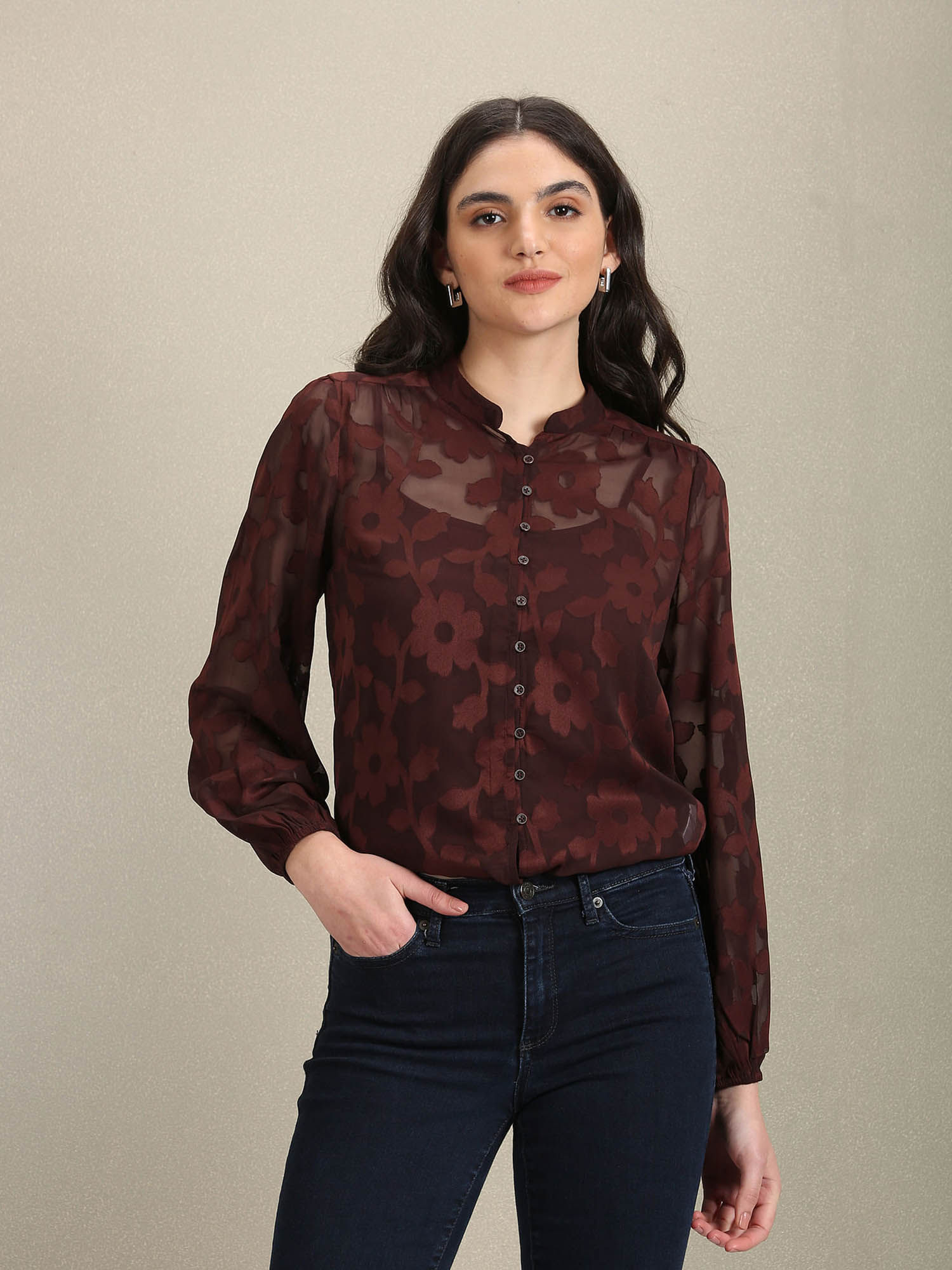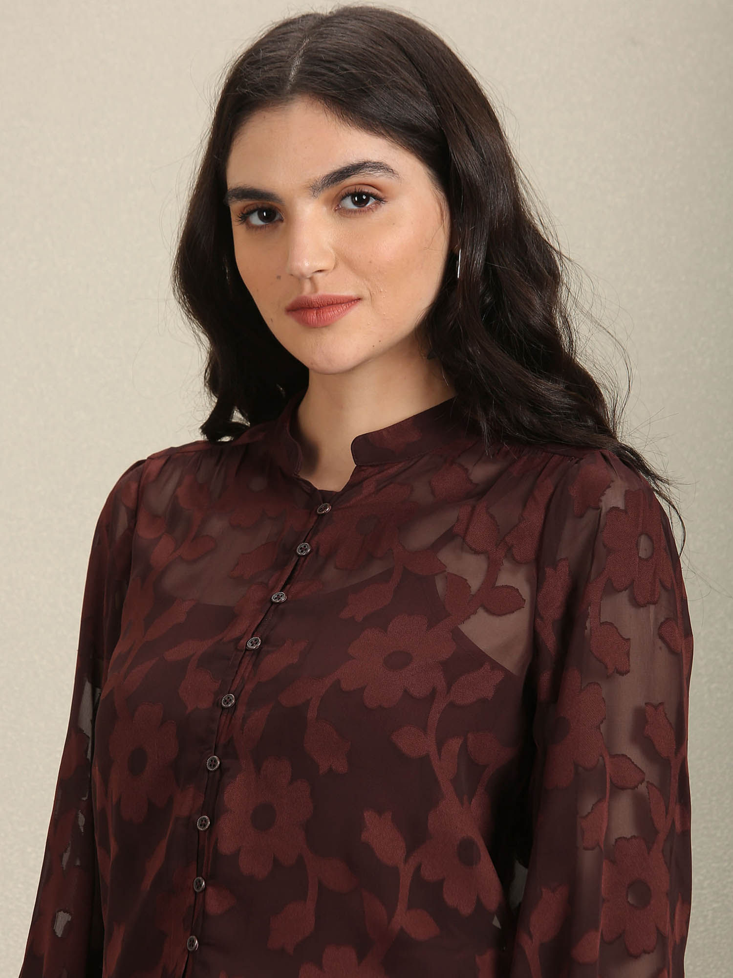 289-749 [Color = Brown ] [Size = XS, S, M, L, XL, 2XL] This long-sleeve shirt is accented with a mandarin c...