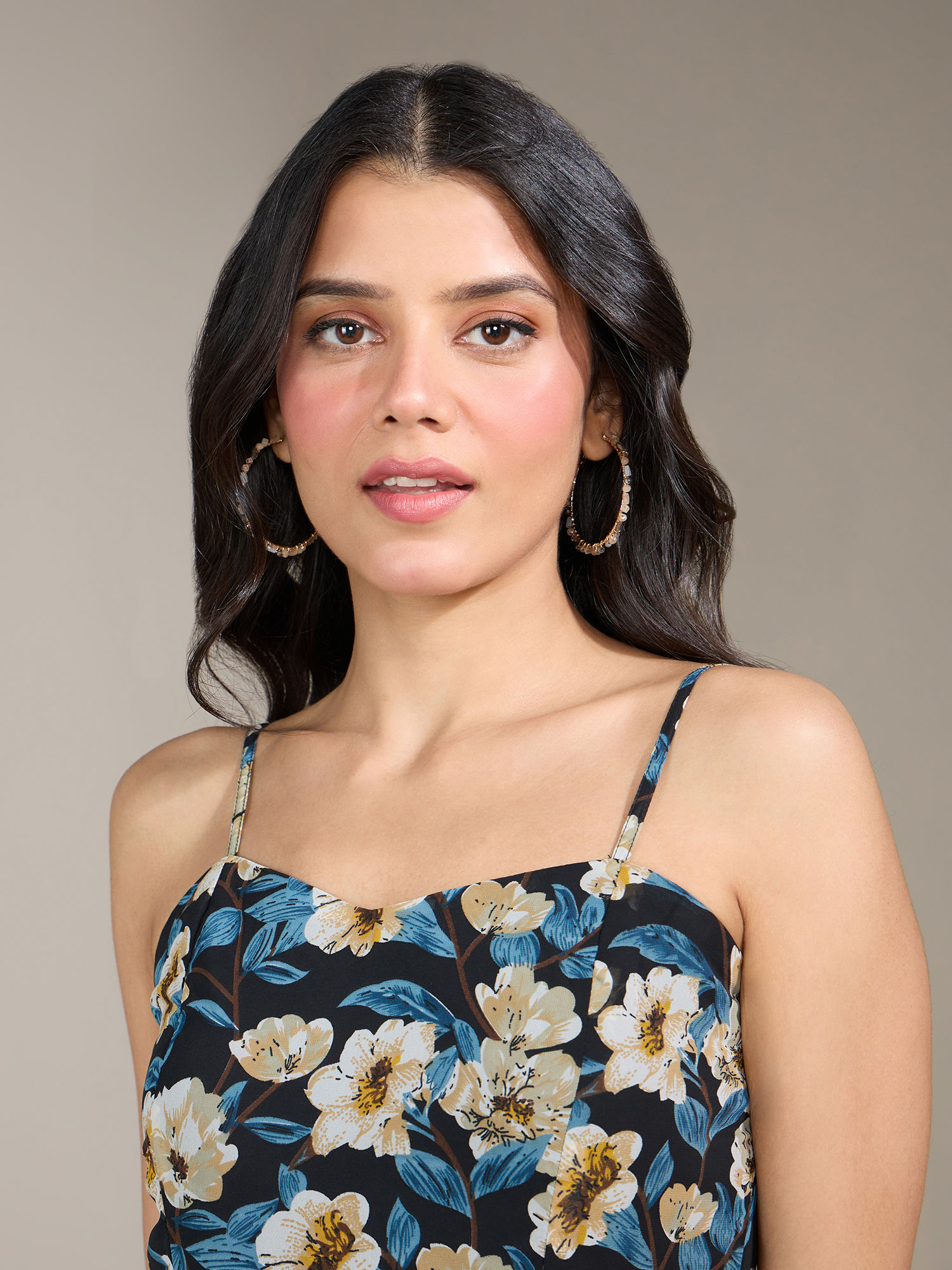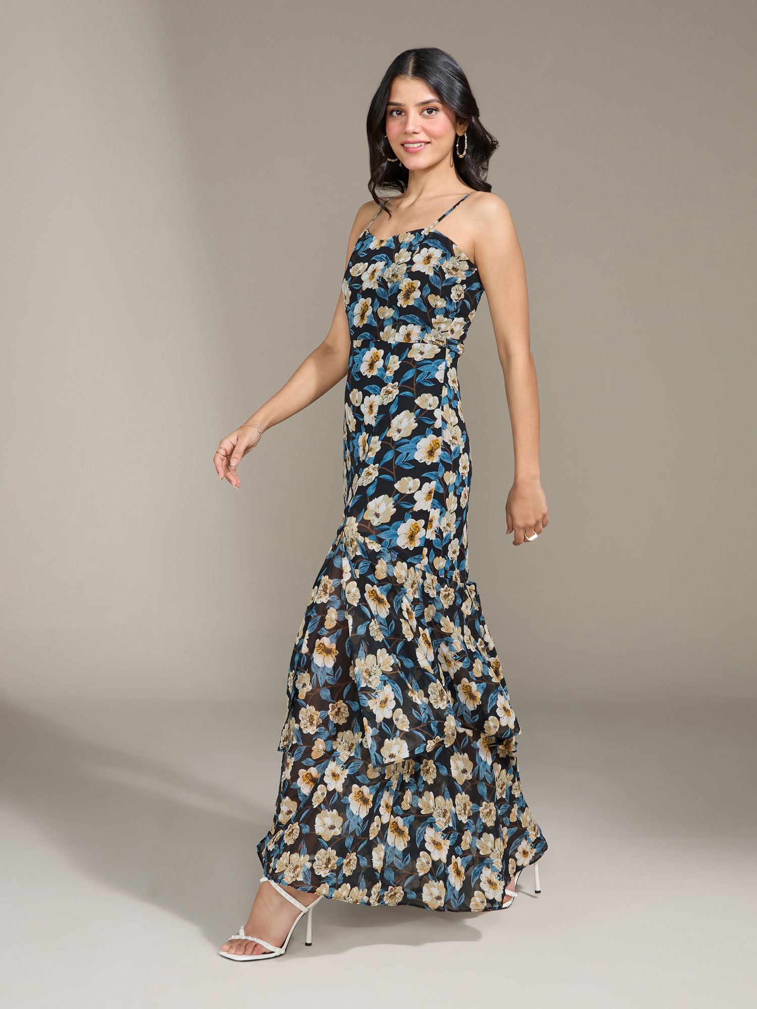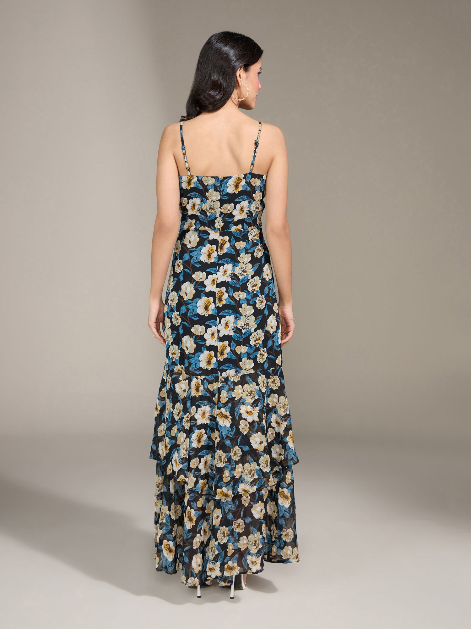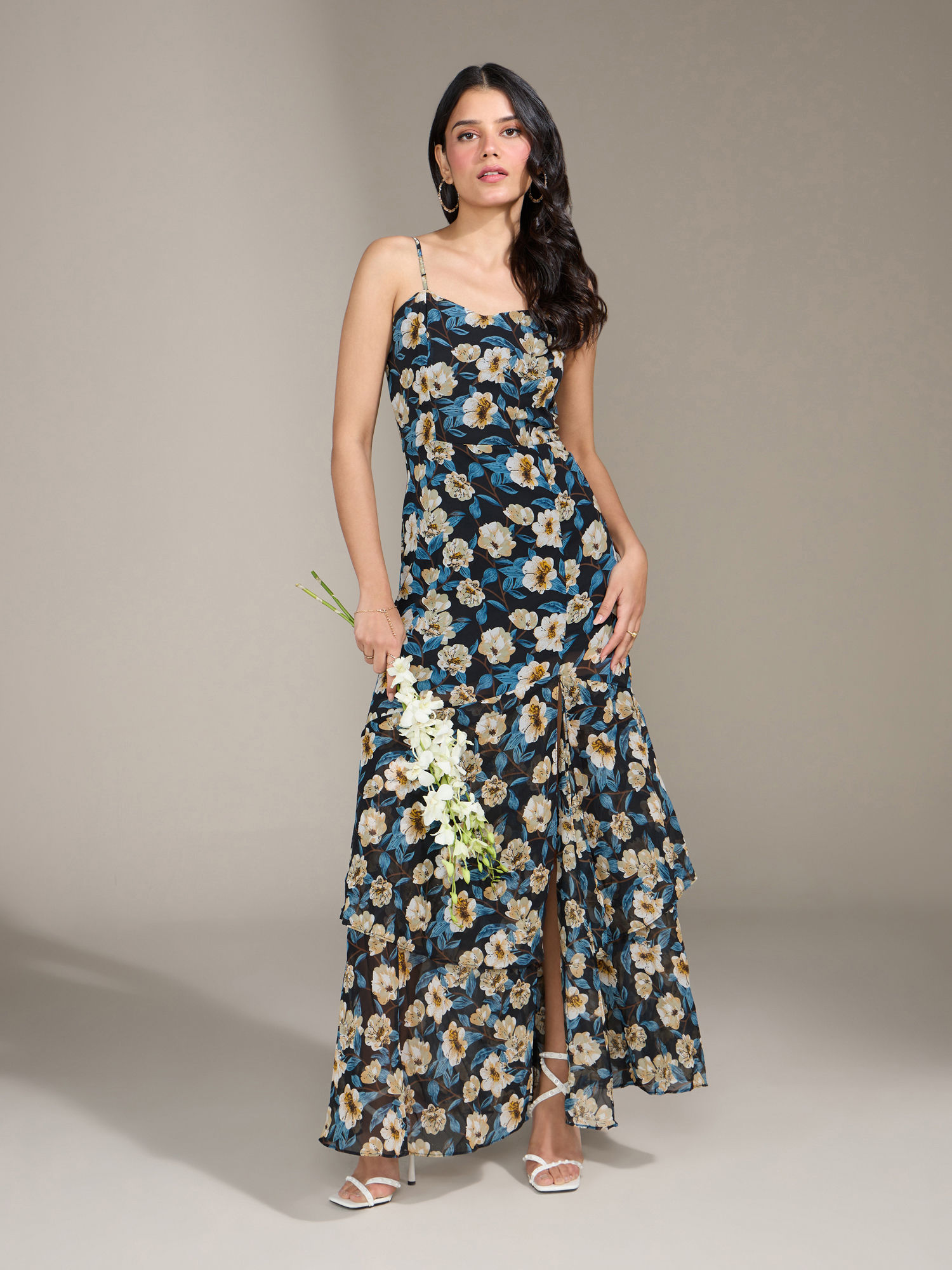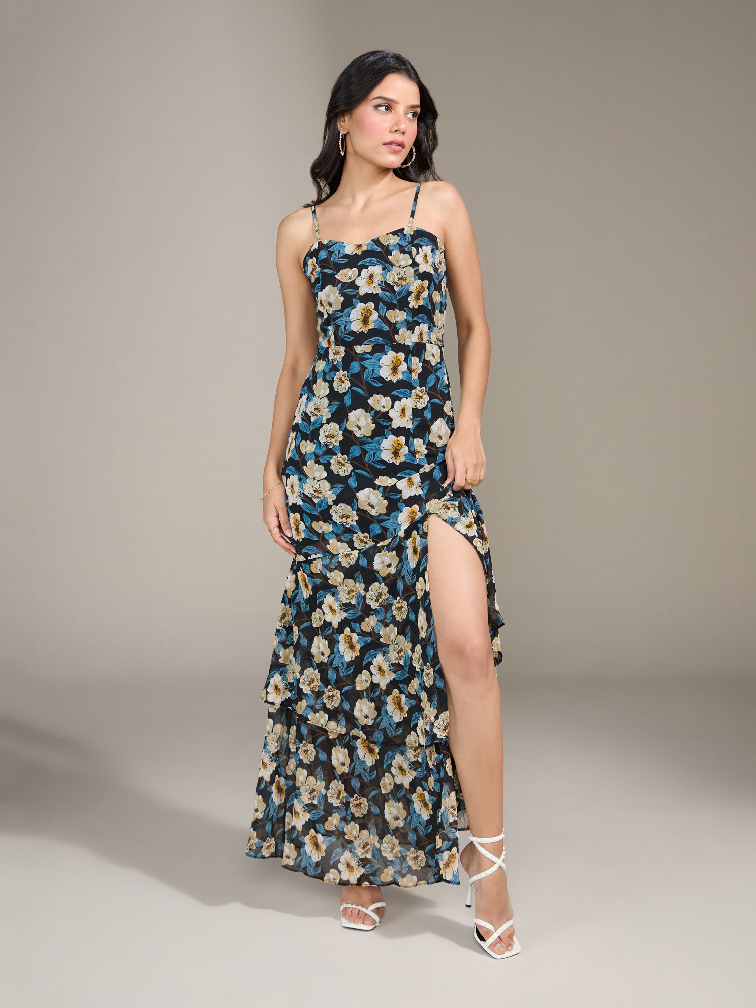 This is a floral printed maxi dress crafted in polyester georgette and has a polyester knit lining inside. It is fit and flare silhouette which features a slit on the front left side, adjustable shoulder straps, sweetheart neckline, two tiered layers at hem for style and a centre back concealed zip for closure....