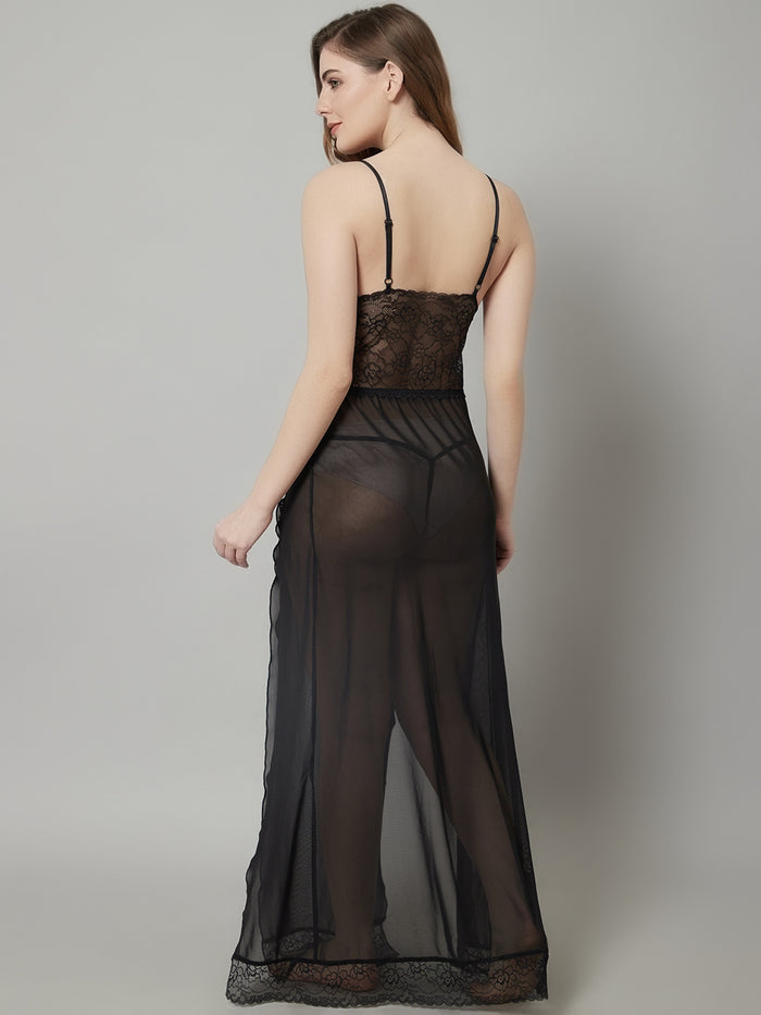 OVERALL NET WITH LACE STEAMY LONG GOWN WITH GLOVES- BLACK
