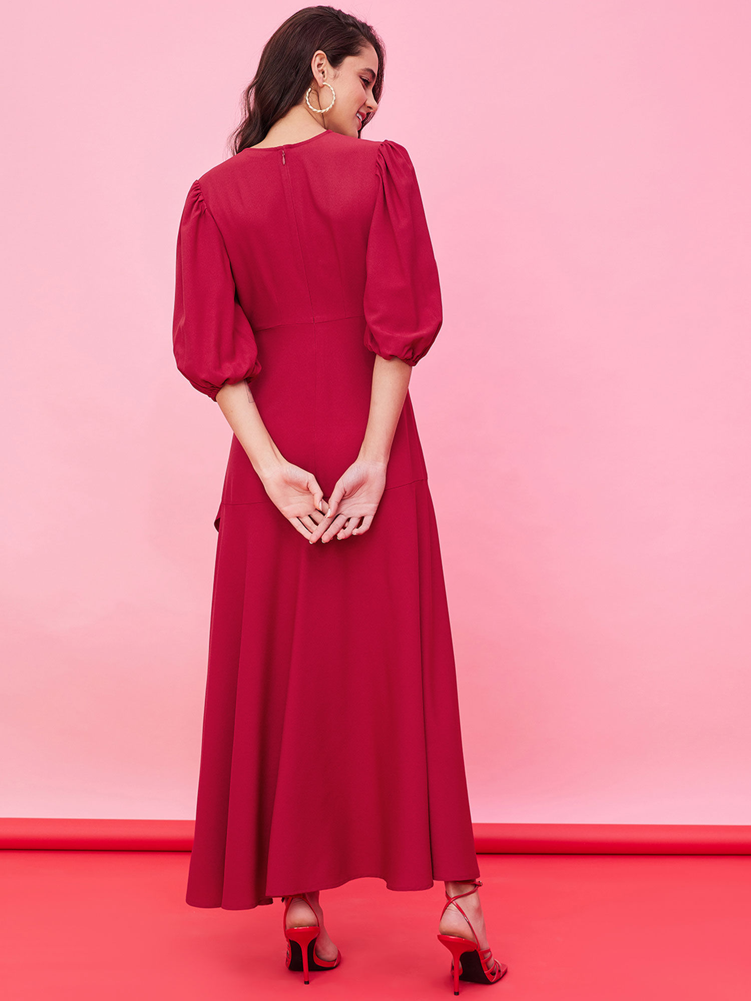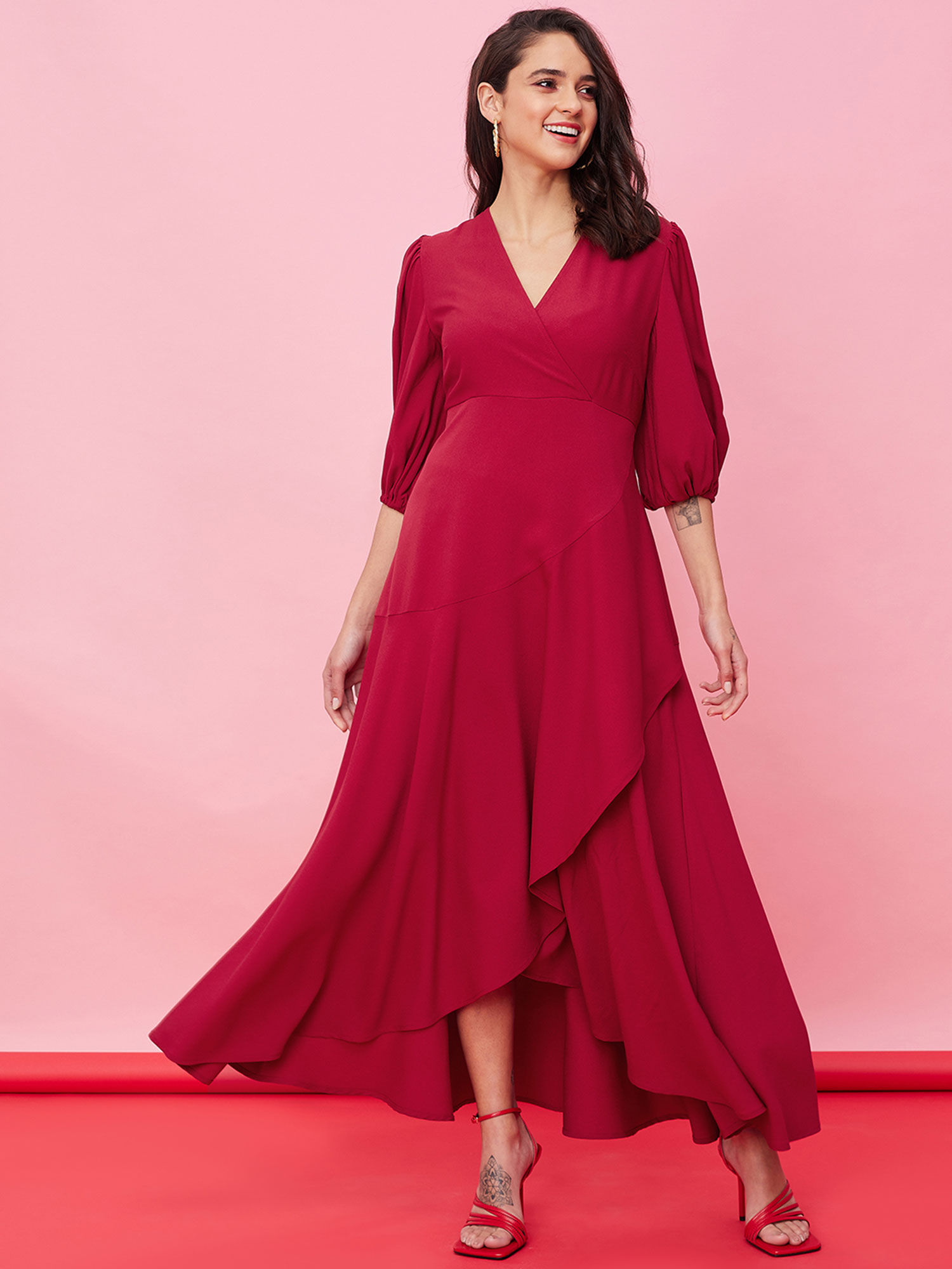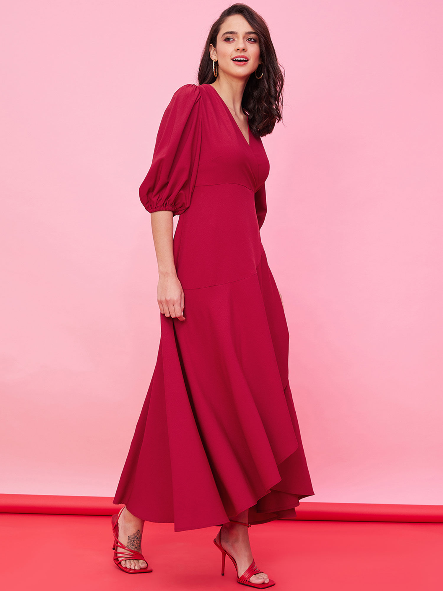 Made of China moss- V-Neck- Elbow Length Sleeves- Puff Sleeves- Solid- Regular Fit- Formal- Wrap style- Elasticated sleeve ends- Maxi Length- High-Low Hemline- Solid- No pockets...