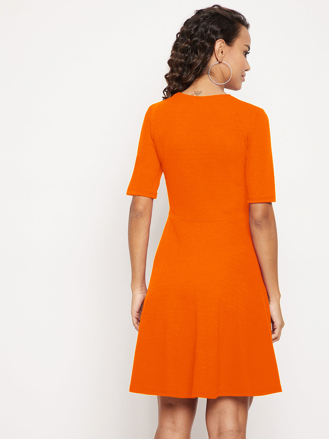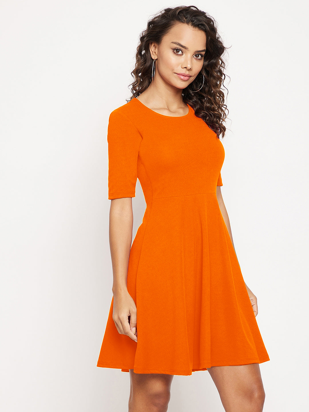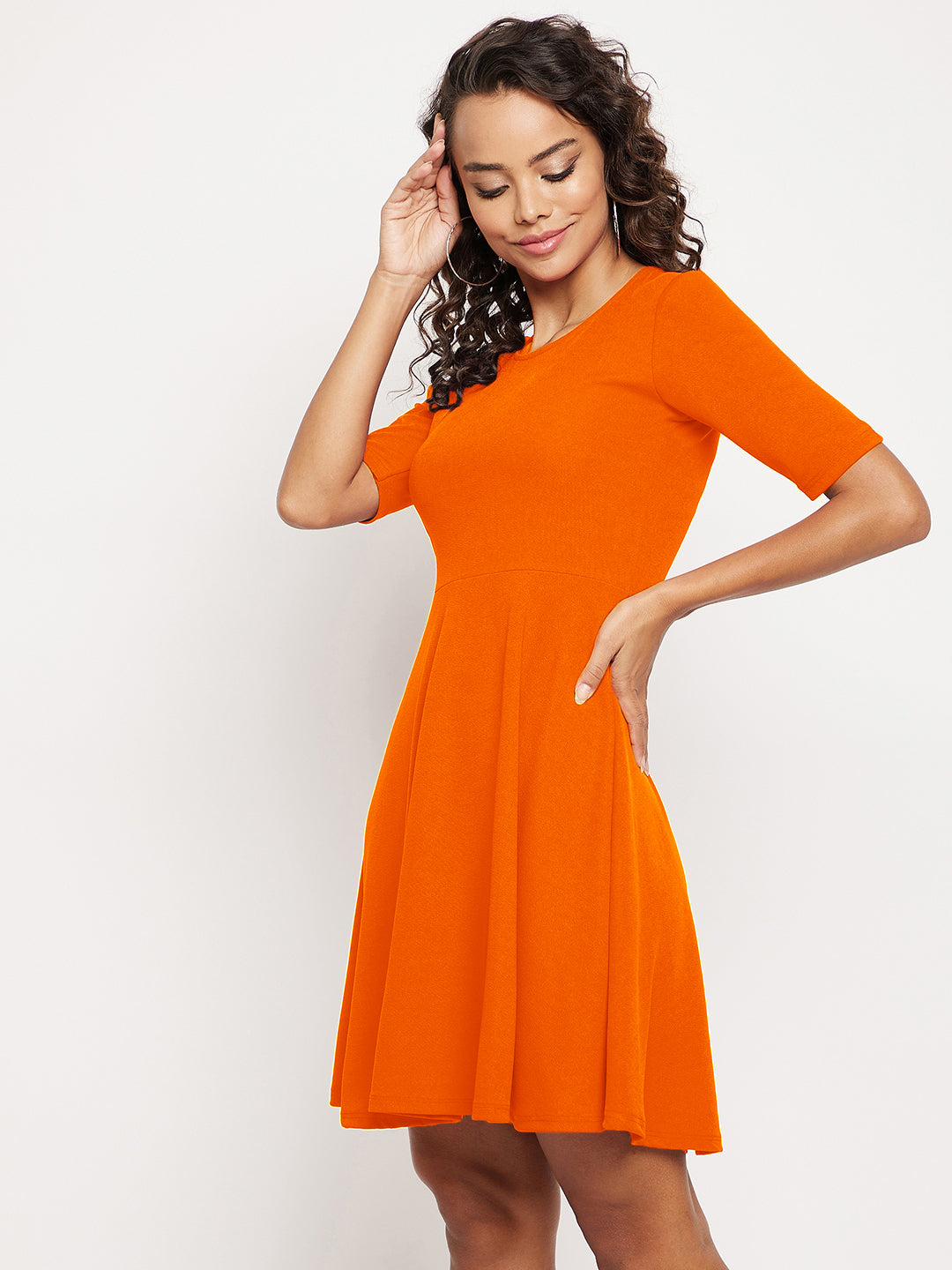 Round neck fit and flare skater dress in stretchable soft fabric with 3/4th sleeves. The silhouette of the dress is very flattering and perfect for the Indian body type. No underwear lines will show in this dress and it is super comfortable and easy to wear. It is a basic dress which will become your wardrobe staple and can be worn from day to night....