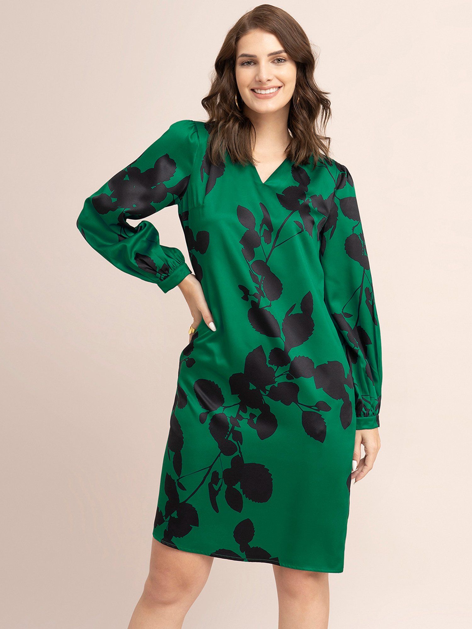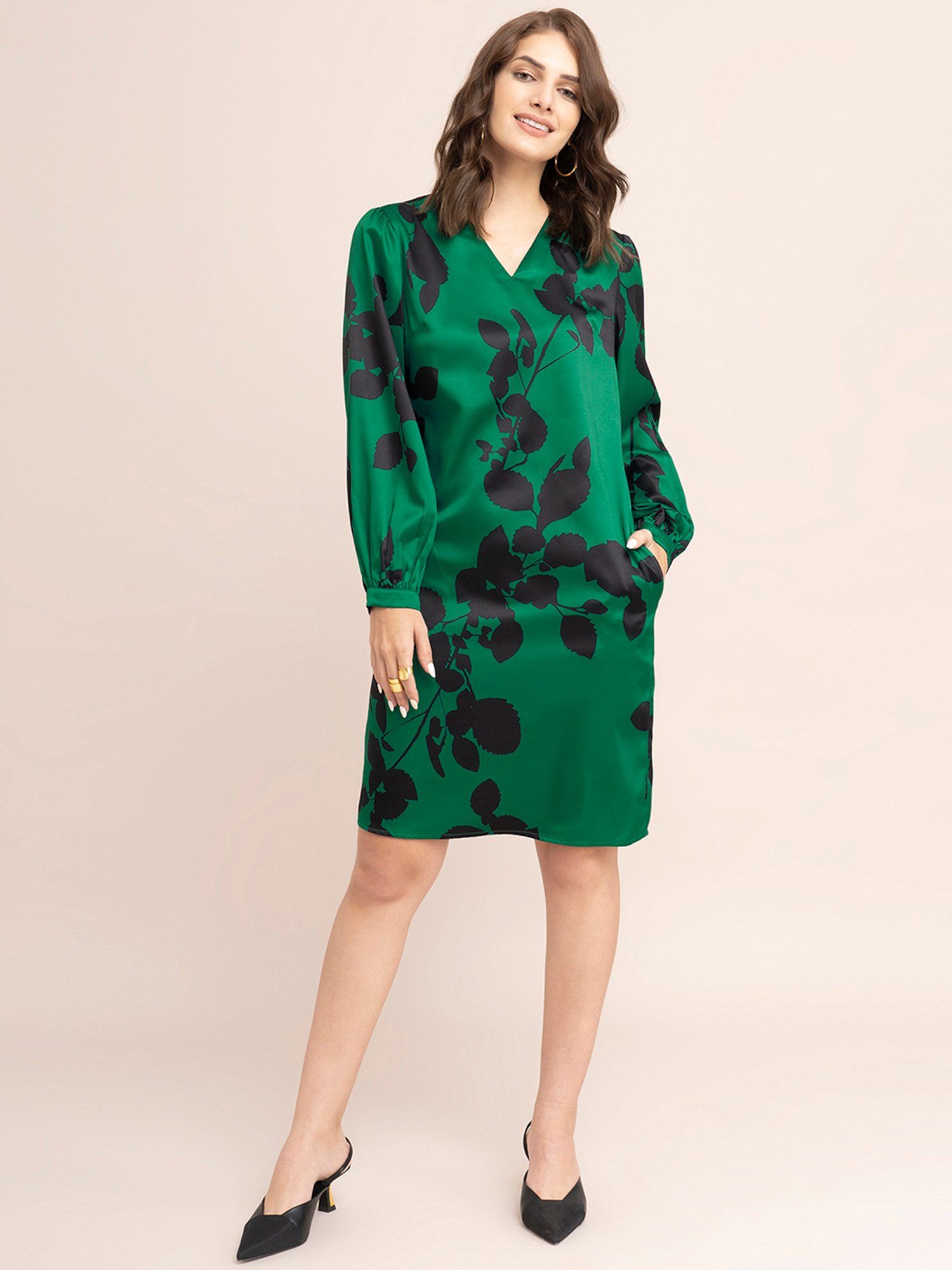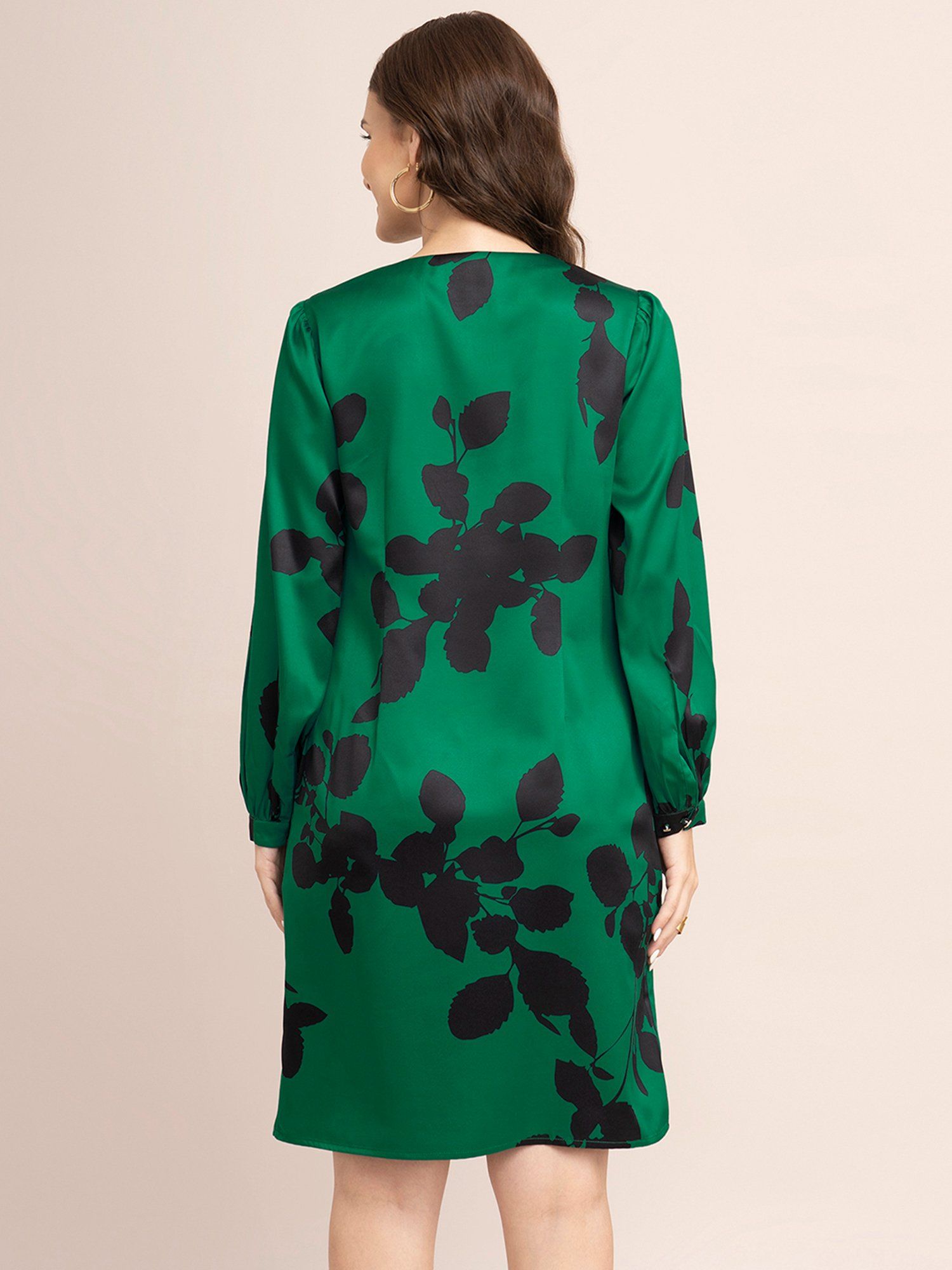 999-1739 [Color = Green ] [Size = XS, M, L, XL, 2XL] Satin Floral Print Shift Dress - Green And Black ... ...