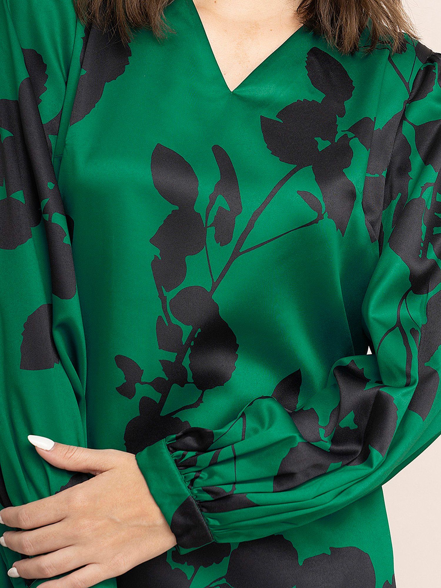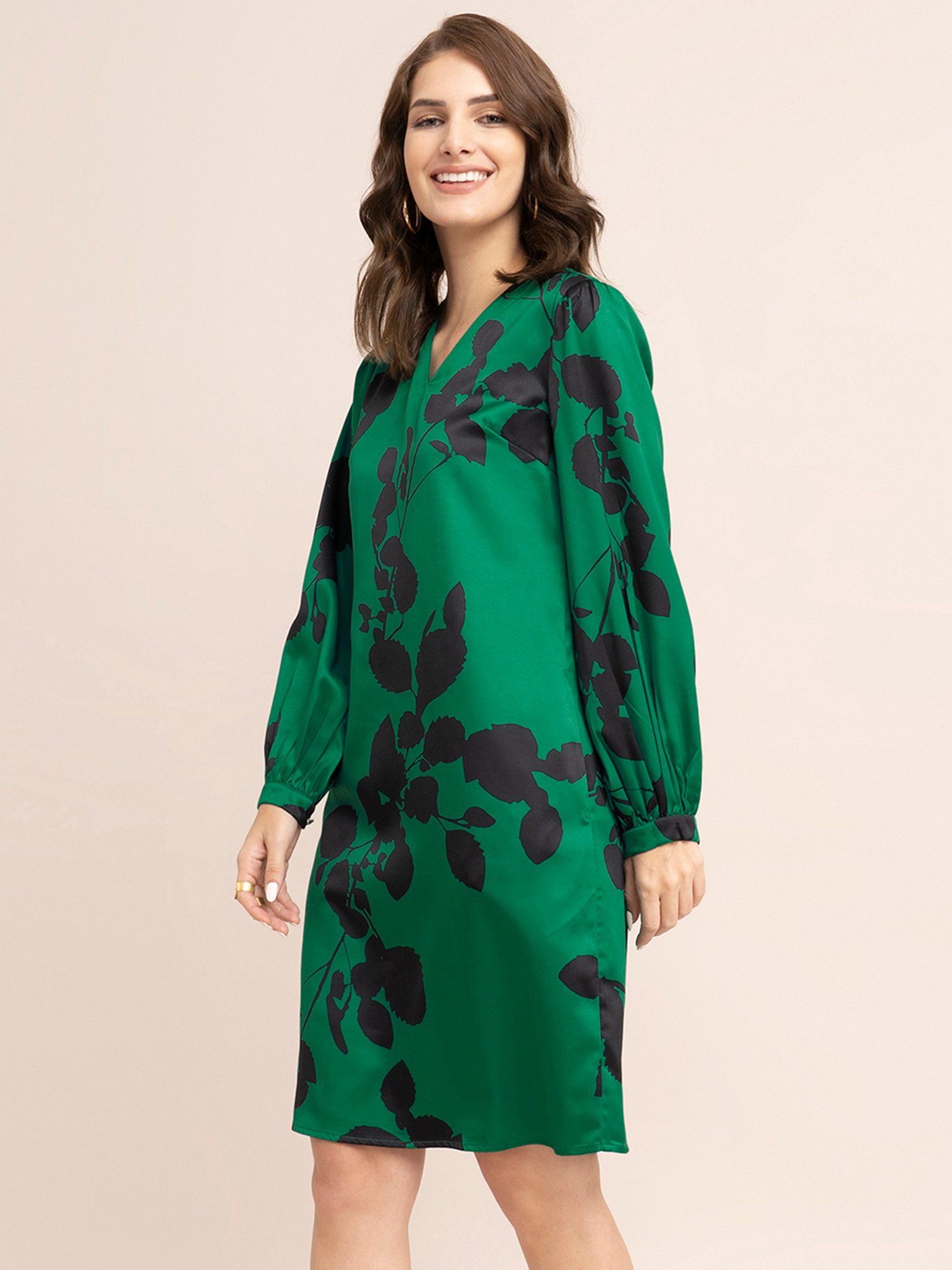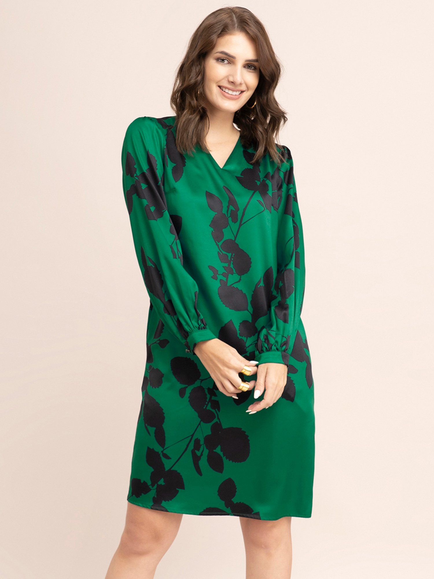 999-1739 [Color = Green ] [Size = XS, M, L, XL, 2XL] Satin Floral Print Shift Dress - Green And Black ... ...