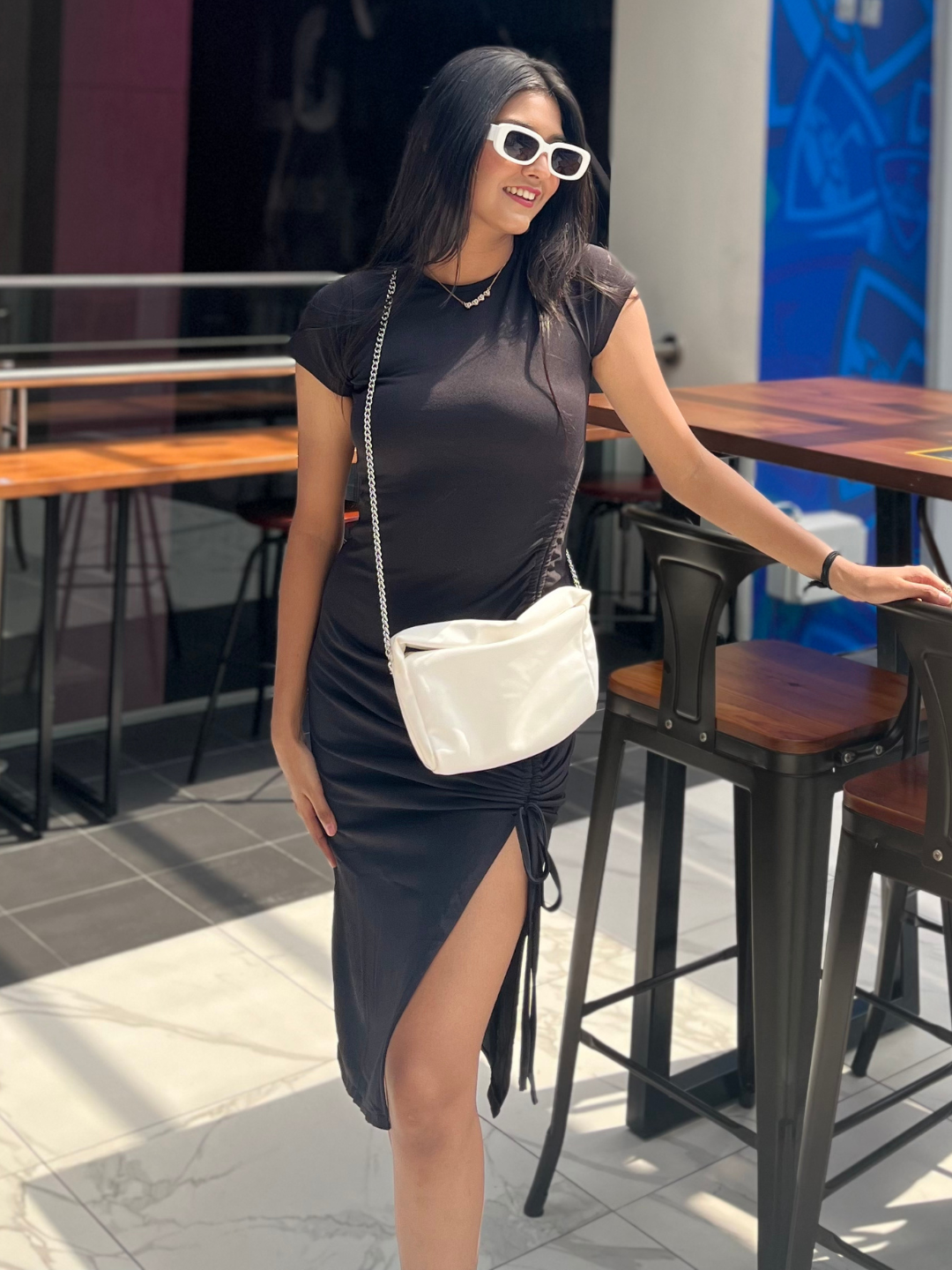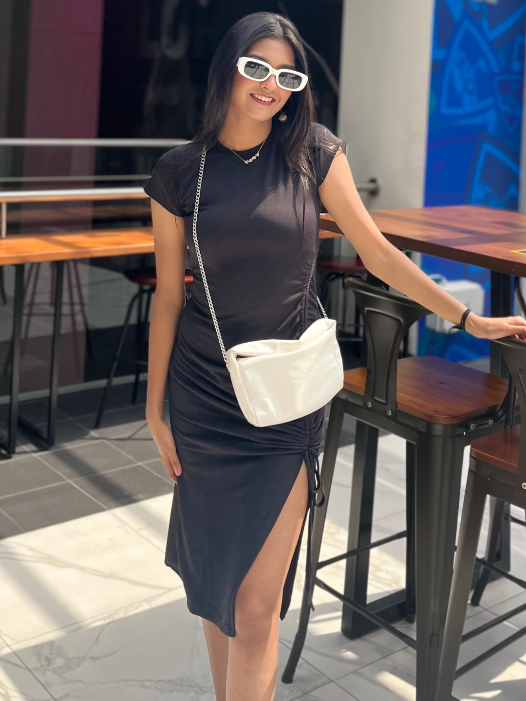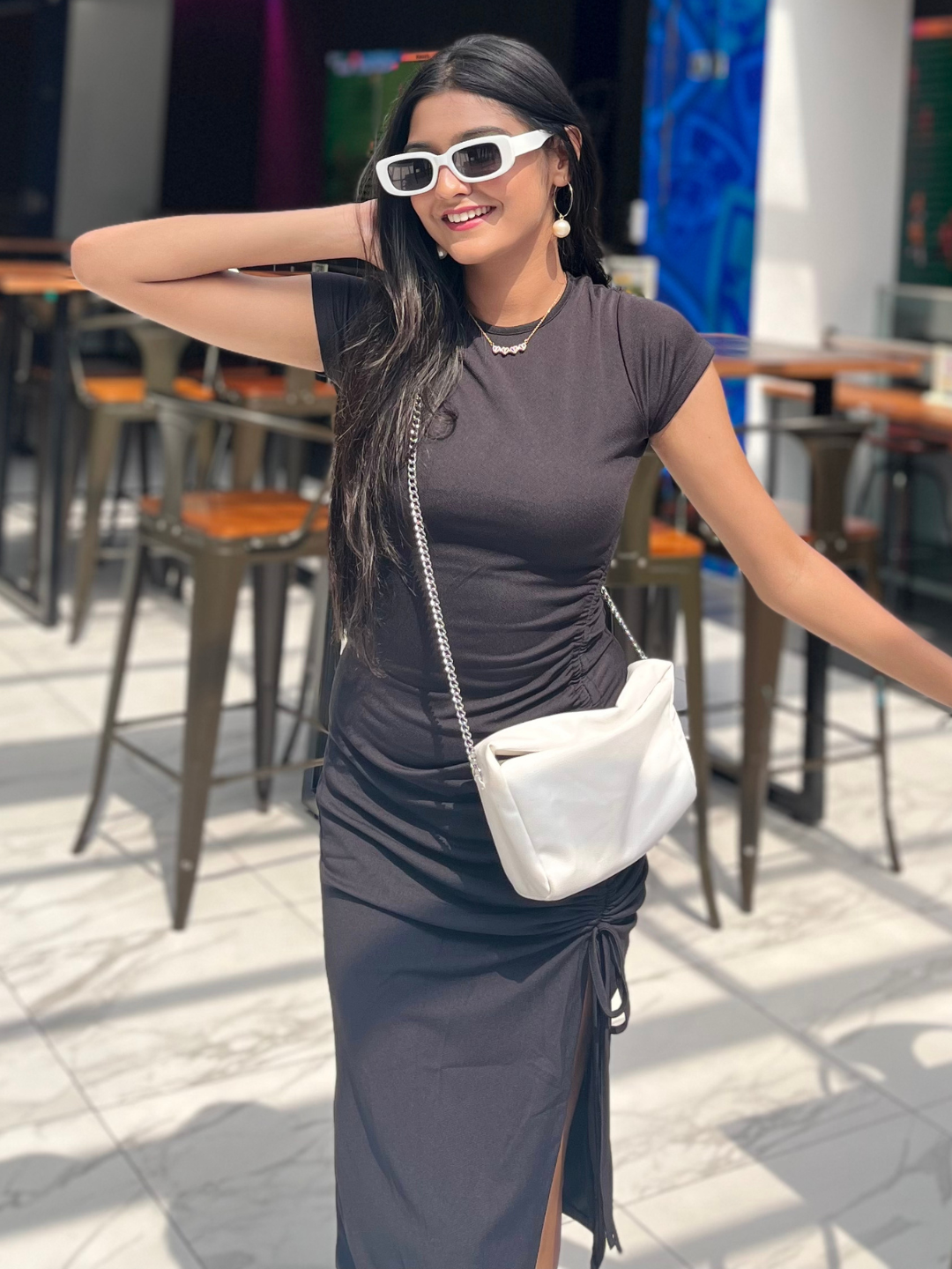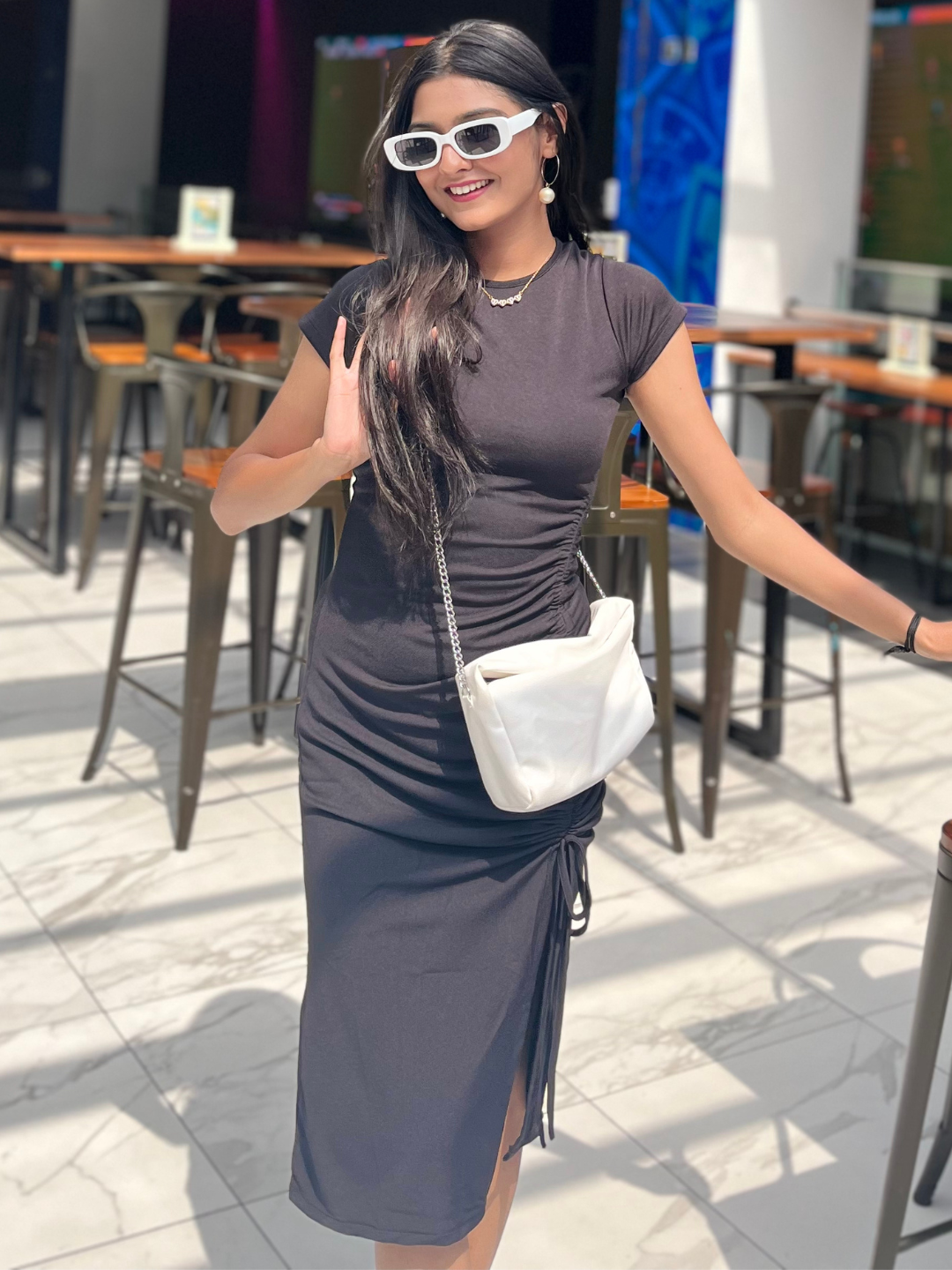 High neck drawstring bodycon dress in super soft stretchable cotton fabric. The silhouette of the dress is very flattering and perfect for the Indian body type. No underwear lines will show in this dress and it is super comfortable and easy to wear.It is a basic dress which will become your wardrobe staple and can be worn from day to night...