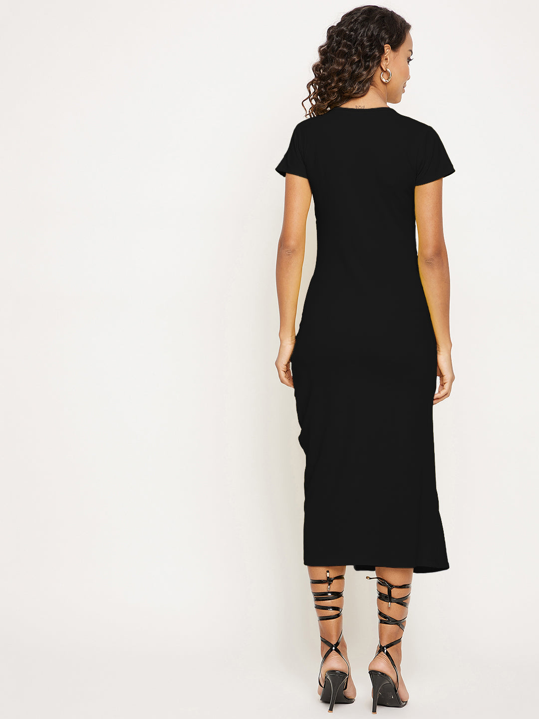 423-1288 [Color = Black ] [Size = XS, S, M, L, XL, 2XL] High neck drawstring bodycon dress in super ...