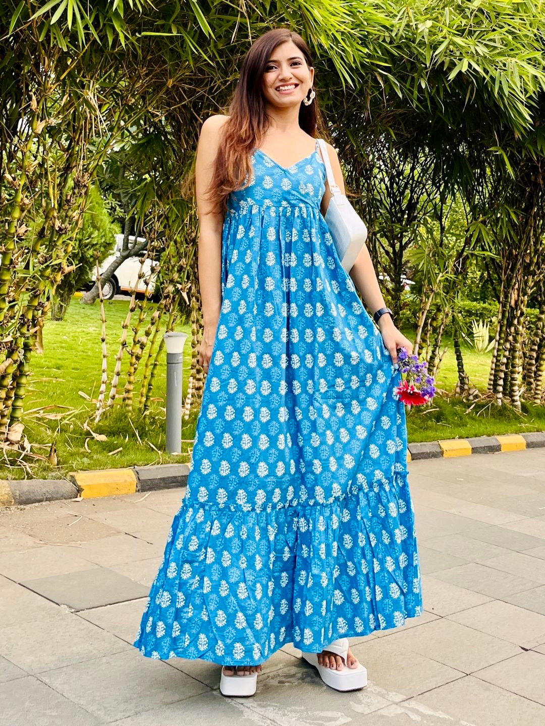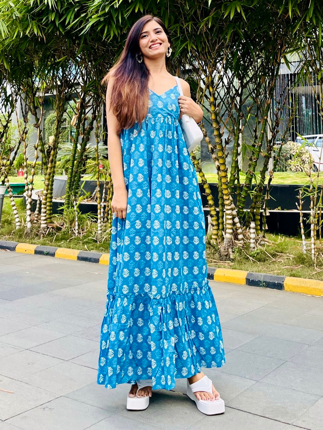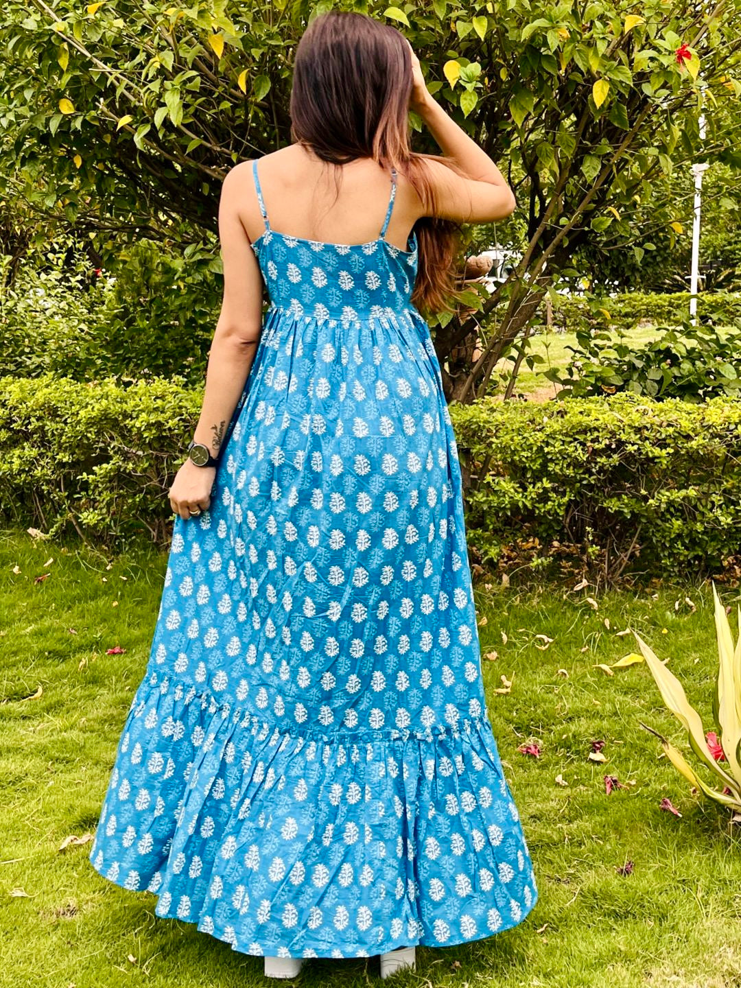 467-1380 [Color = Blue Ethnic Print ] [Size = XS, S, M, L, XL, 2XL] Feel glamorous and chic in this cotton Tiered M...