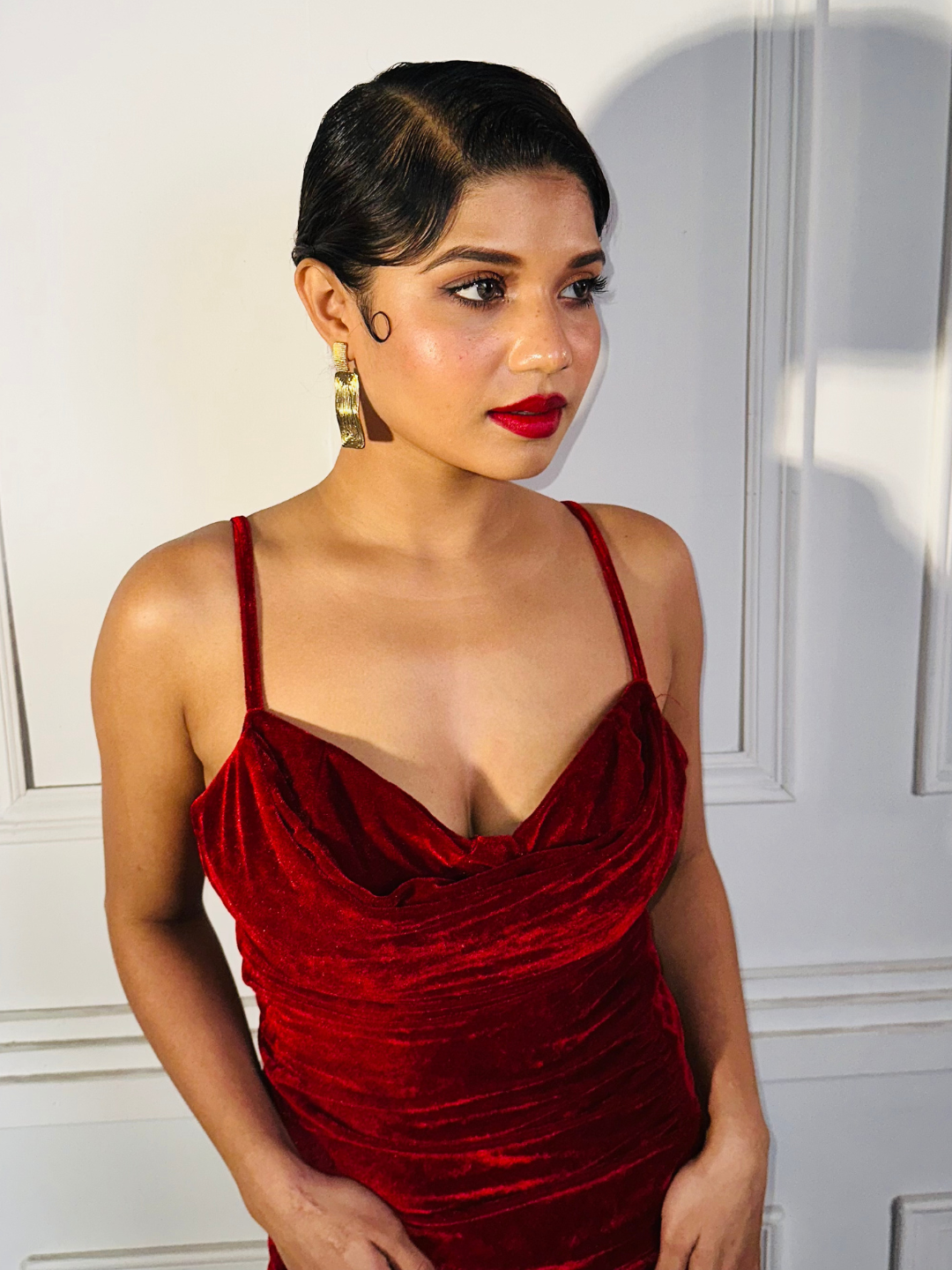 This bodycon dress is sure to make heads turn! With a cowl neck detailing, thin straps and the perfect midi length, it is oh so trendy. The high slit is adjustable so go as high or low as you want! The drawstring allows you to adjust the fit, The silhouette of the dress is very flattering....