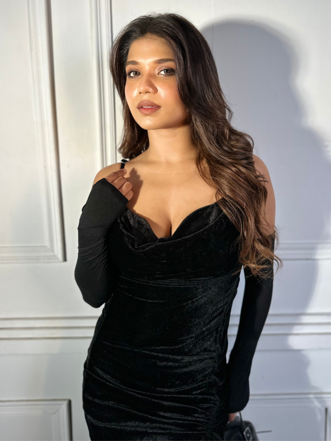 412-1180 [Color = Black Velvet ] [Size = XS, S, M, L, XL, 2XL] This bodycon dress is sure to make heads turn! With a c...
