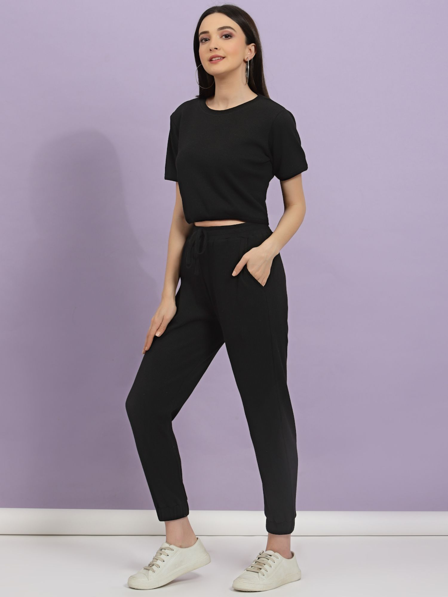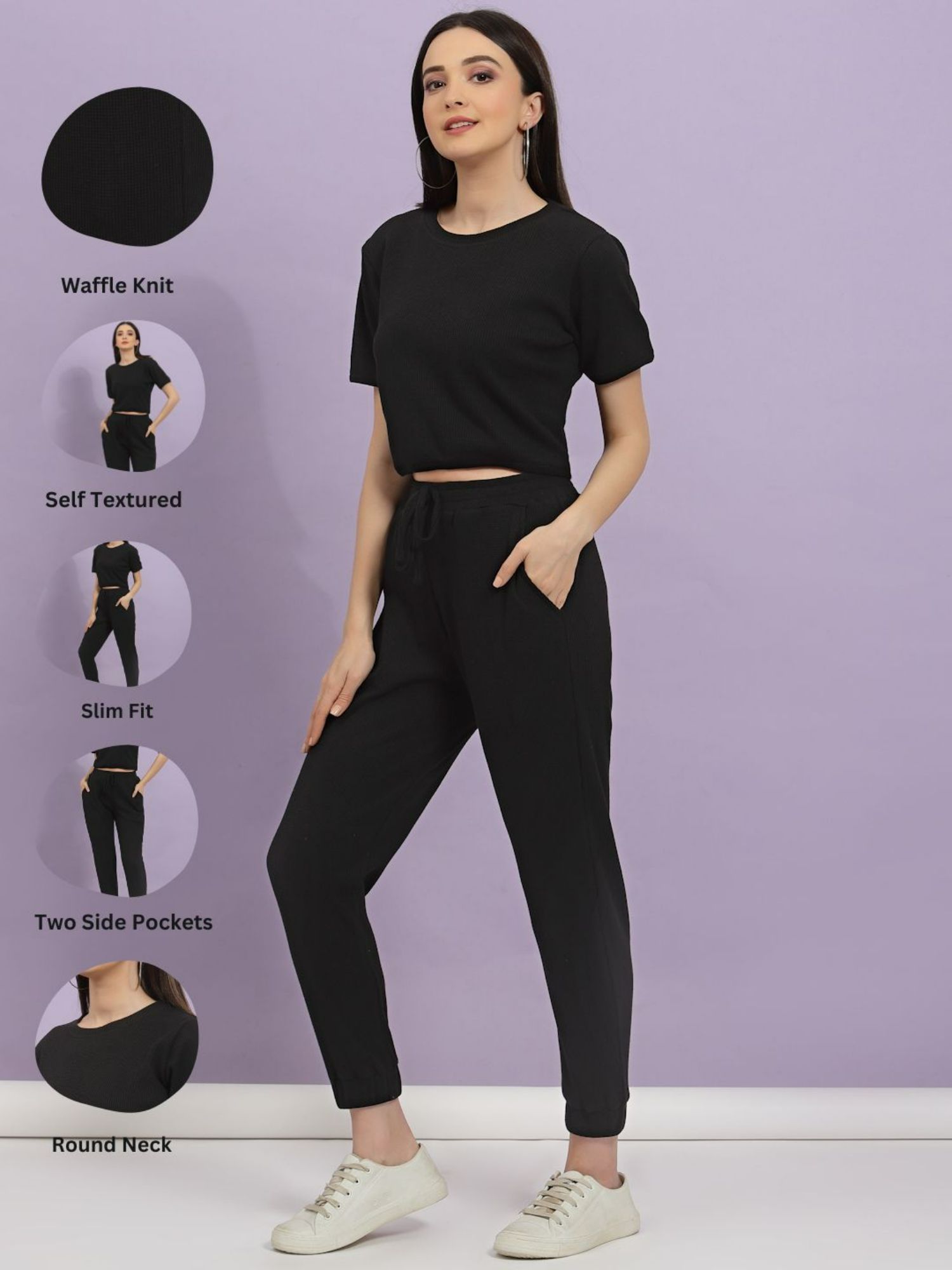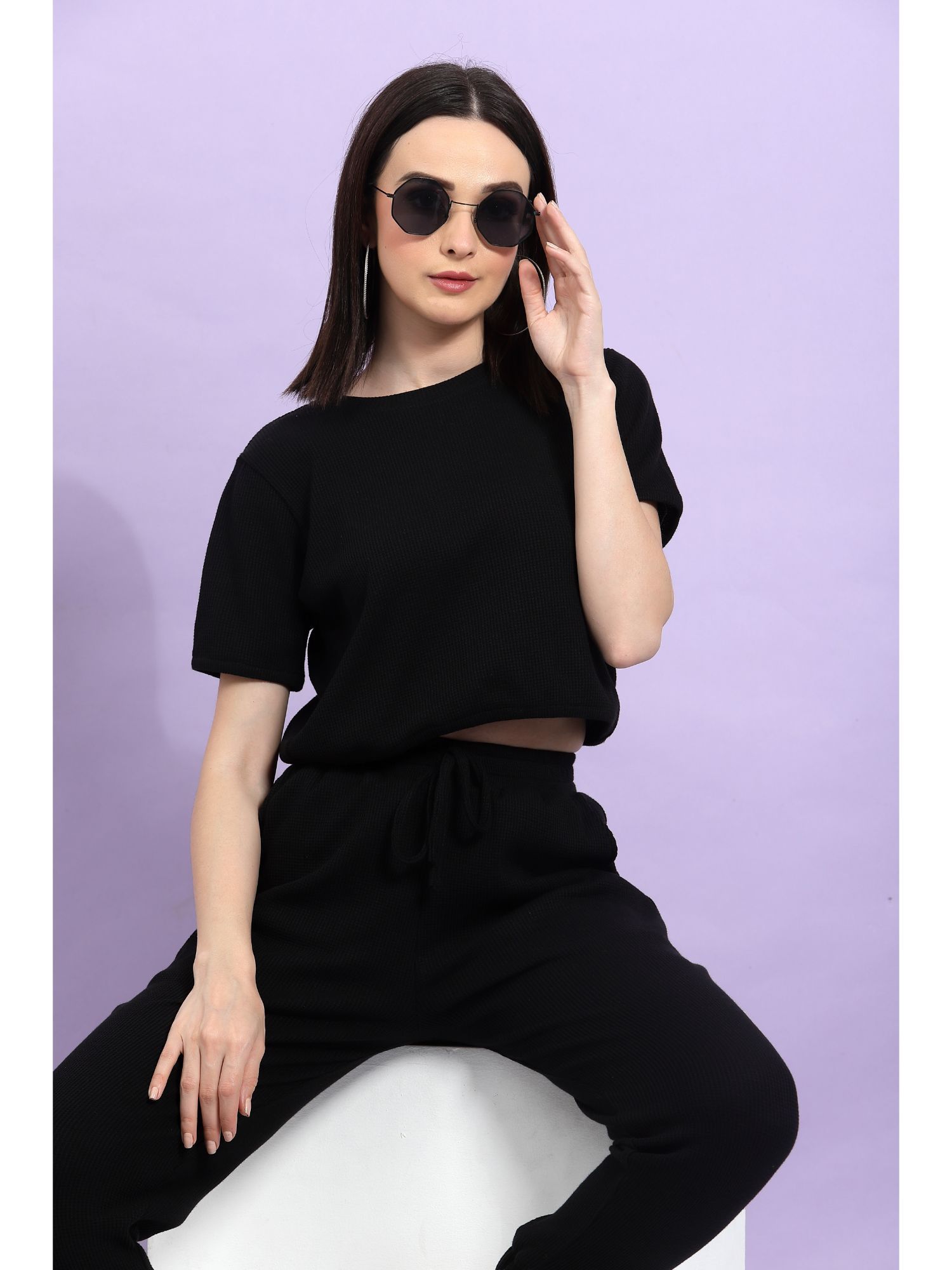 Give your wardrobe a fashionable spin with this black co-ord set. Crafted from high-quality cotton, this co-ord set is designed with half sleeves and a round neck. Team it up with a pair of heels and dainty earrings to garner all the attention....