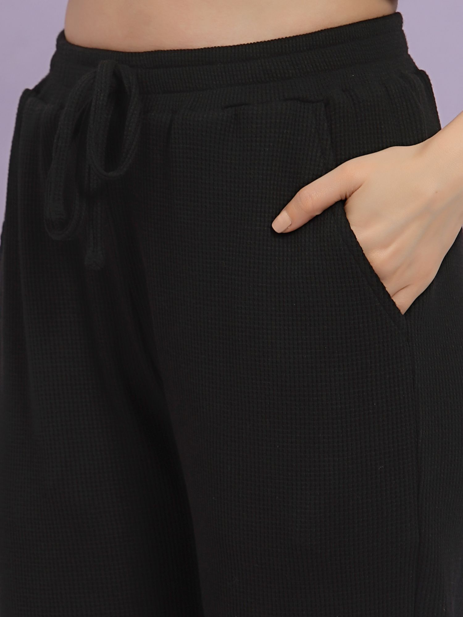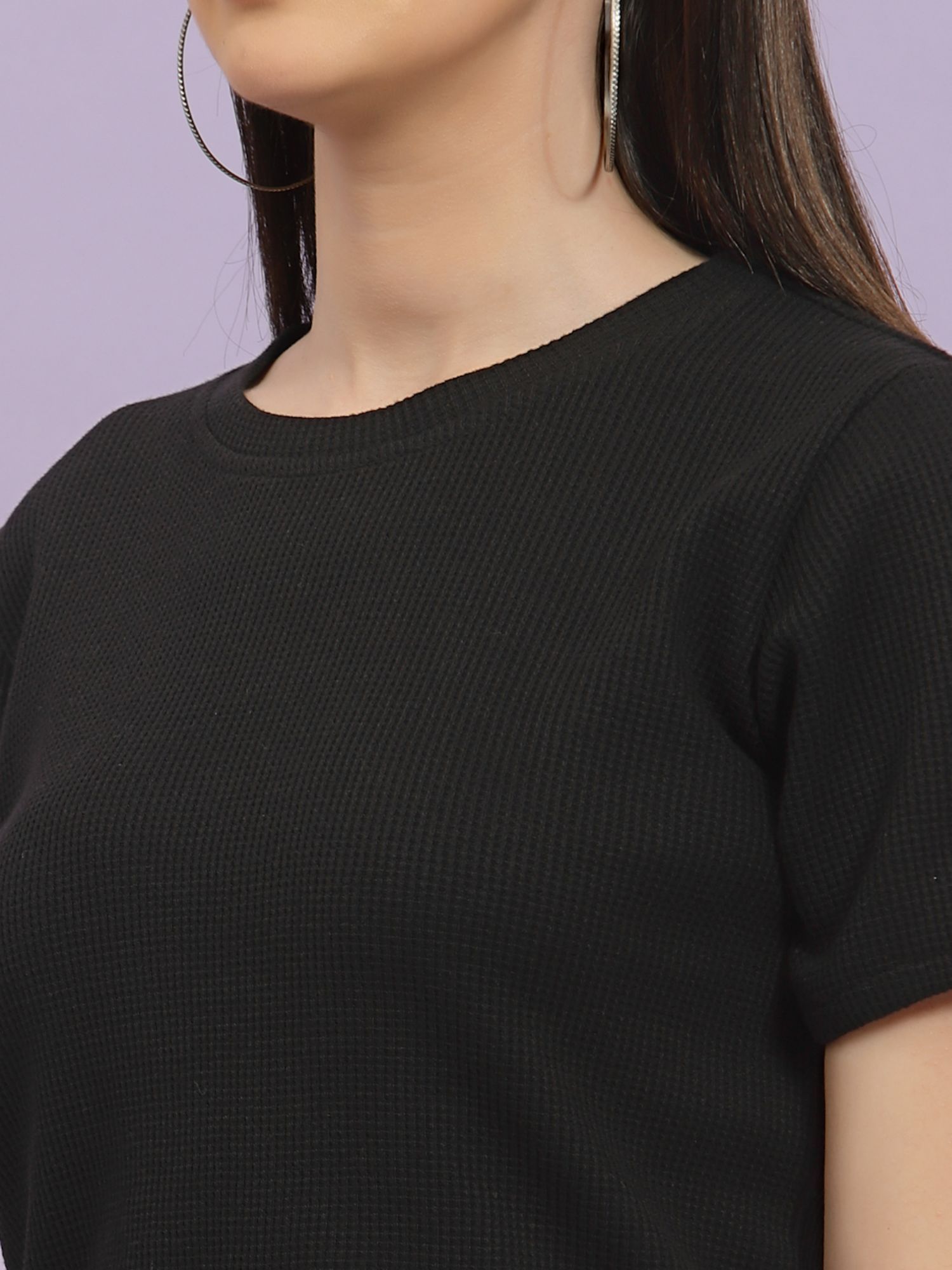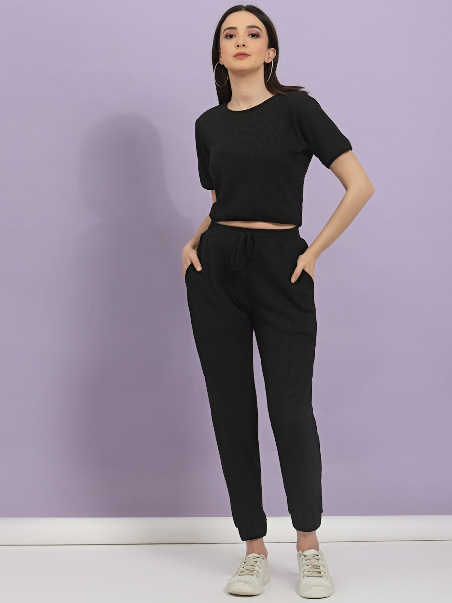 Give your wardrobe a fashionable spin with this black co-ord set. Crafted from high-quality cotton, this co-ord set is designed with half sleeves and a round neck. Team it up with a pair of heels and dainty earrings to garner all the attention....