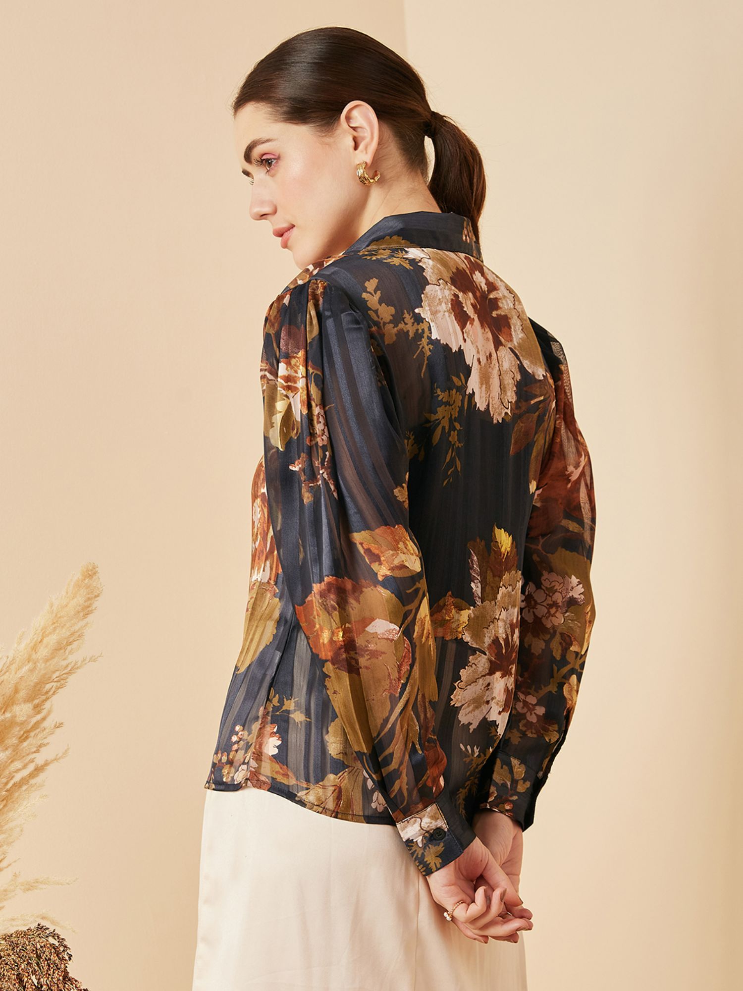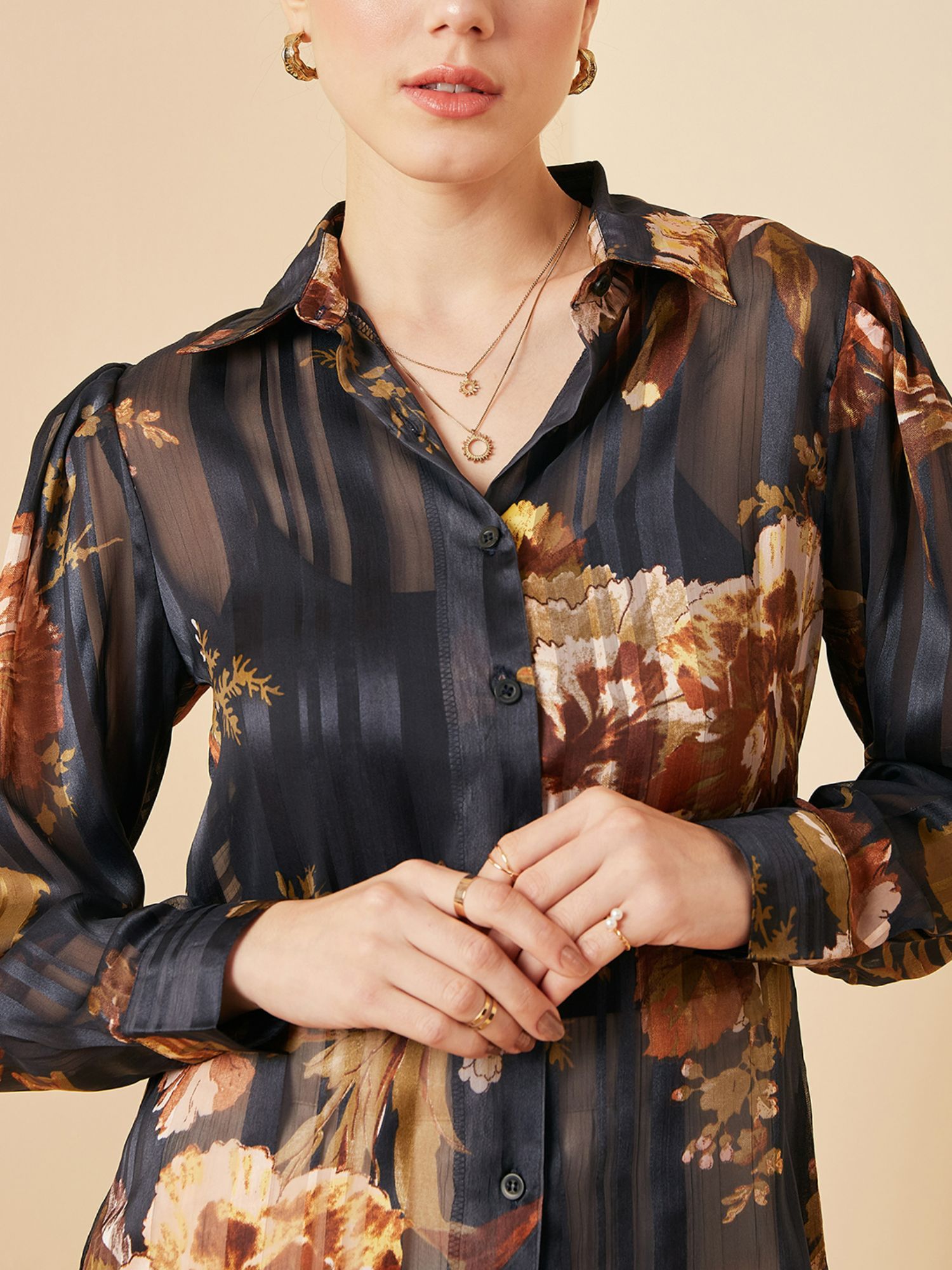 283-799 [Color = Blue ] [Size = XS, S, M, L, XL, 2XL] blue floral print opaque casual shirt, has a spread c...