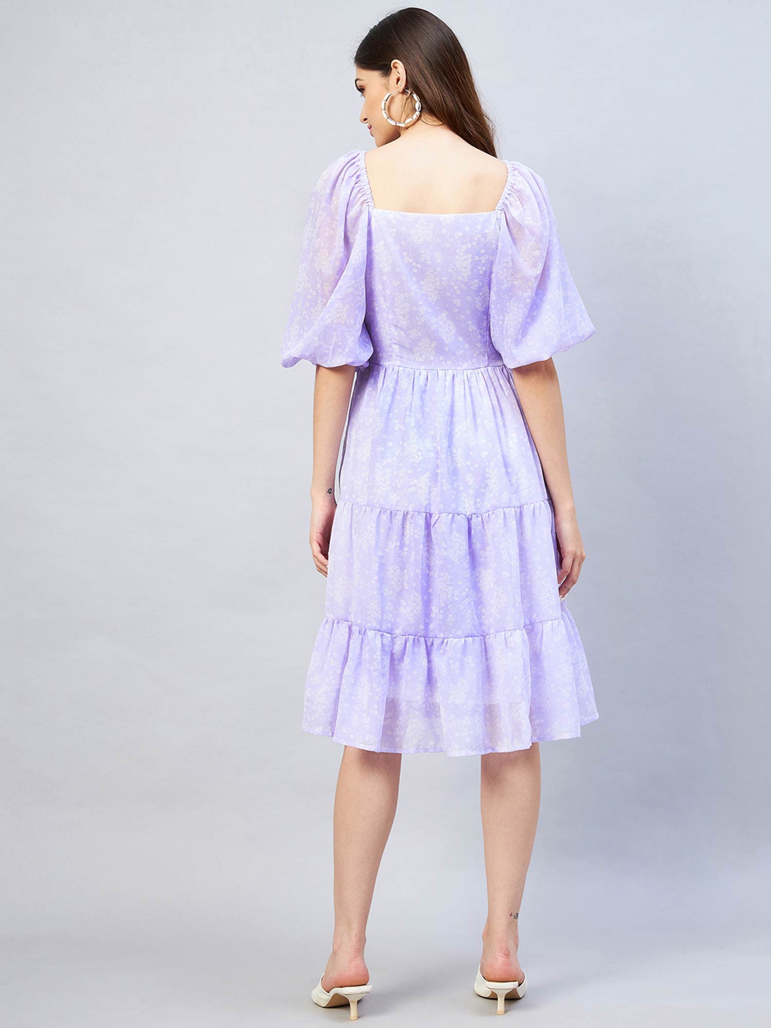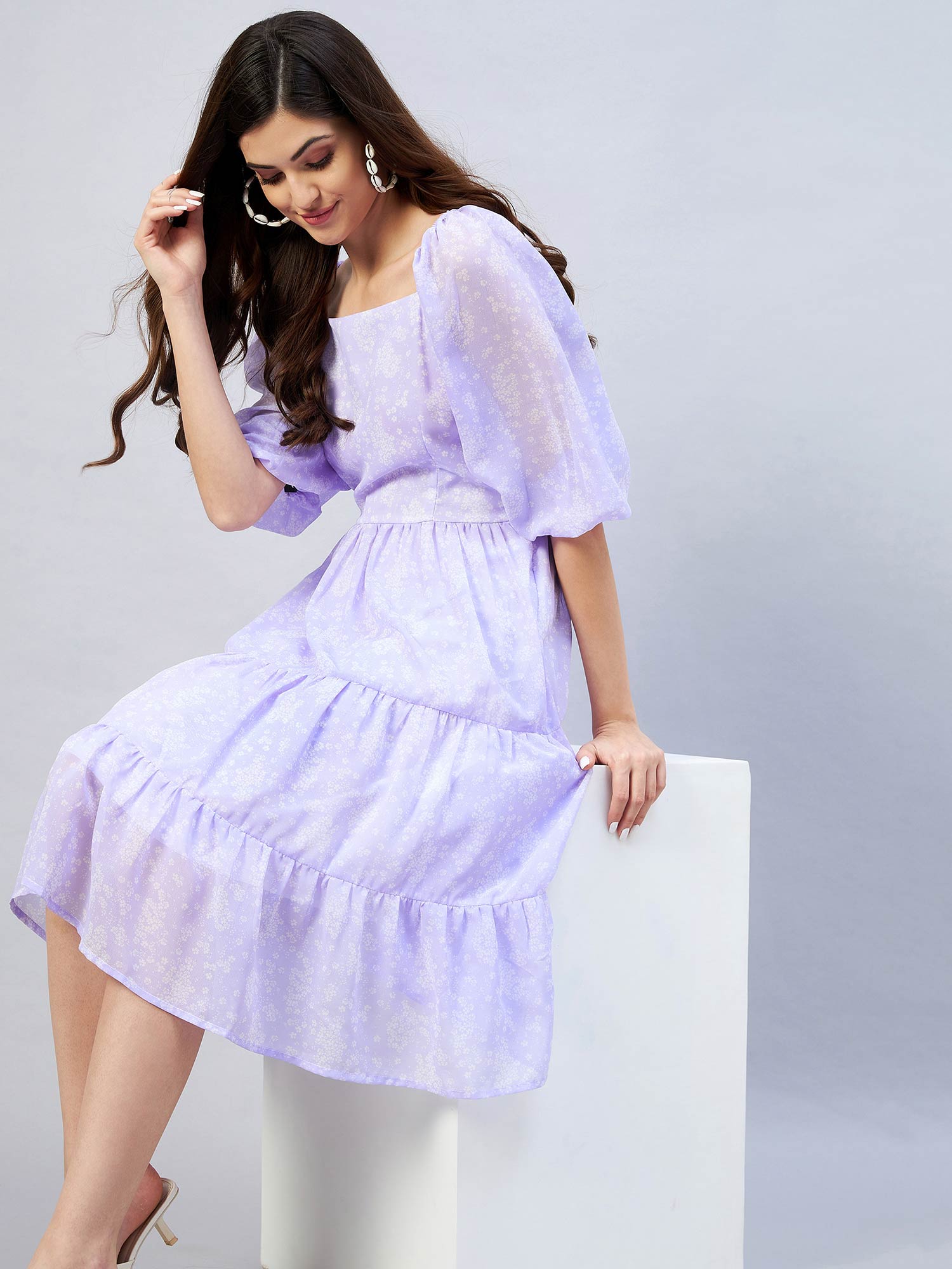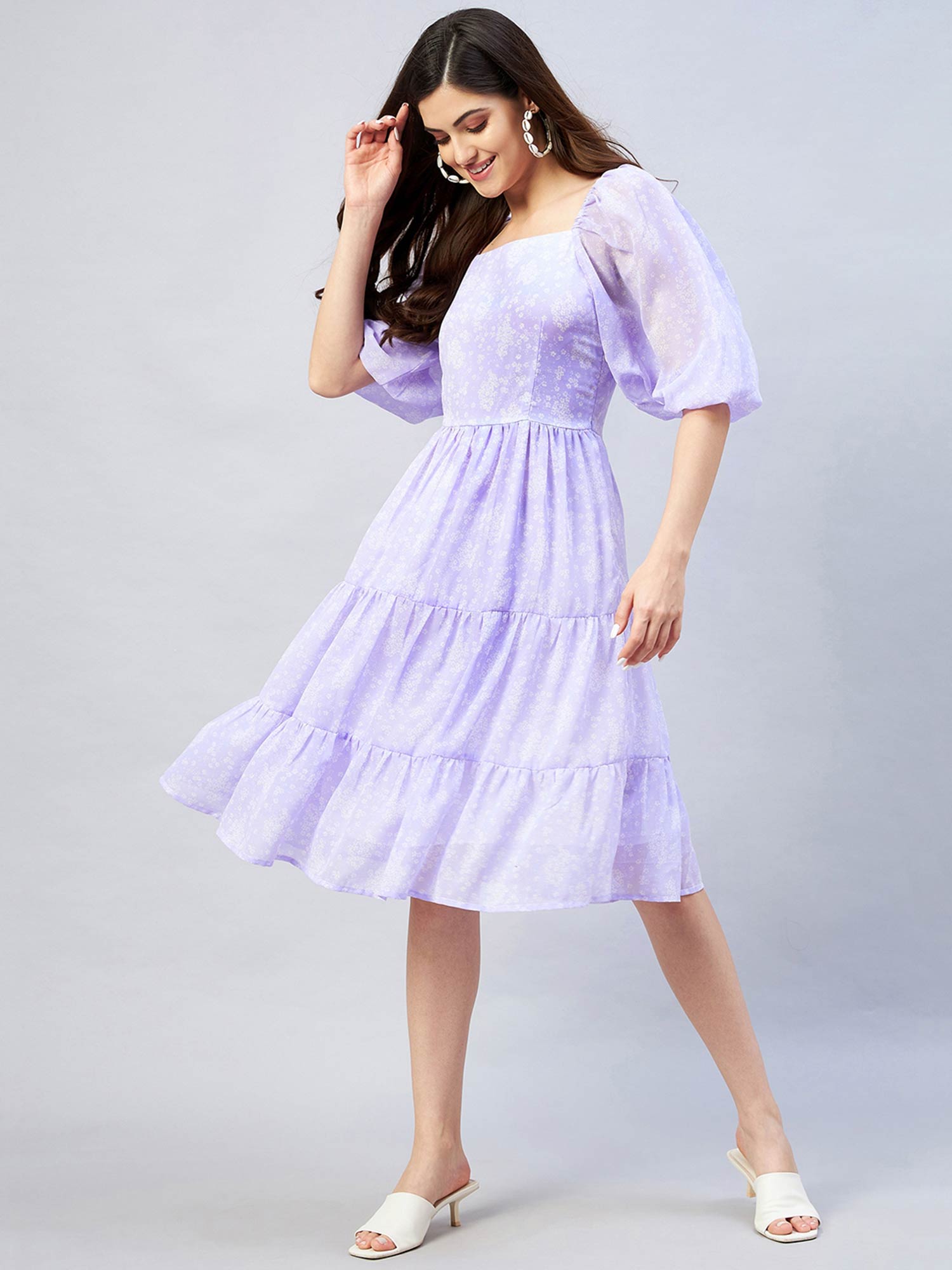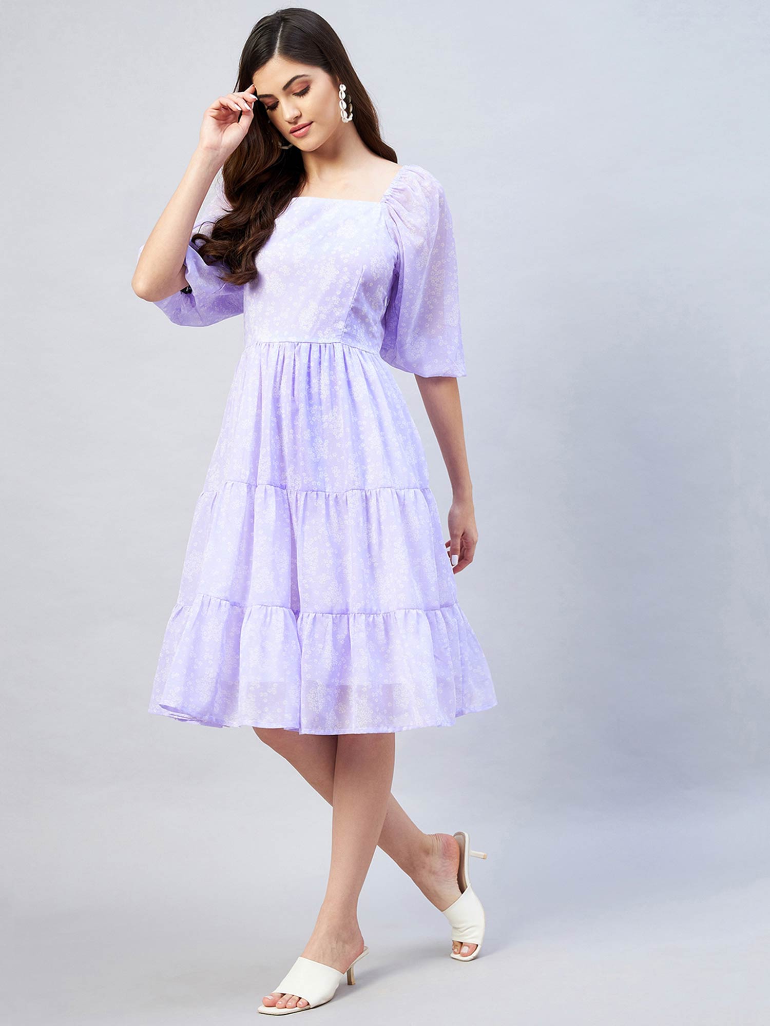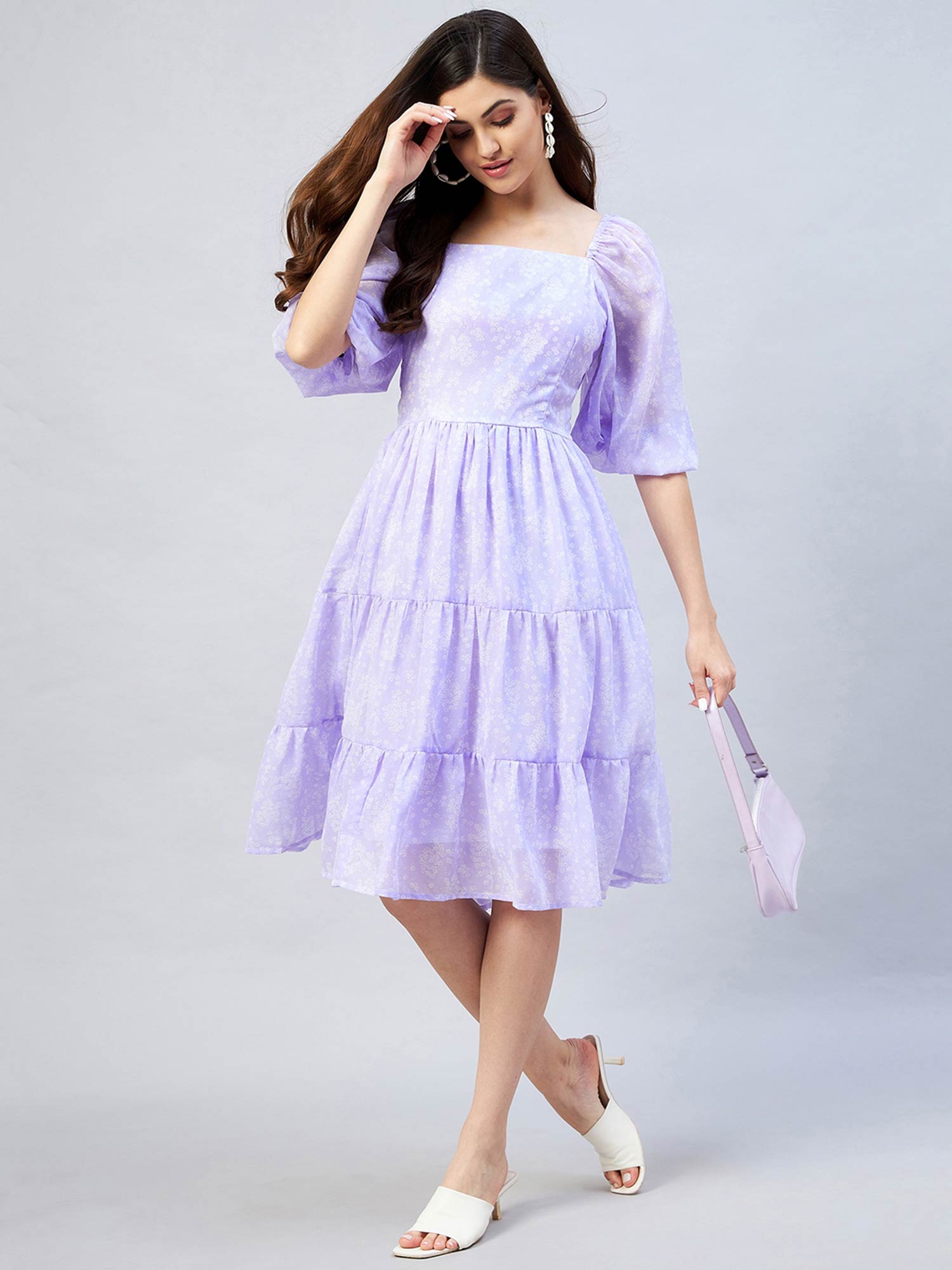 350-980 [Color = Lavender] [Size = S, M, L, XL] lavender color knee length floral has a square neck fit and flare dress... ...