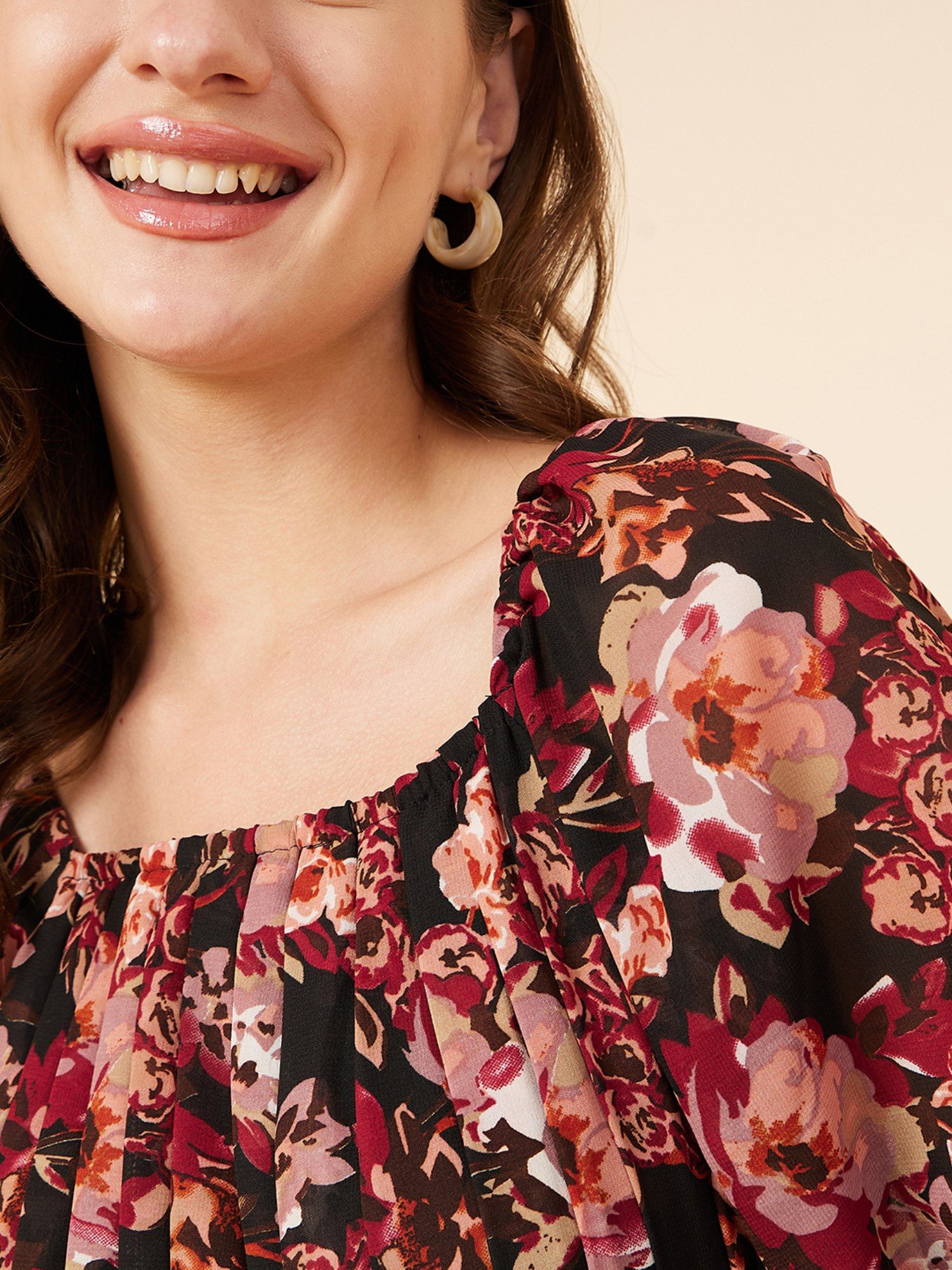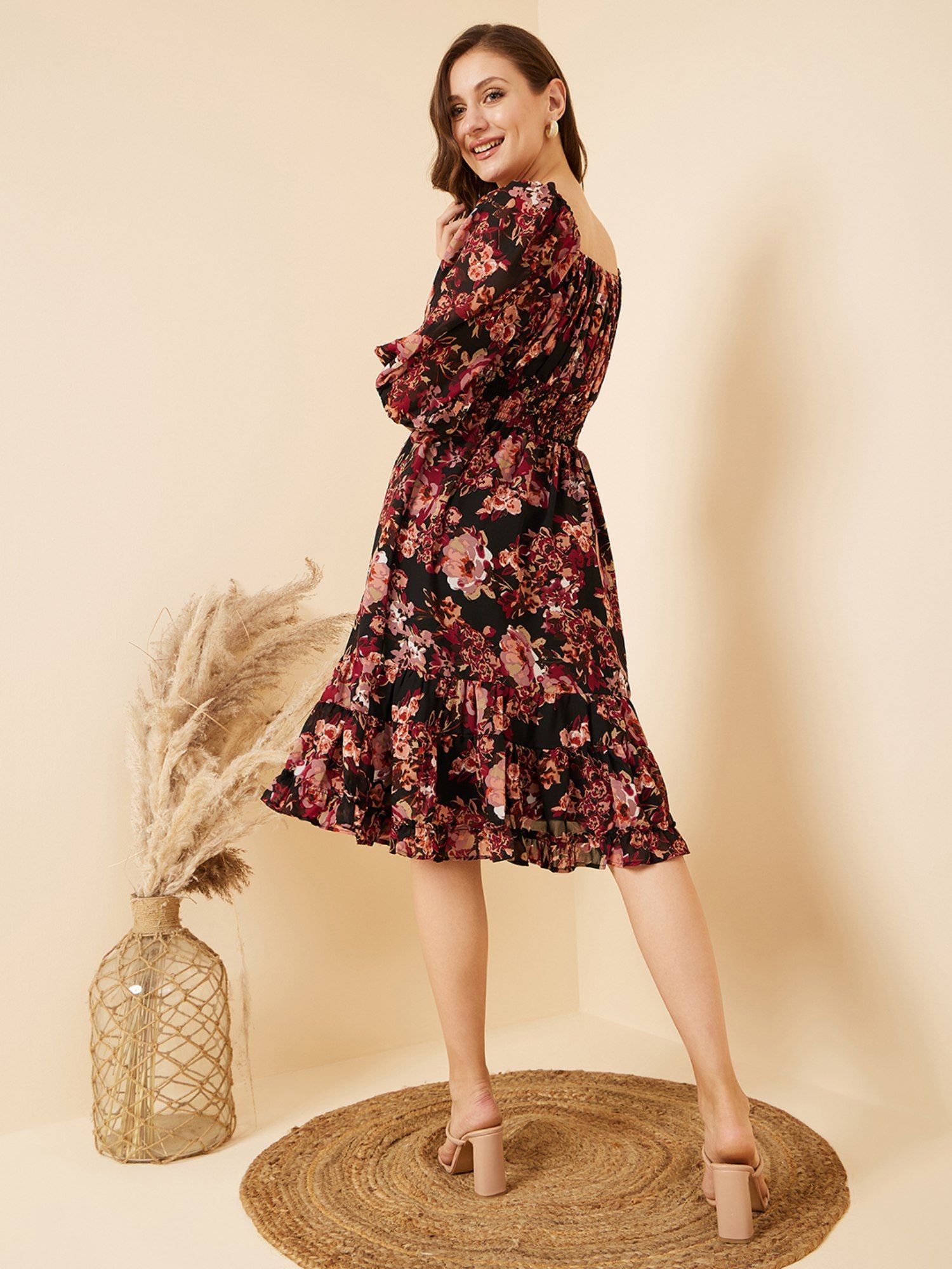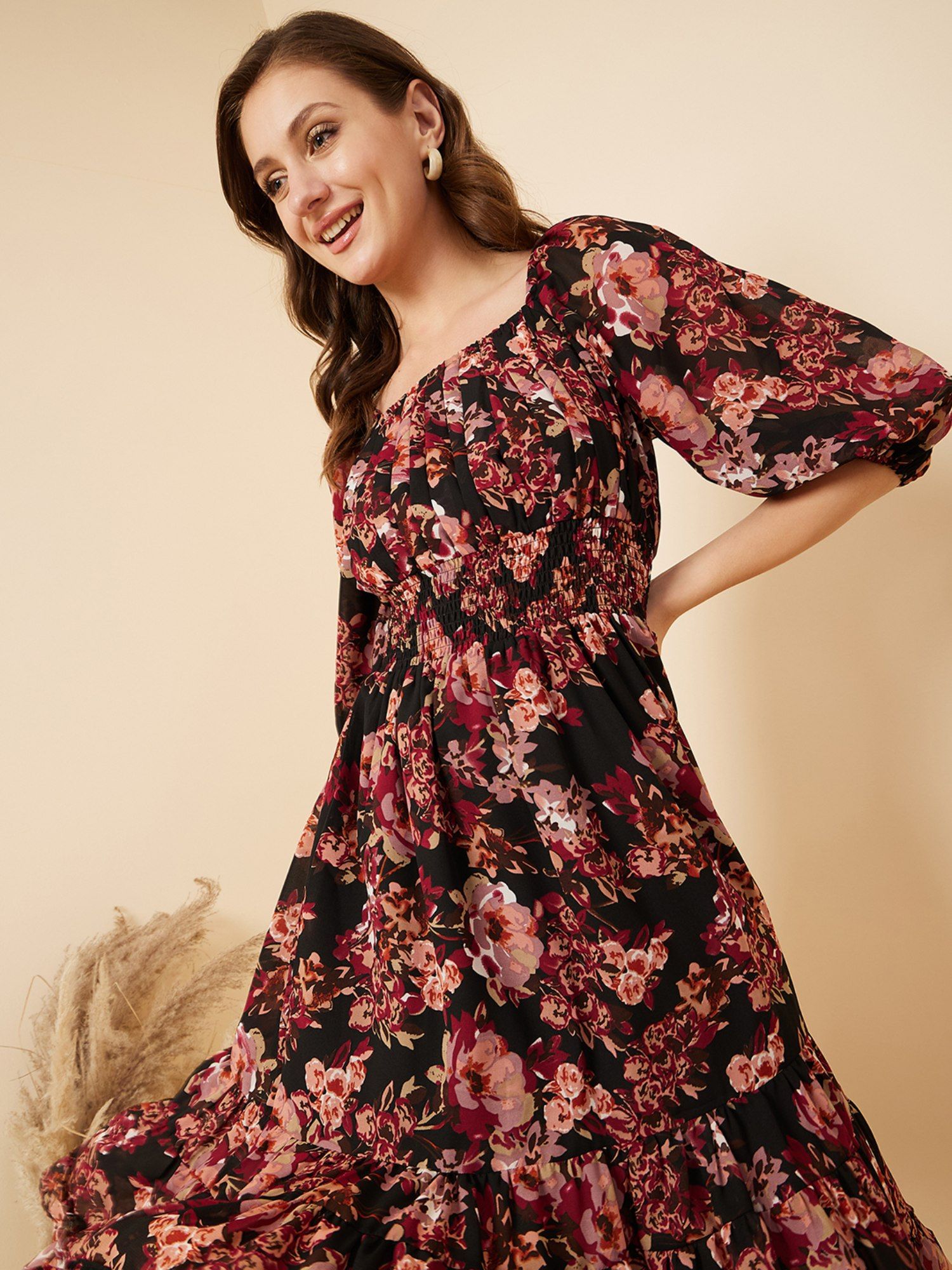floral midi fit and flare dress, has a square neck, three-quarter sleeves, puff sleeves, flared hem. It is sure to fetch you compliments from all. Join the league of fashion elites flaunting the staple....