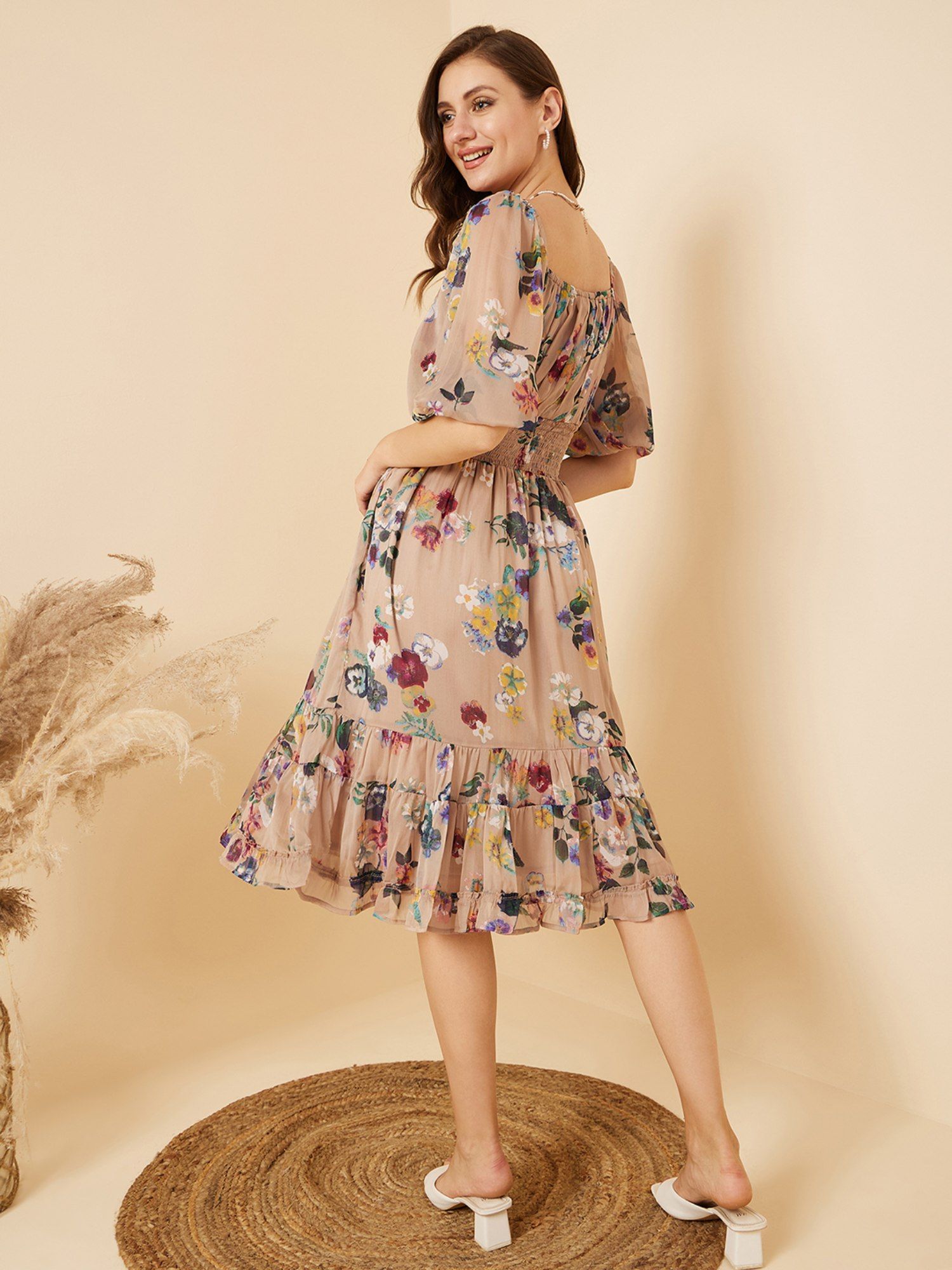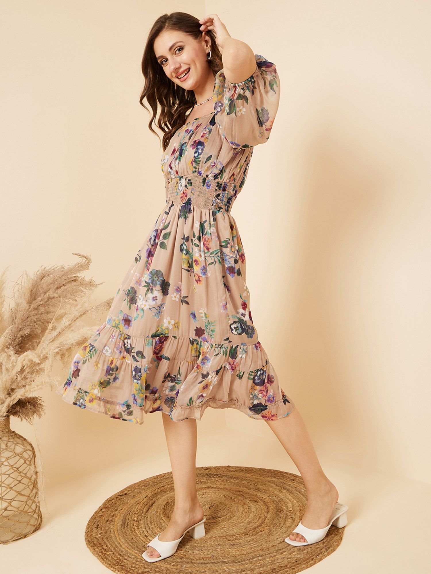 Multi floral midi fit and flare dress, has a square neck, three-quarter sleeves, puff sleeves, flared hem. It is sure to fetch you compliments from all. Join the league of fashion elites flaunting the staple....