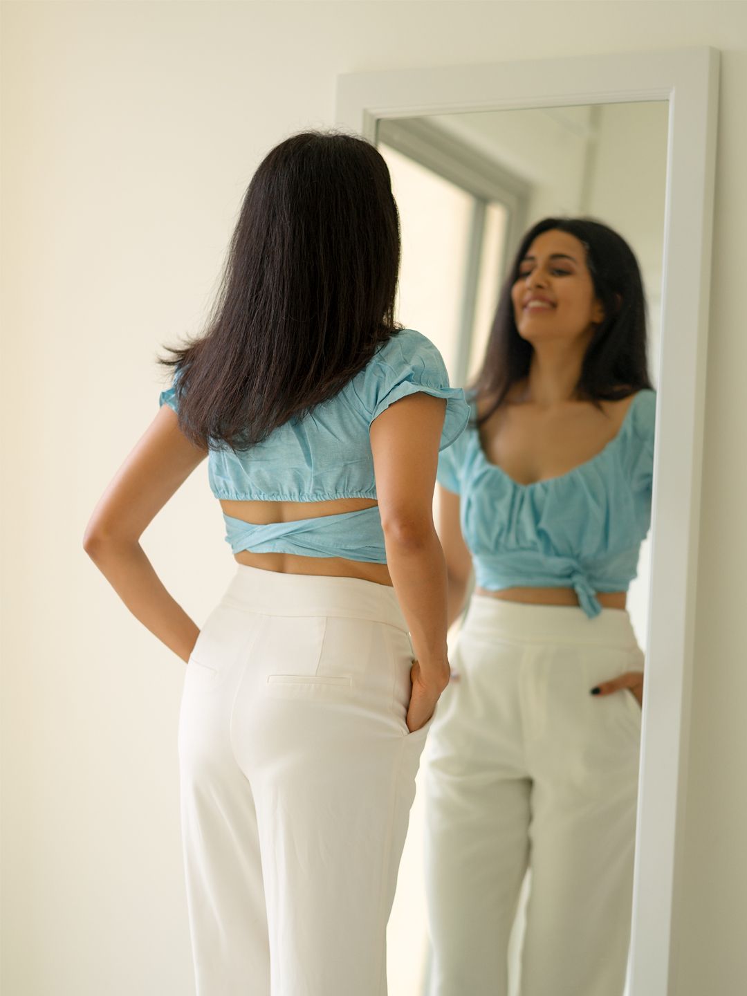 White solid mid-rise cropped trousers, slip-on closure, and 2 pockets......