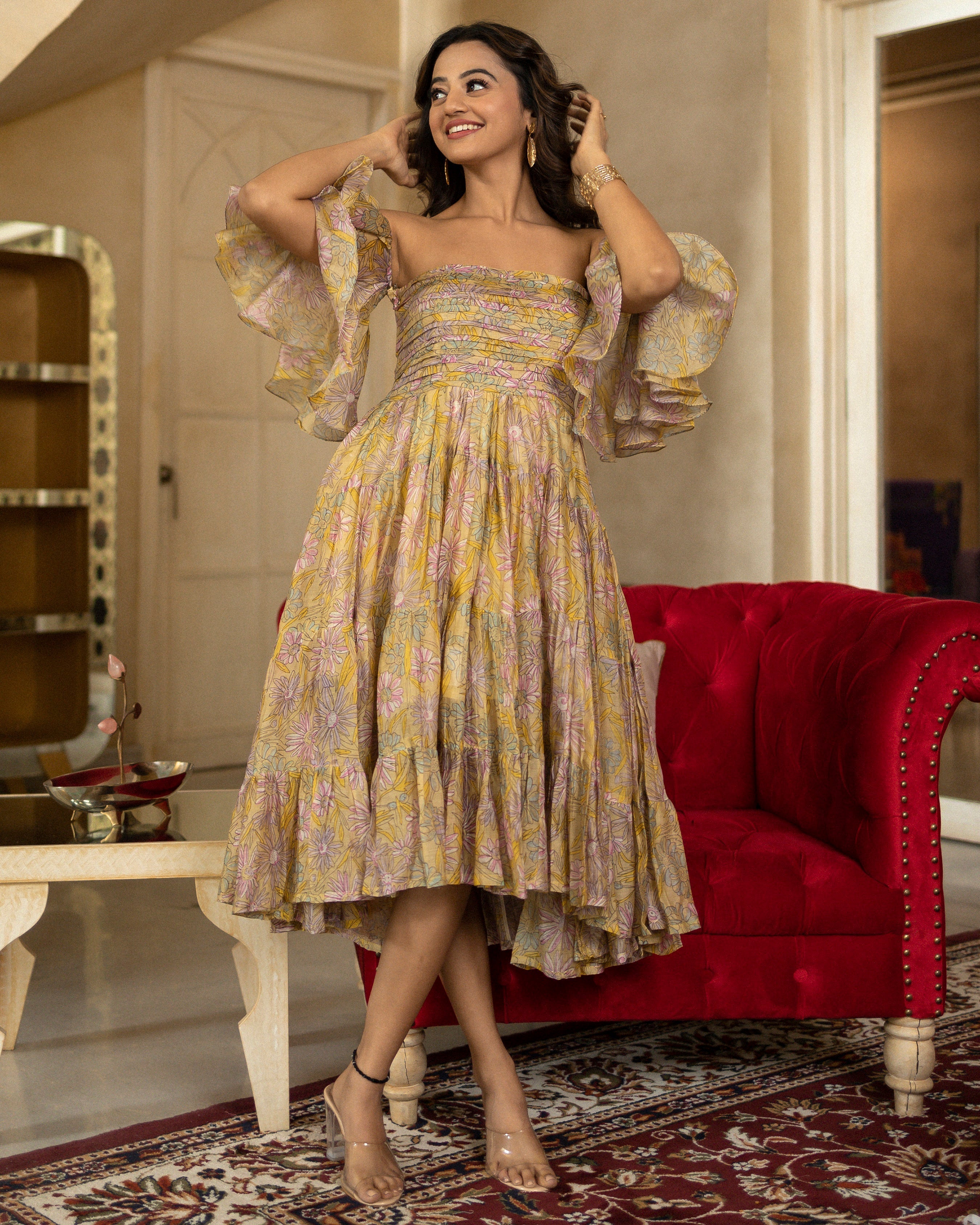 Brighten up your summer wardrobe with the Yureni Chanderi Tier Dress that comes in a soothing yellow hue! Featuring a gorgeous floral jaal print, an off-shoulder smocked bodice, and a tiered flare, this playful dress is perfect for sunny days and warm evenings.....