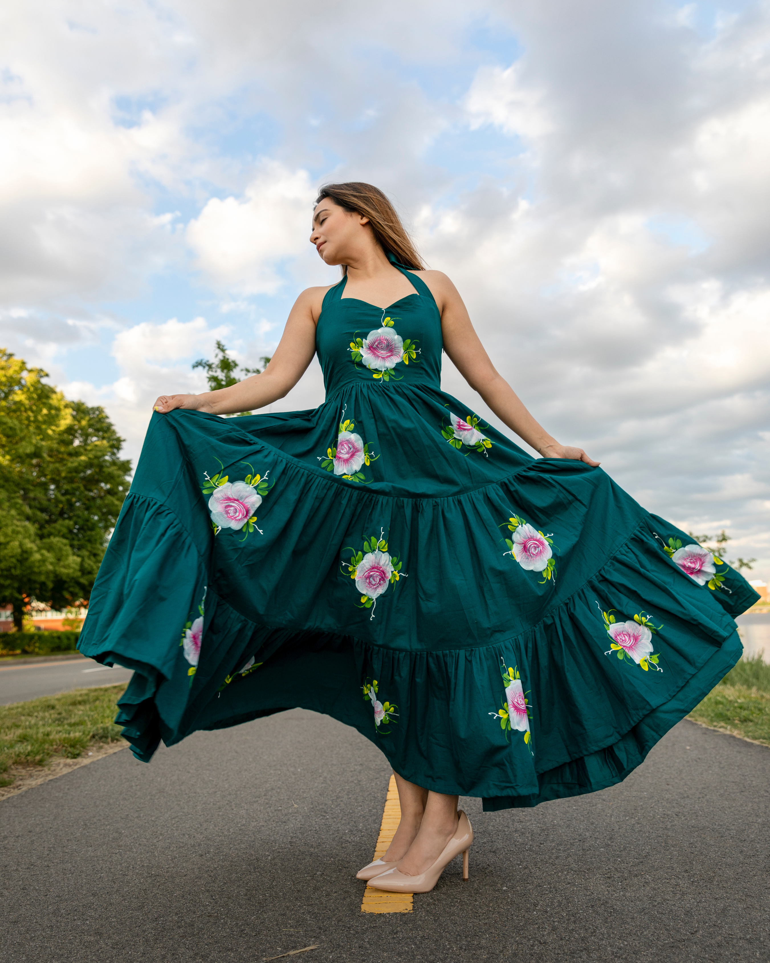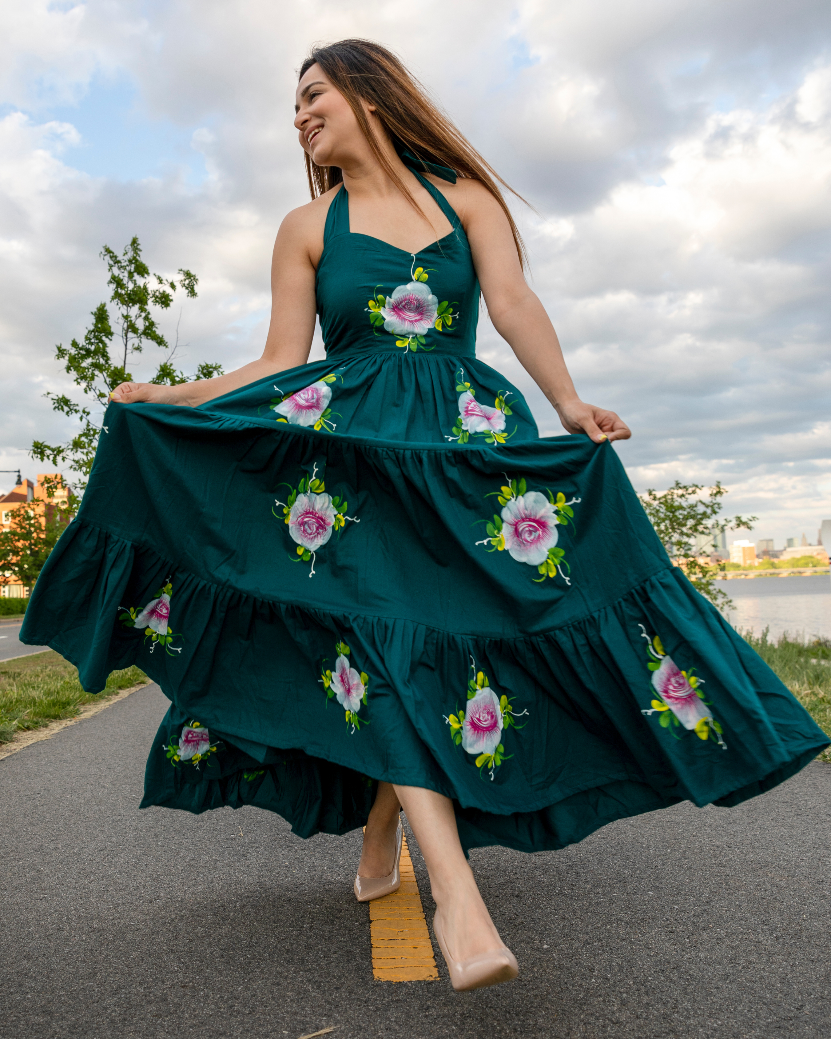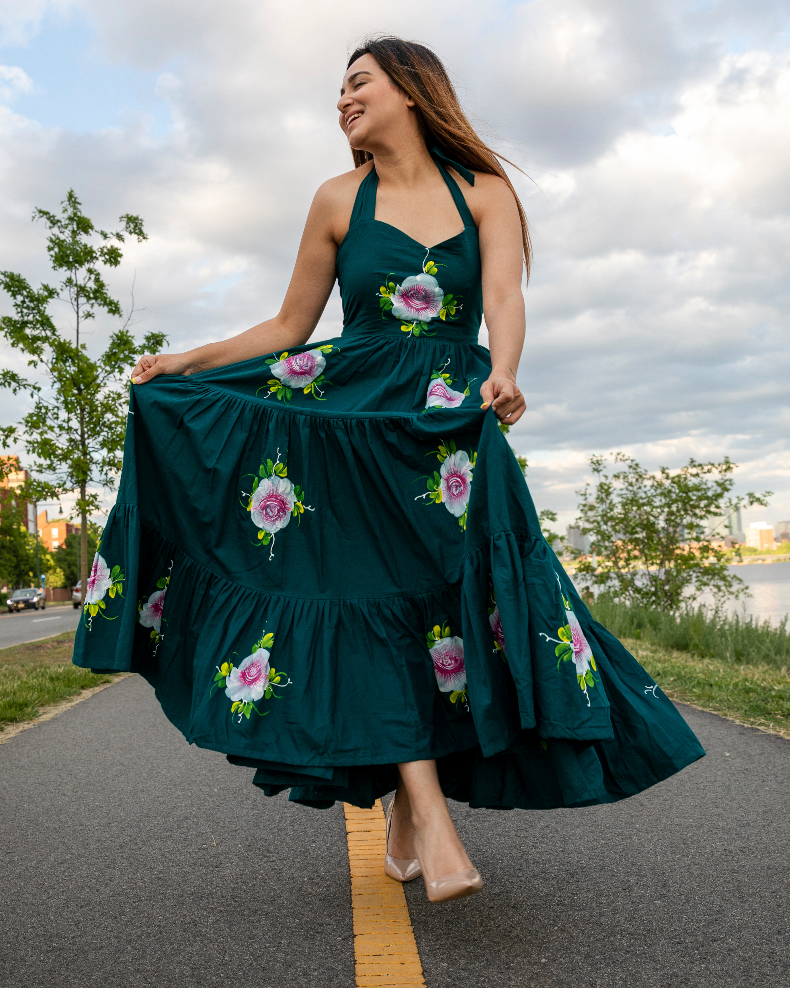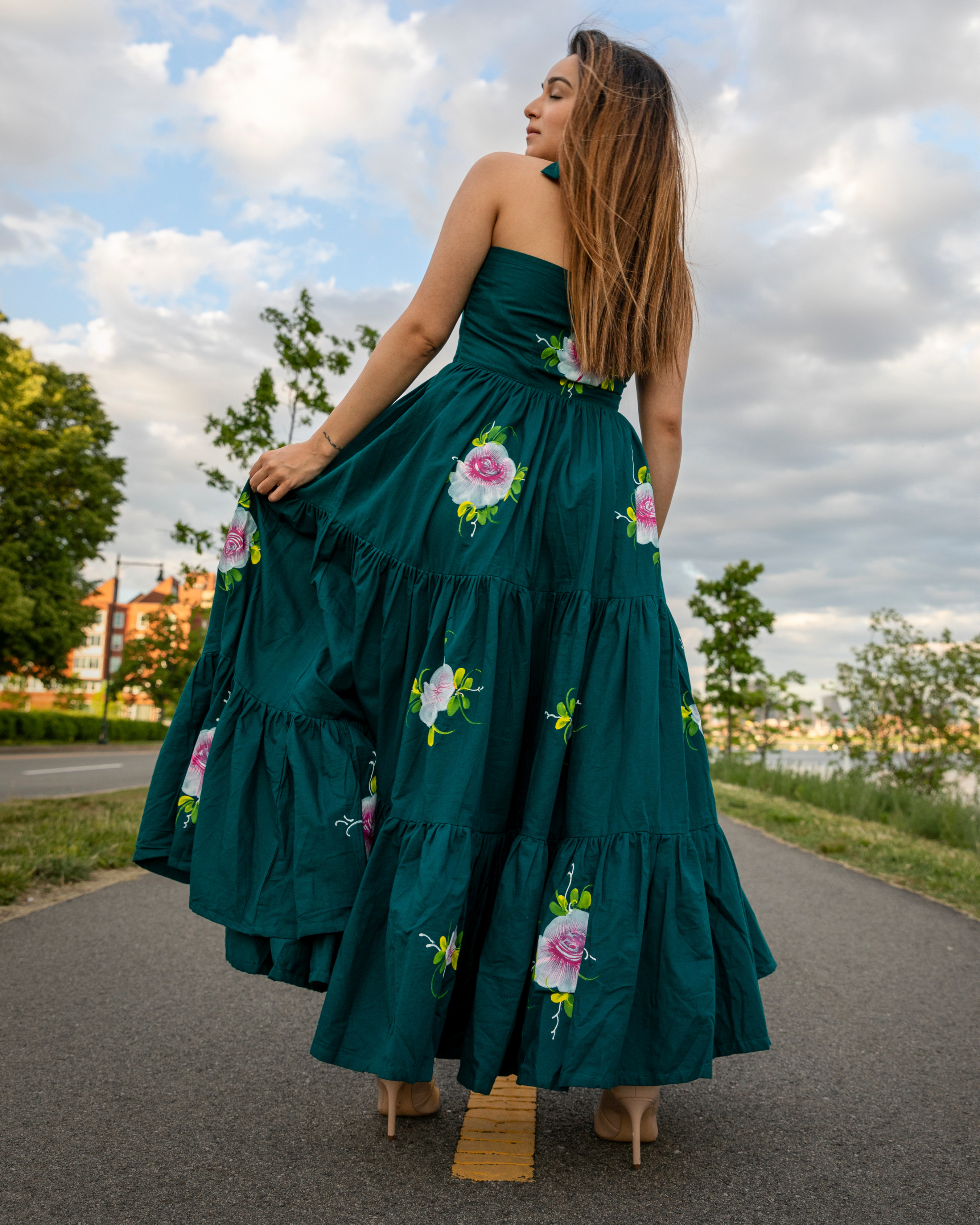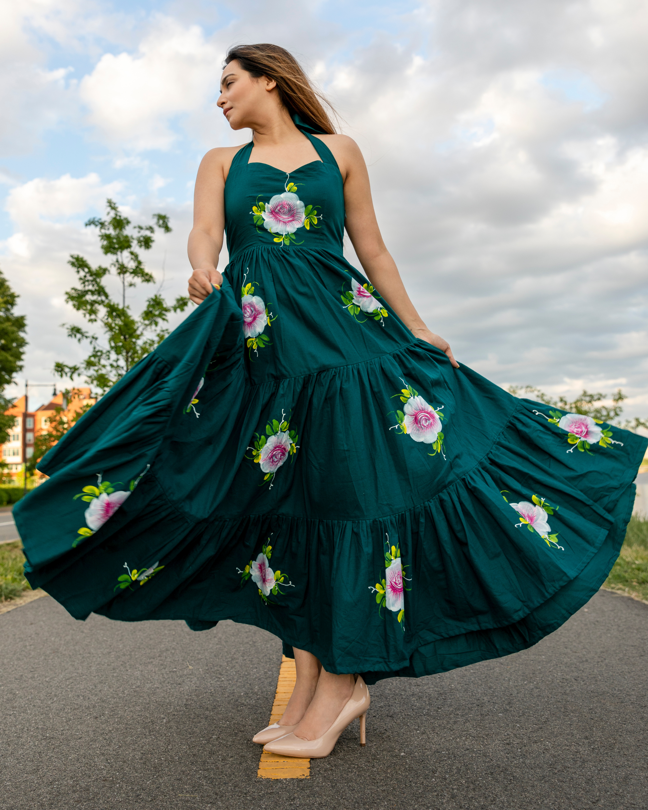 DARK GREEN Cotton Handpainted Dress. Color: DARK GREEN Dress Fabric: Cotton Neckline: Halter CARE: Gentle Handwash Only Model Size: The model is wearing S Size Model Height: 5'7"...
