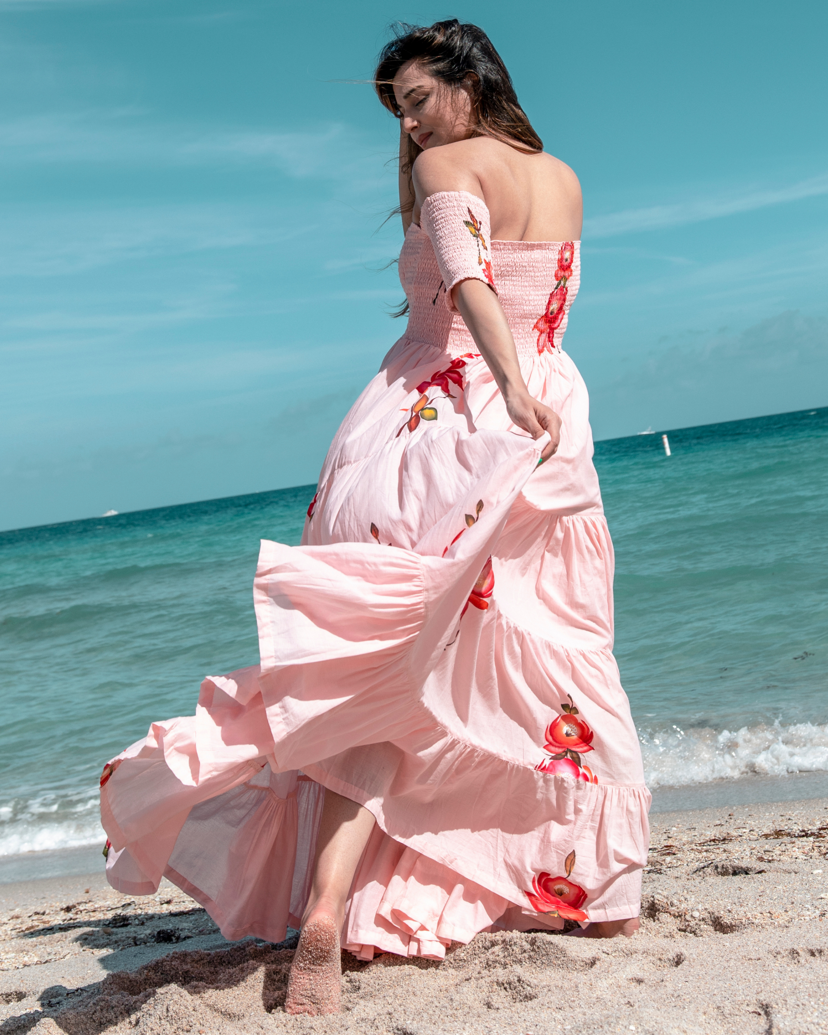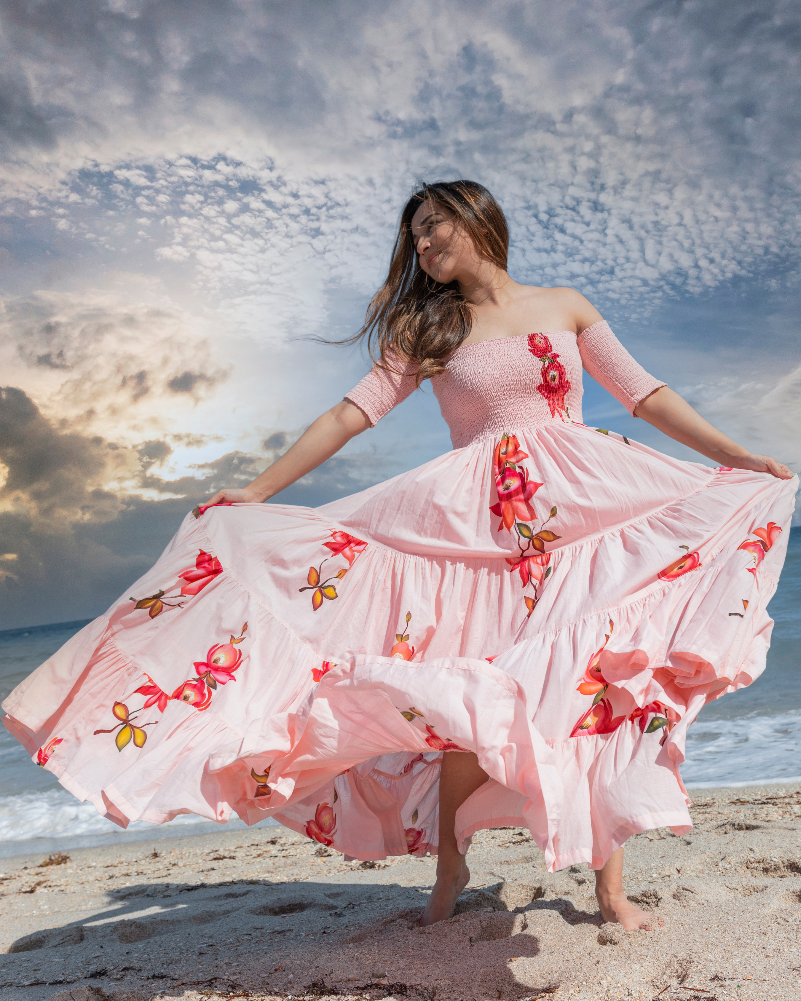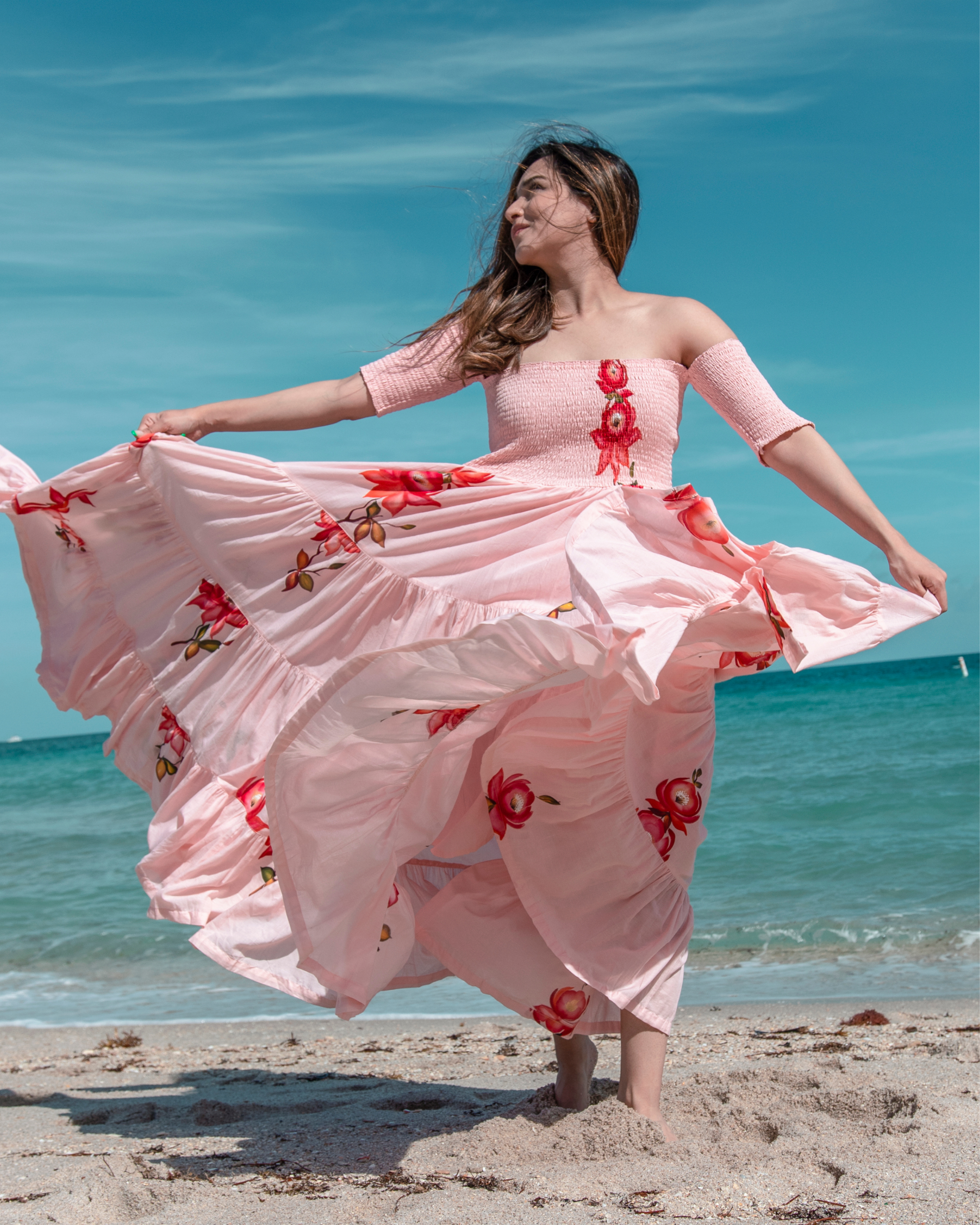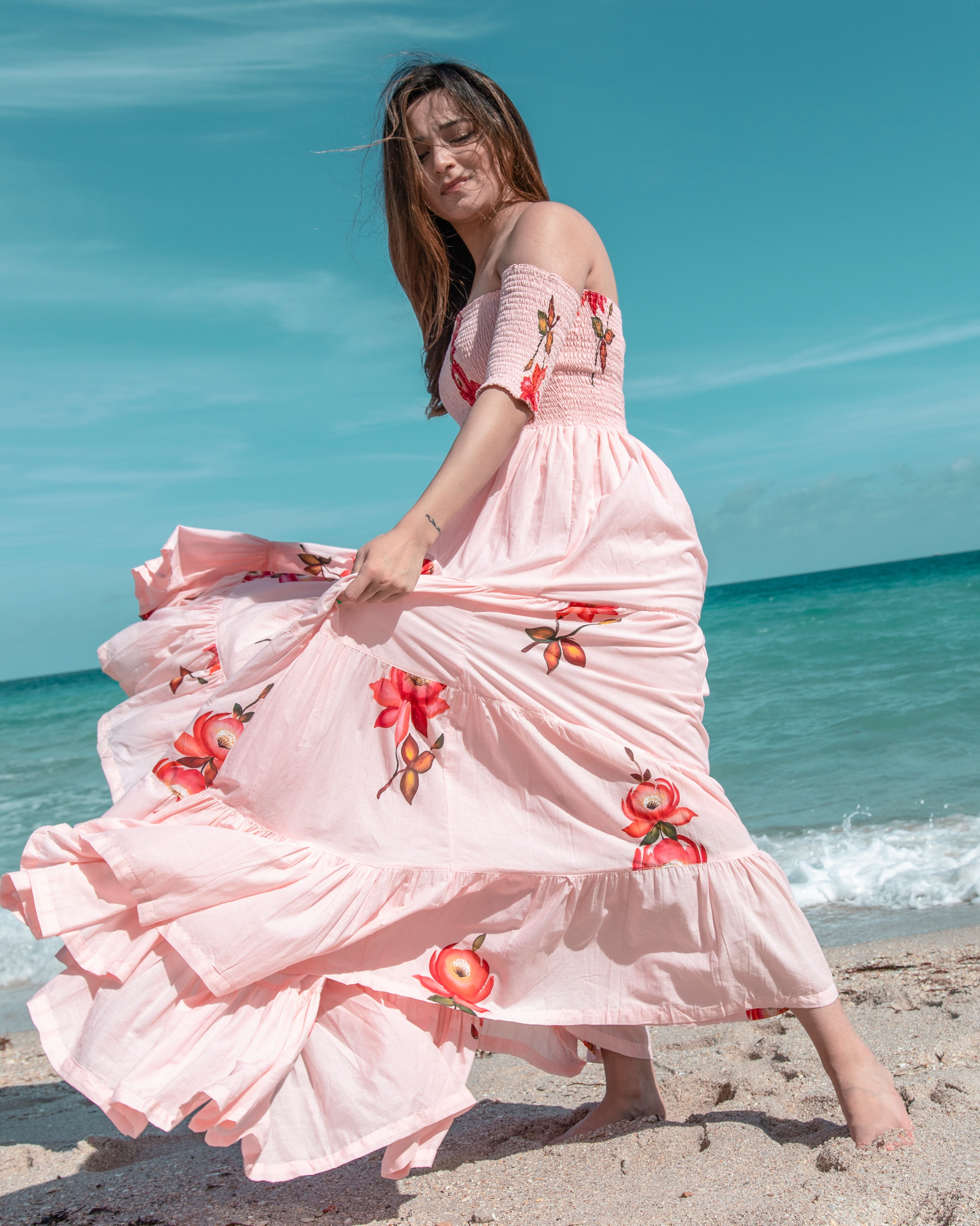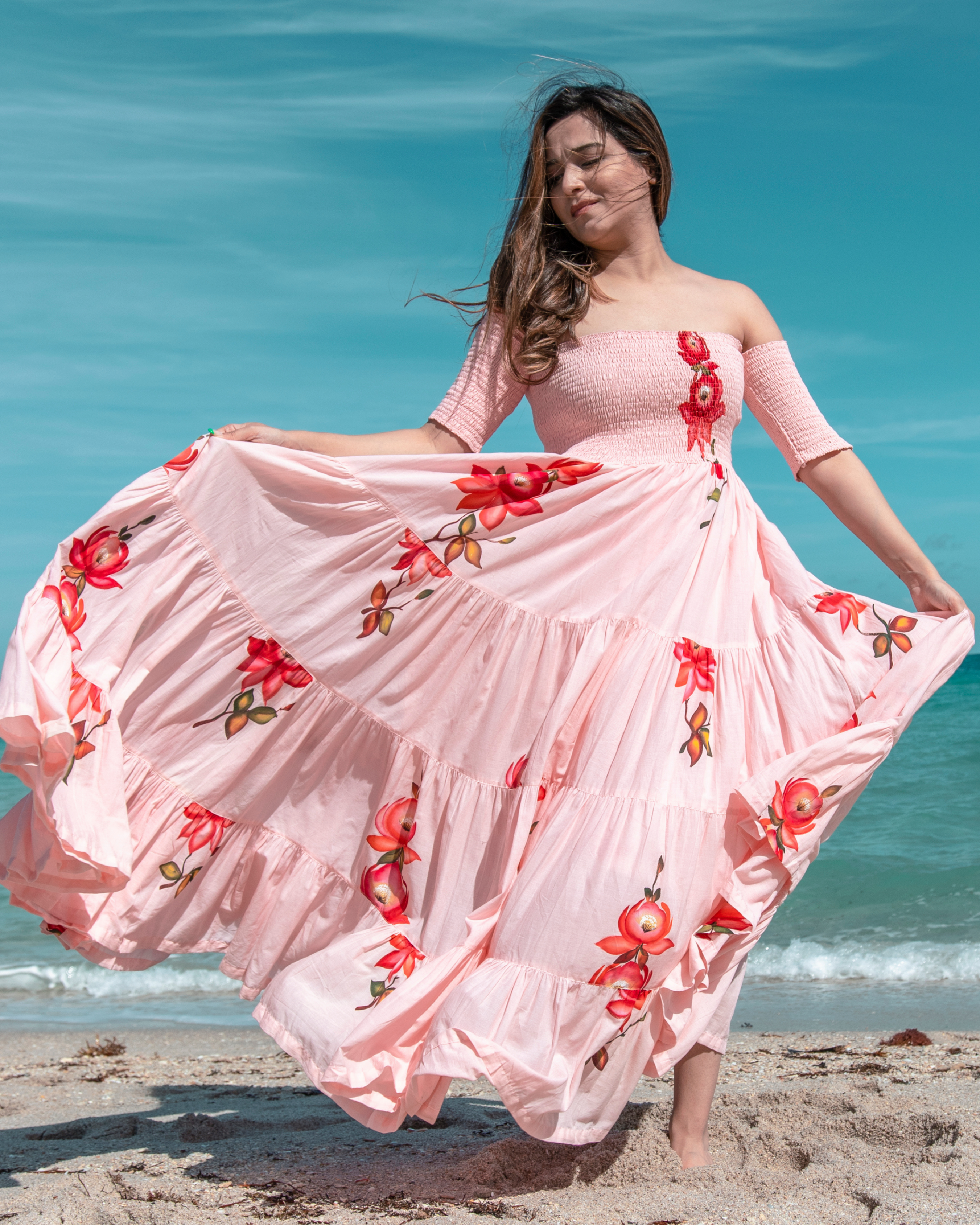 PASTEL PEACH Smocked Cotton Handpainted dress . Color: PEACH Dress Fabric: Cotton Neckline: Square CARE: Gentle Handwash Only Model Size: Model is wearing S Size Model Height: 5'7"