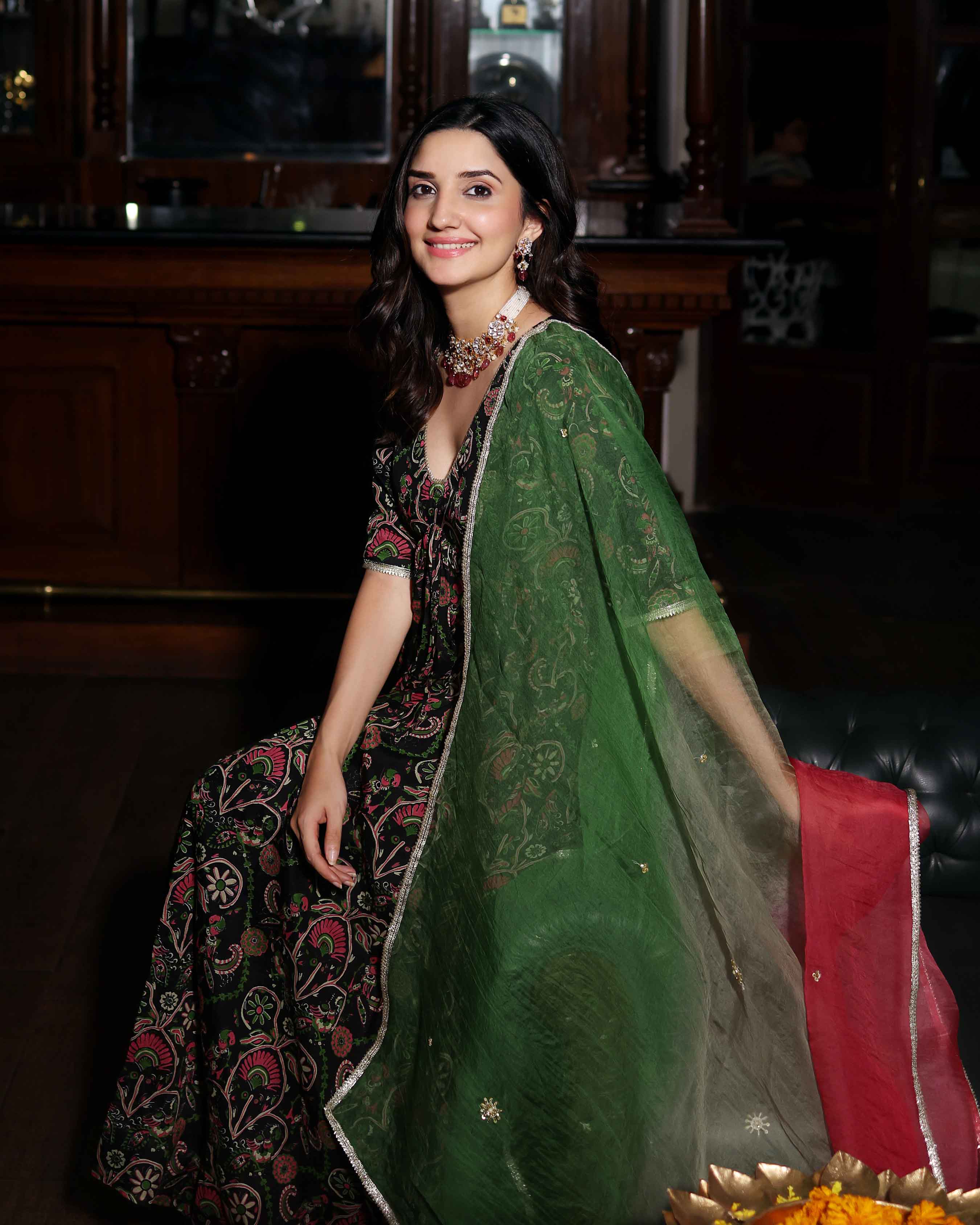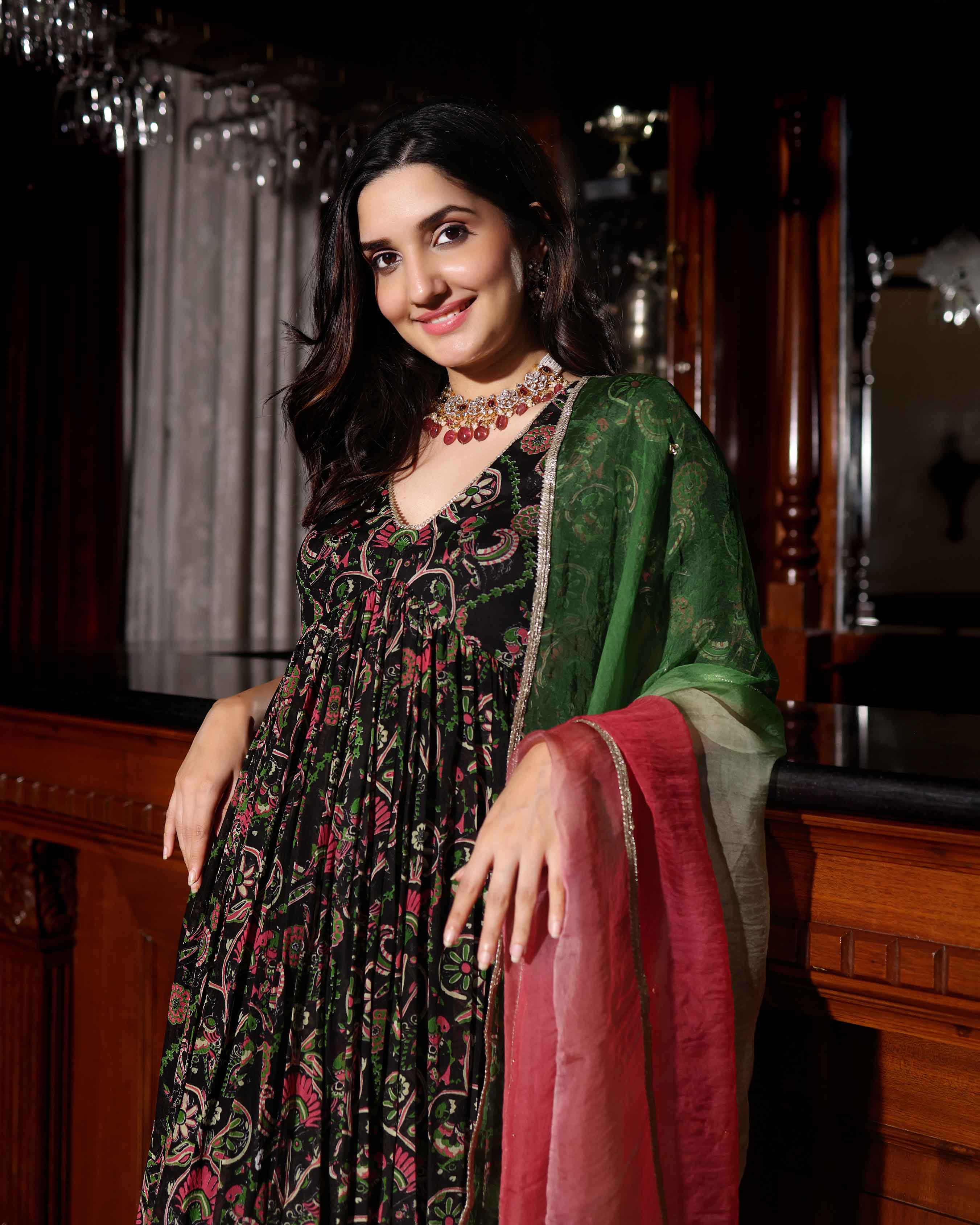 1199-3025 [Color = Black ] [Size = XS, S, M, L, XL, XXL, 3XL, 4XL, 5XL] Florris Mush Black Printed Chinon...