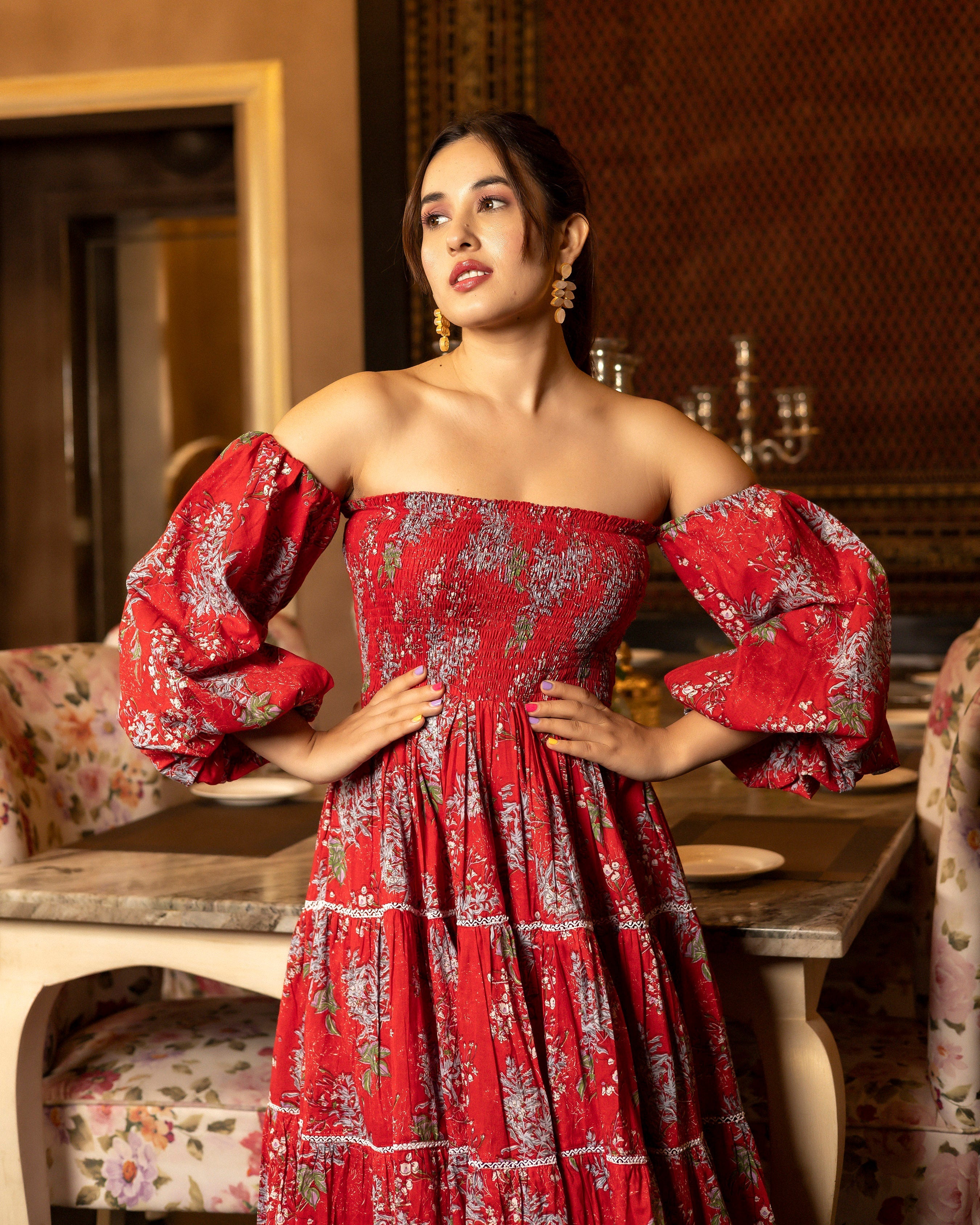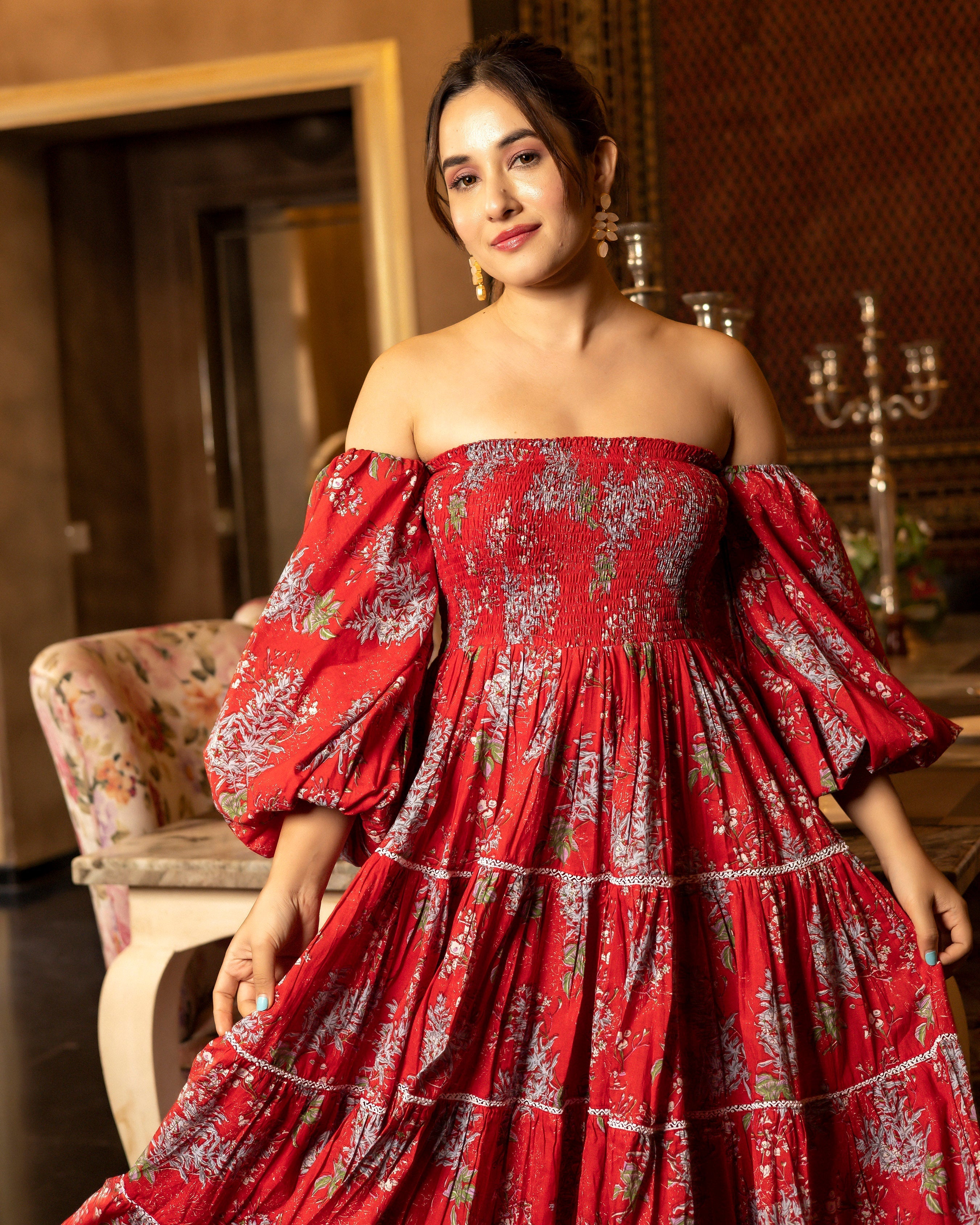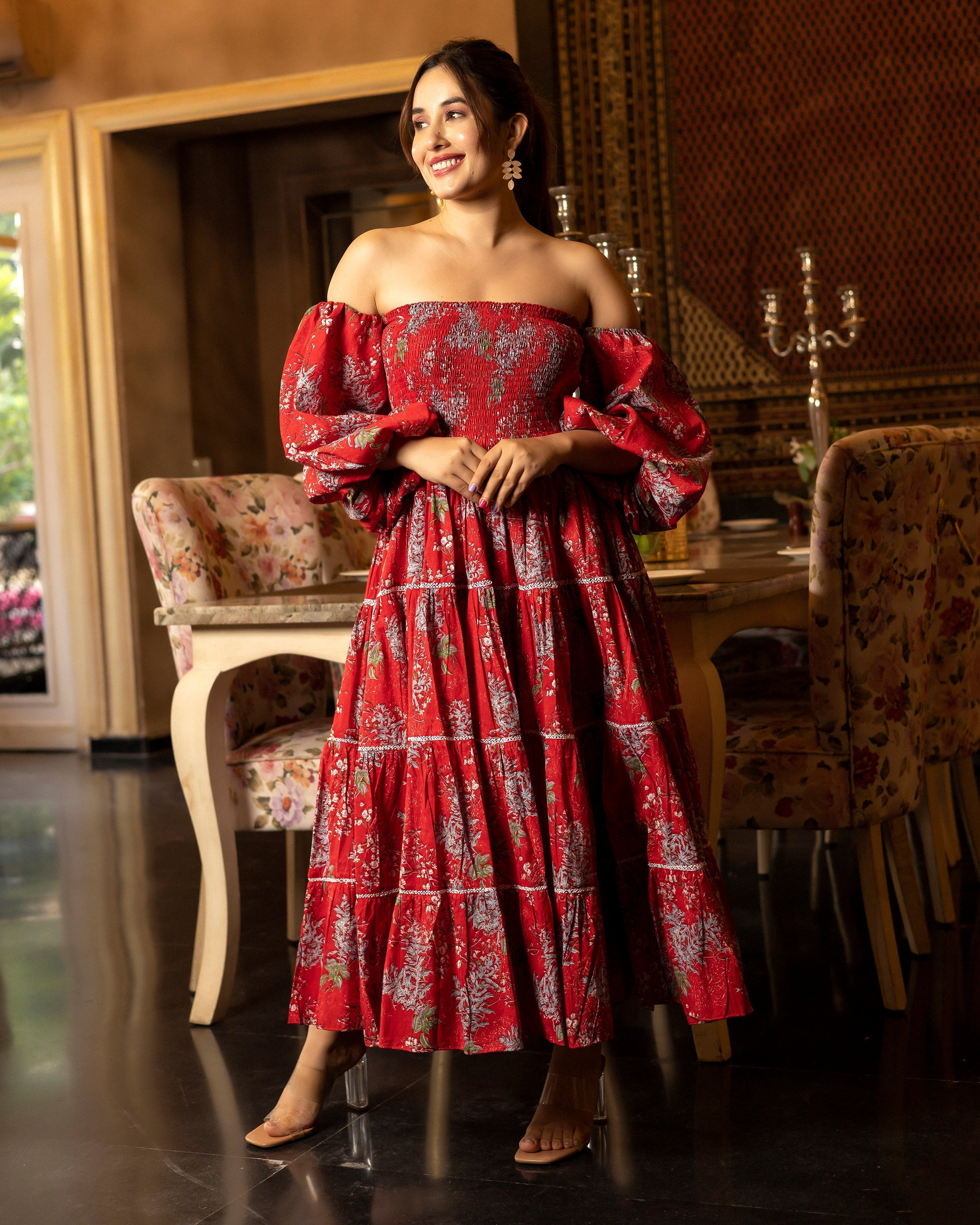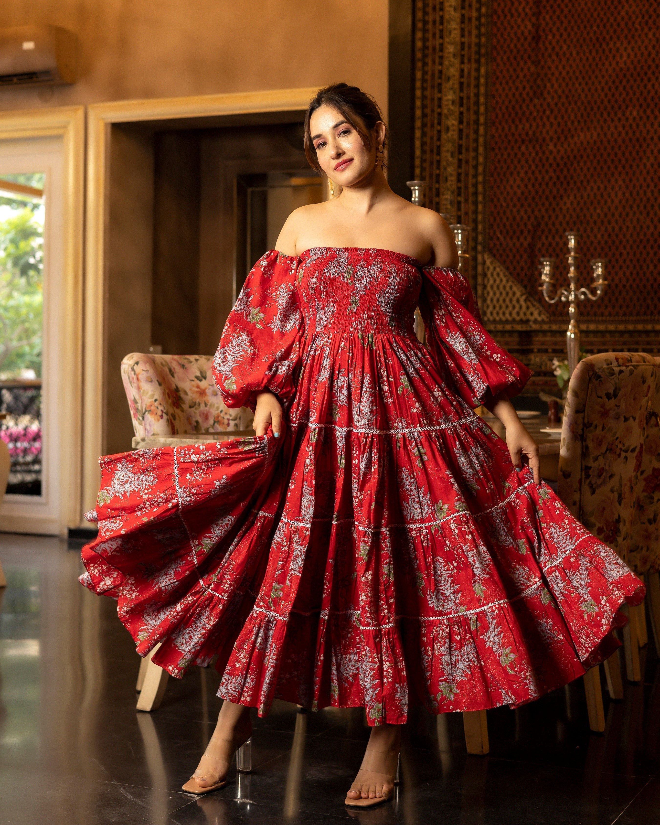 Looking for a dress that's both fun and yet sophisticated? Look no further than the Helia Smocked Cotton Dress! With its flowy cut, stunning red color, and intricate handblock print, this midi dress is sure to turn heads wherever you go........