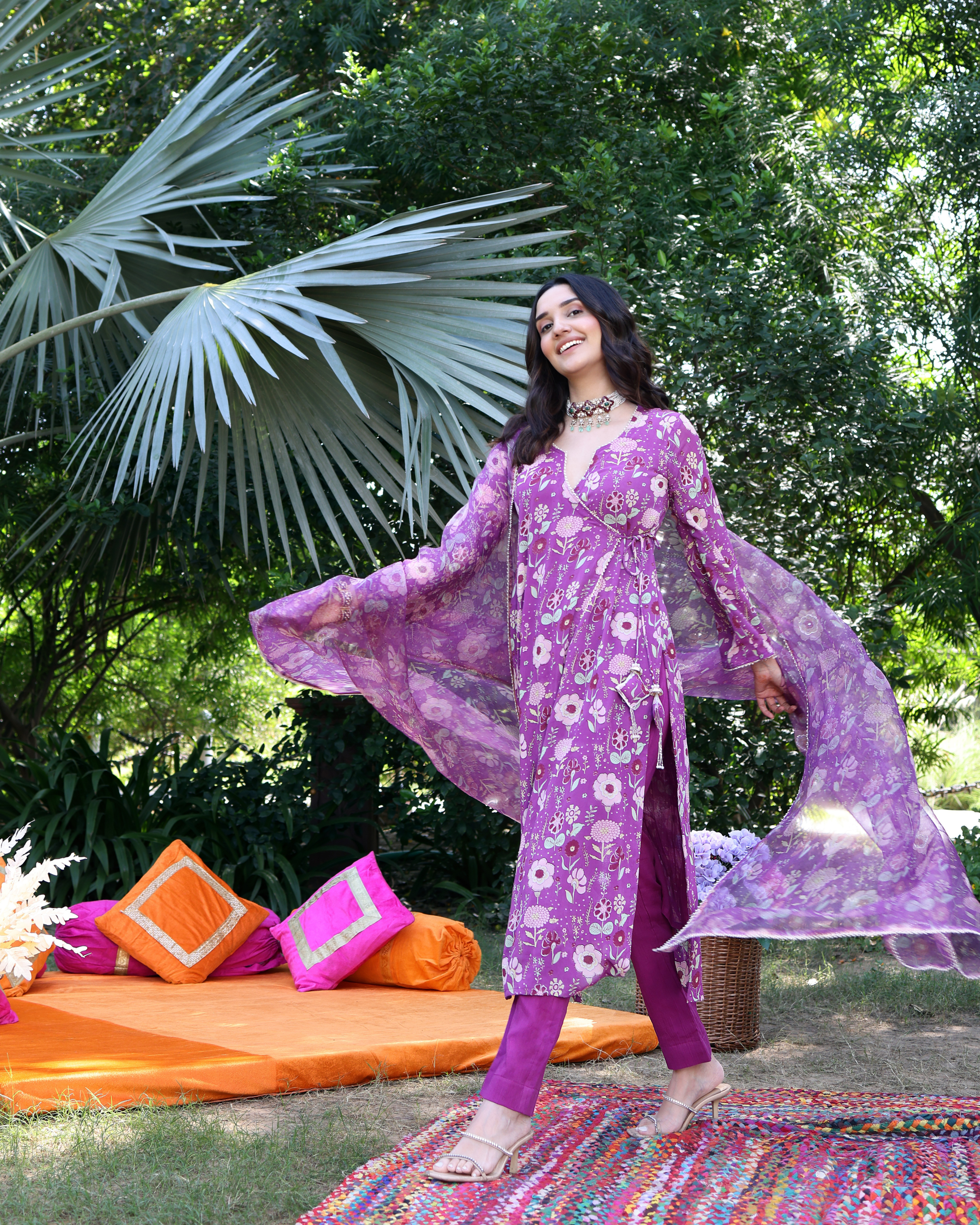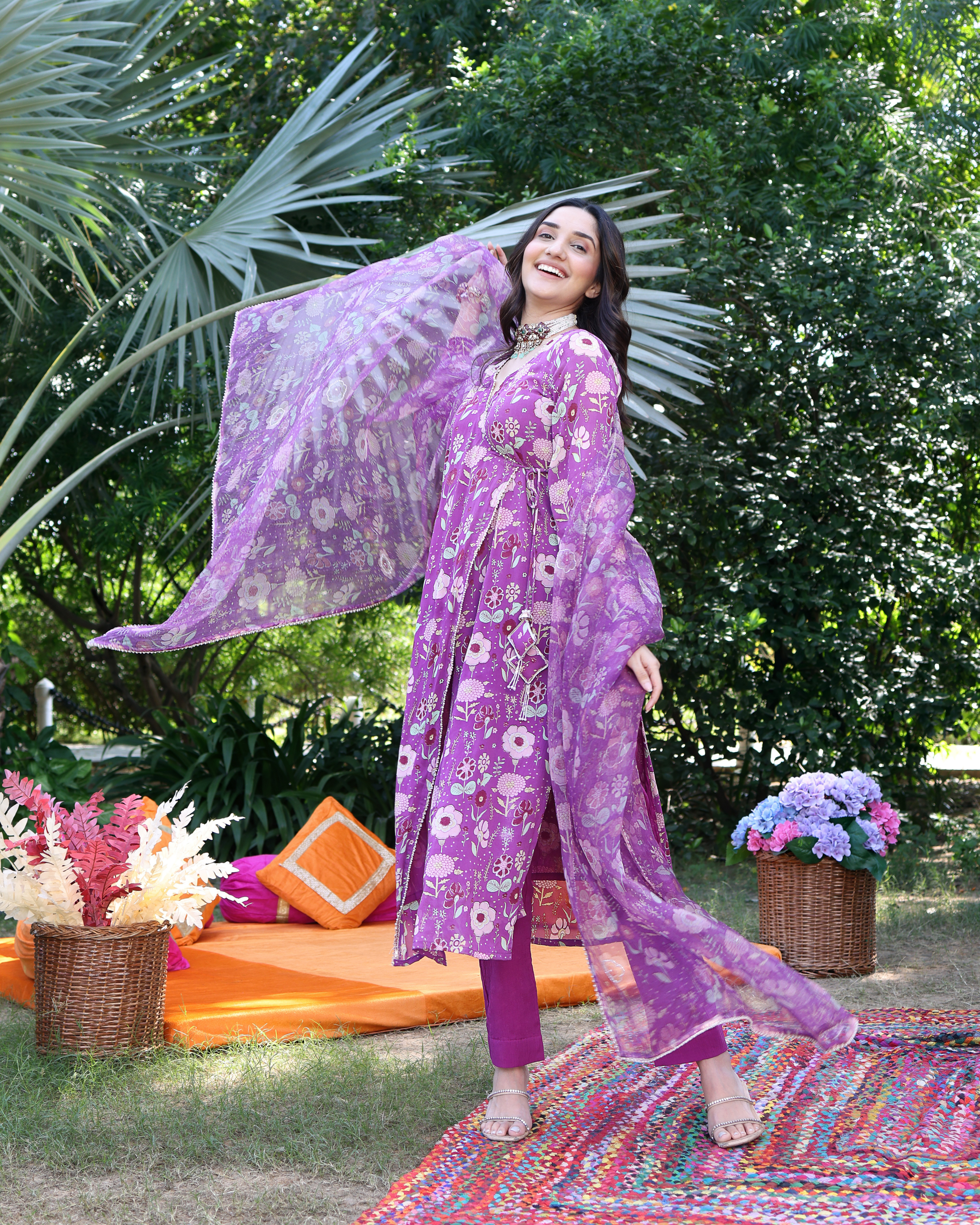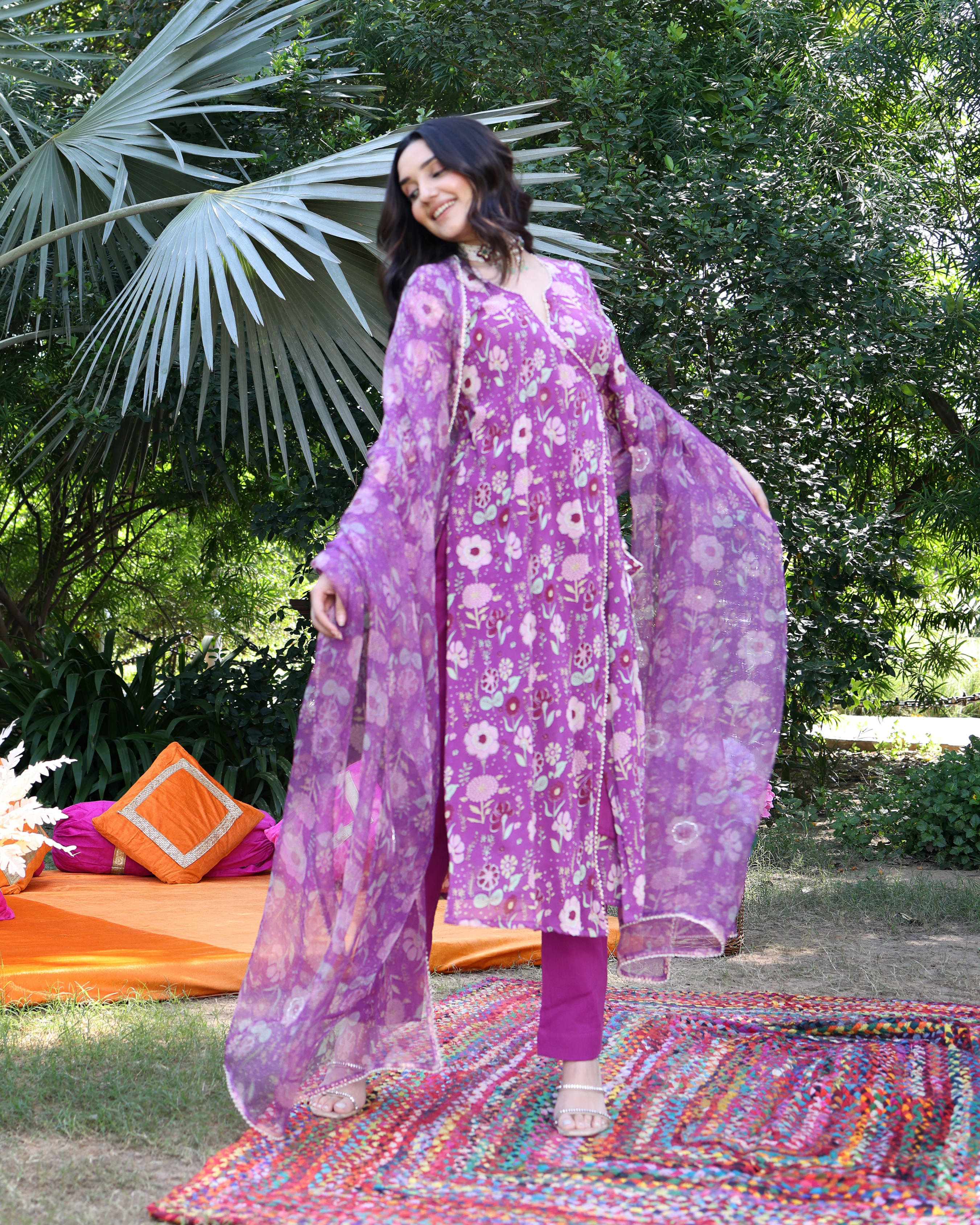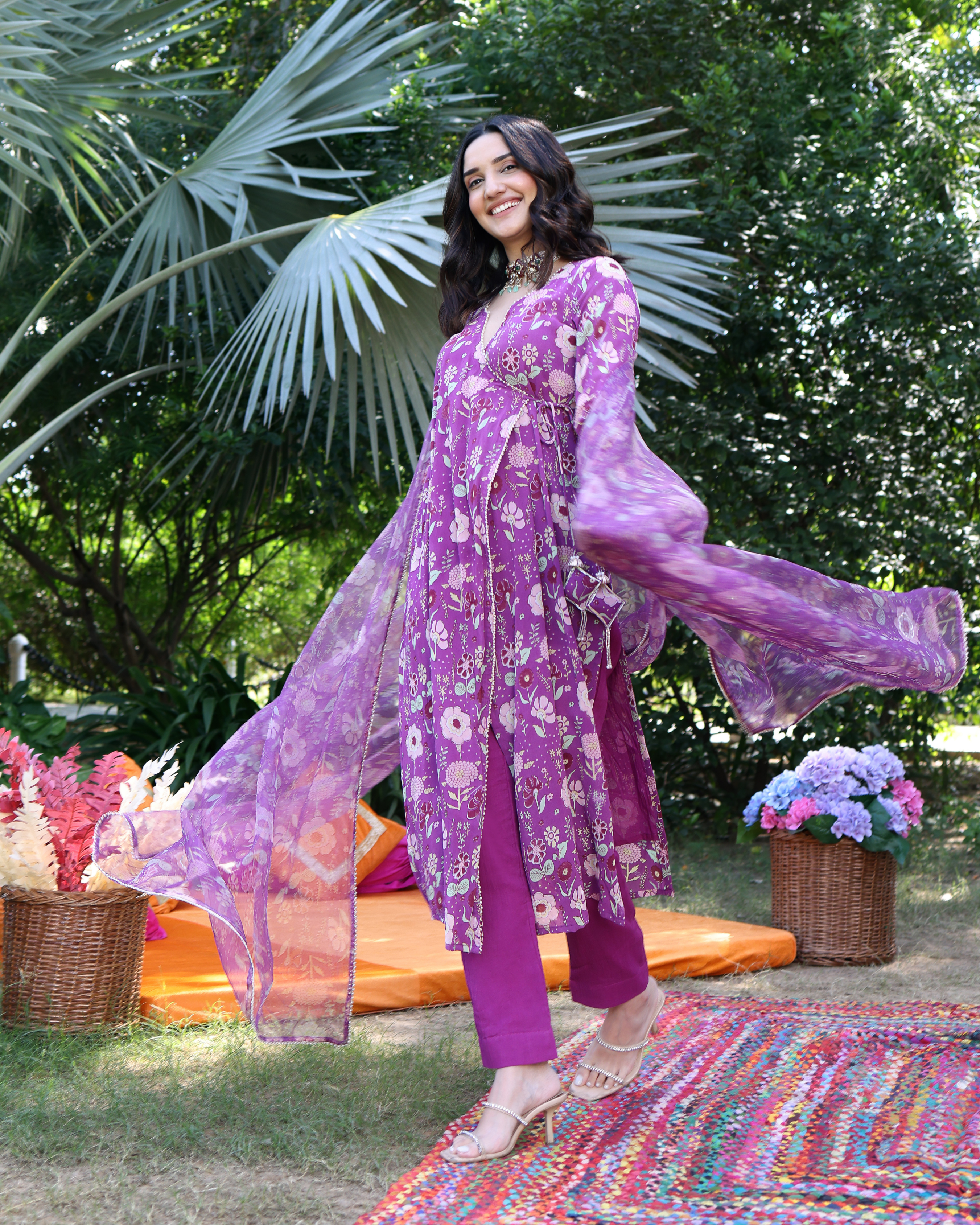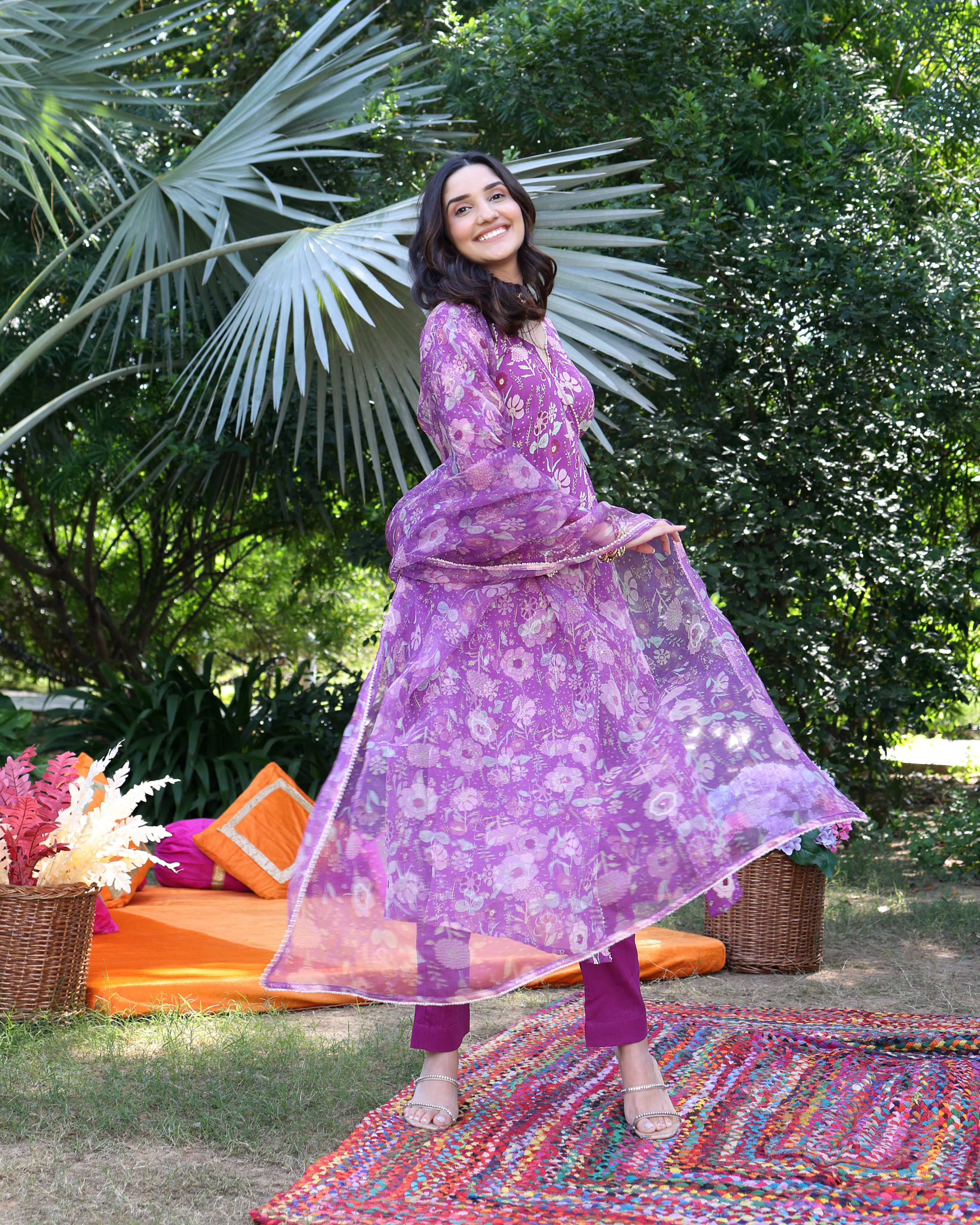 1265-3050 [Color = Purple ] [Size = XS, S, M, L, XL, XXL, 3XL, 4XL, 5XL] Iris Bloom Purple Printed Georget...