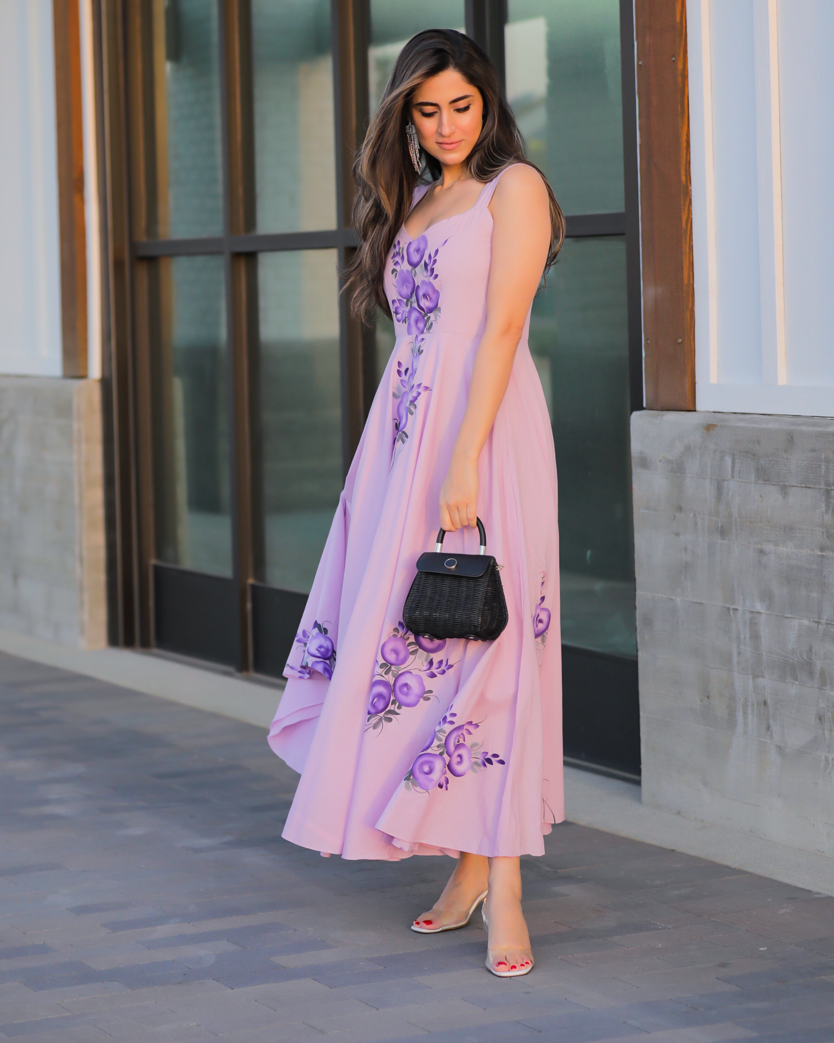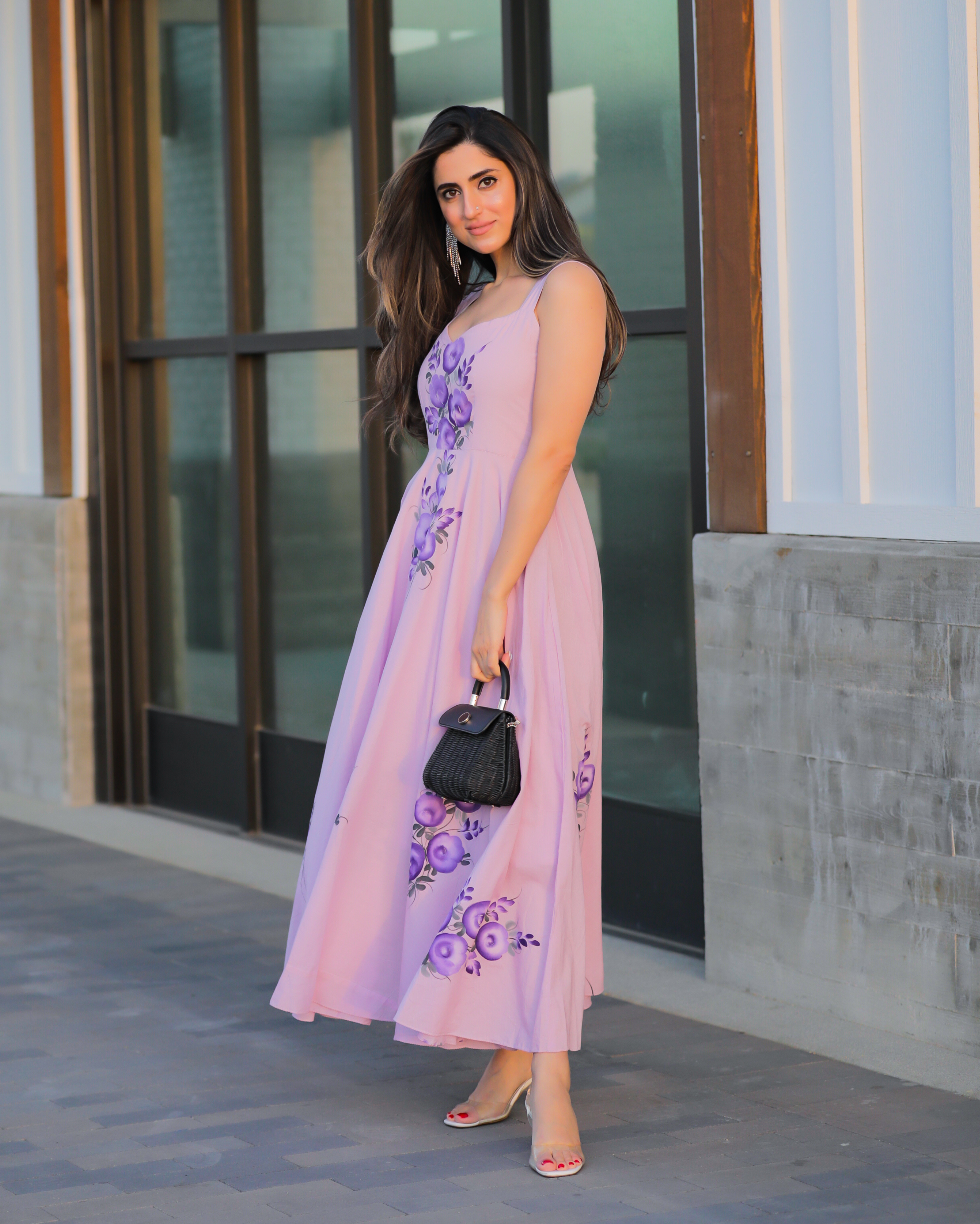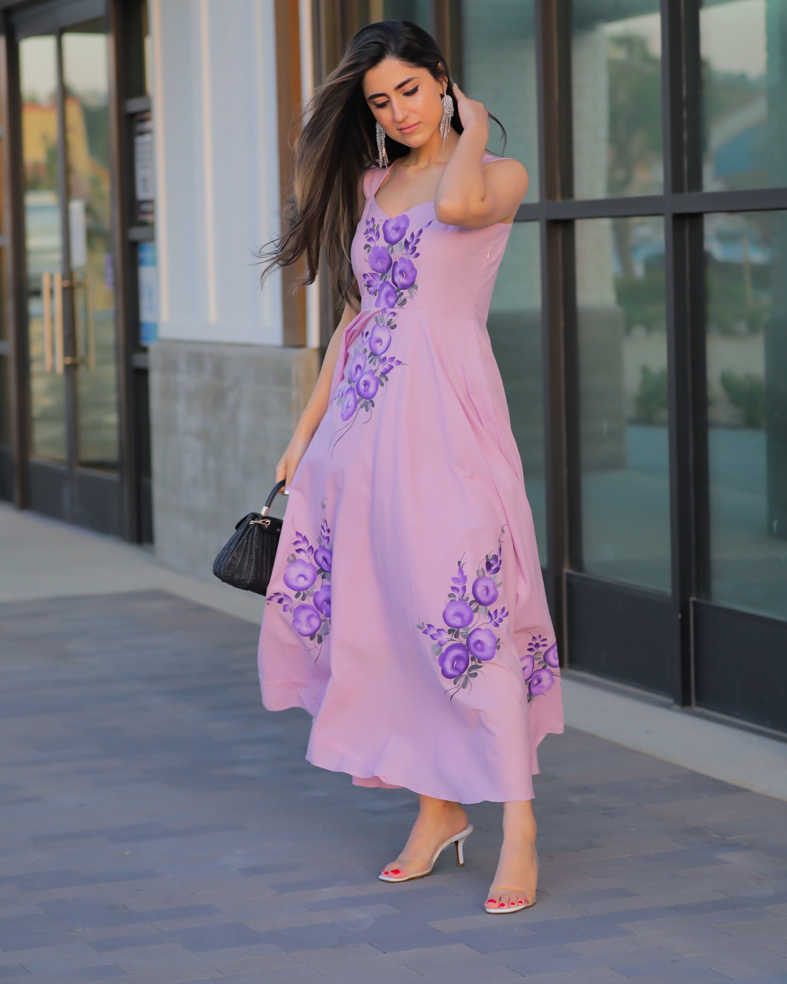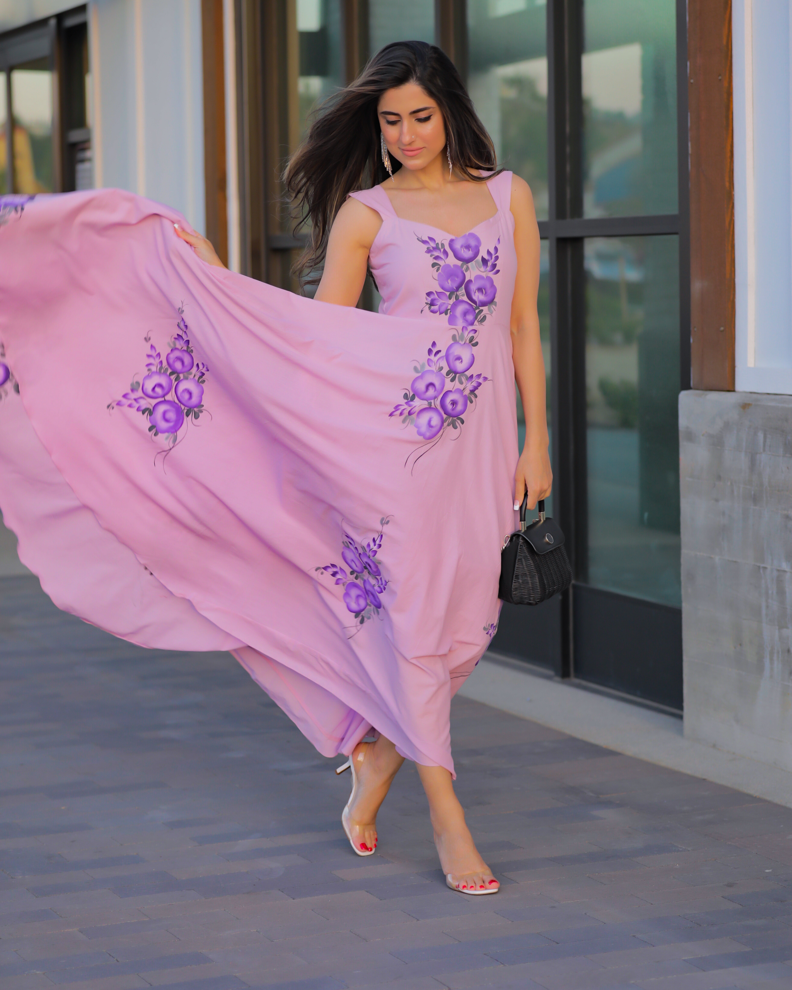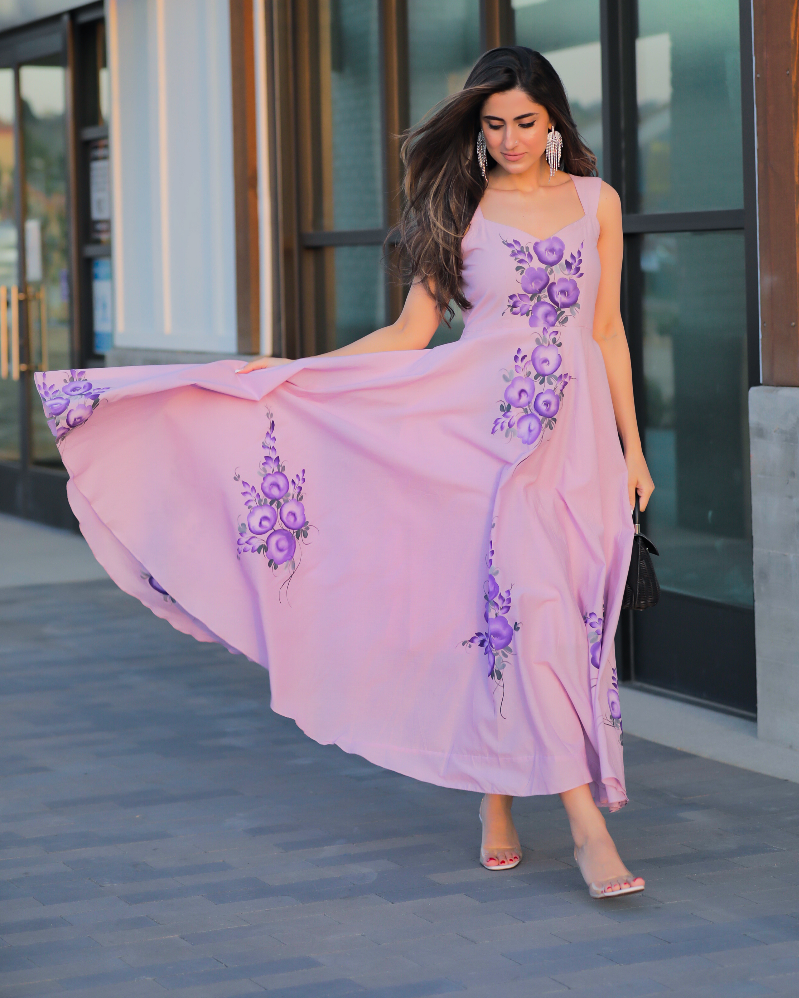 LILAC Cotton HANDPAINTED DRESS . Color: PURPLE Dress Fabric: Cotton Neckline: SWEETHEART CARE: Gentle Handwash Only Model Size: Model is wearing S Size Model Height: 5'7"...