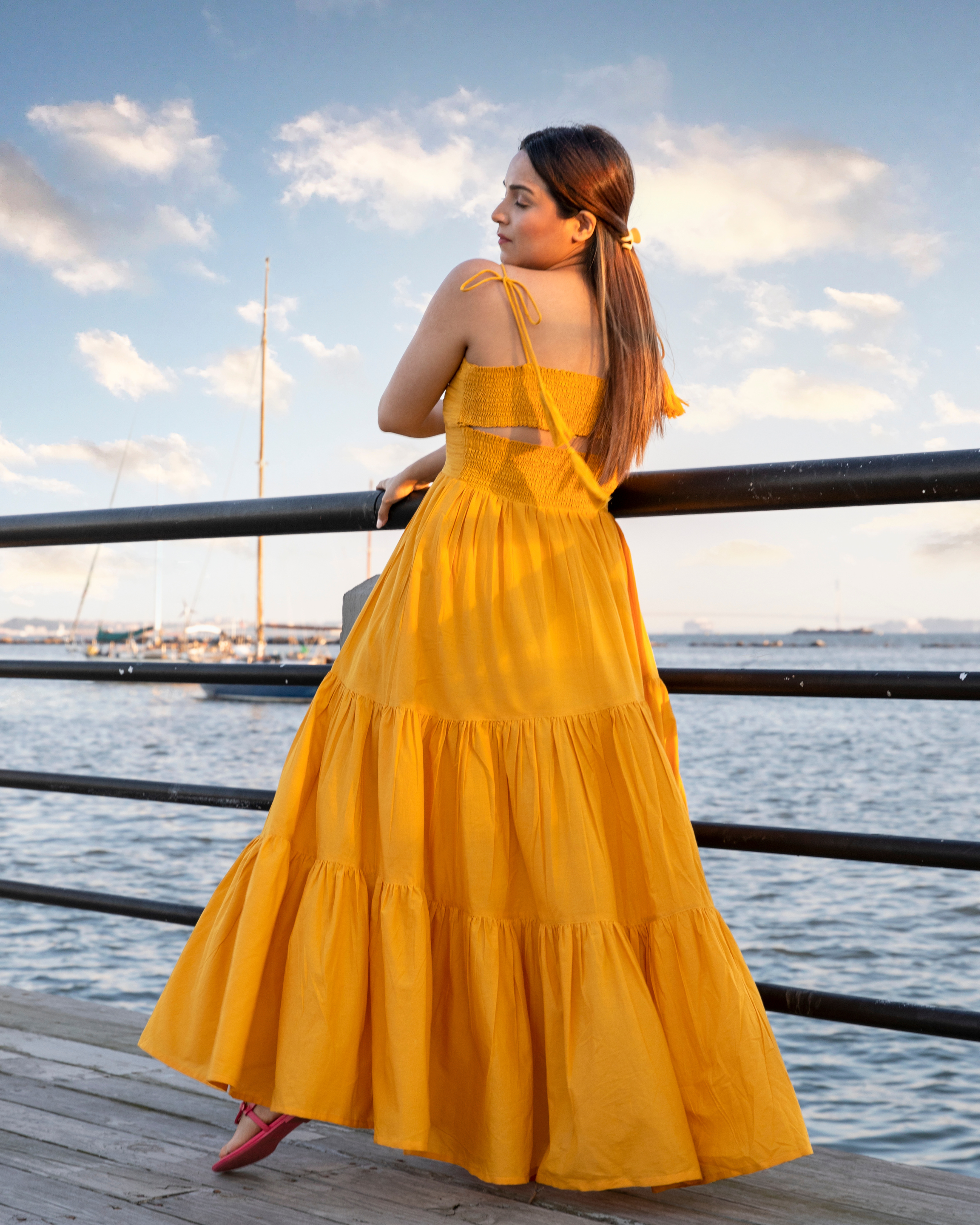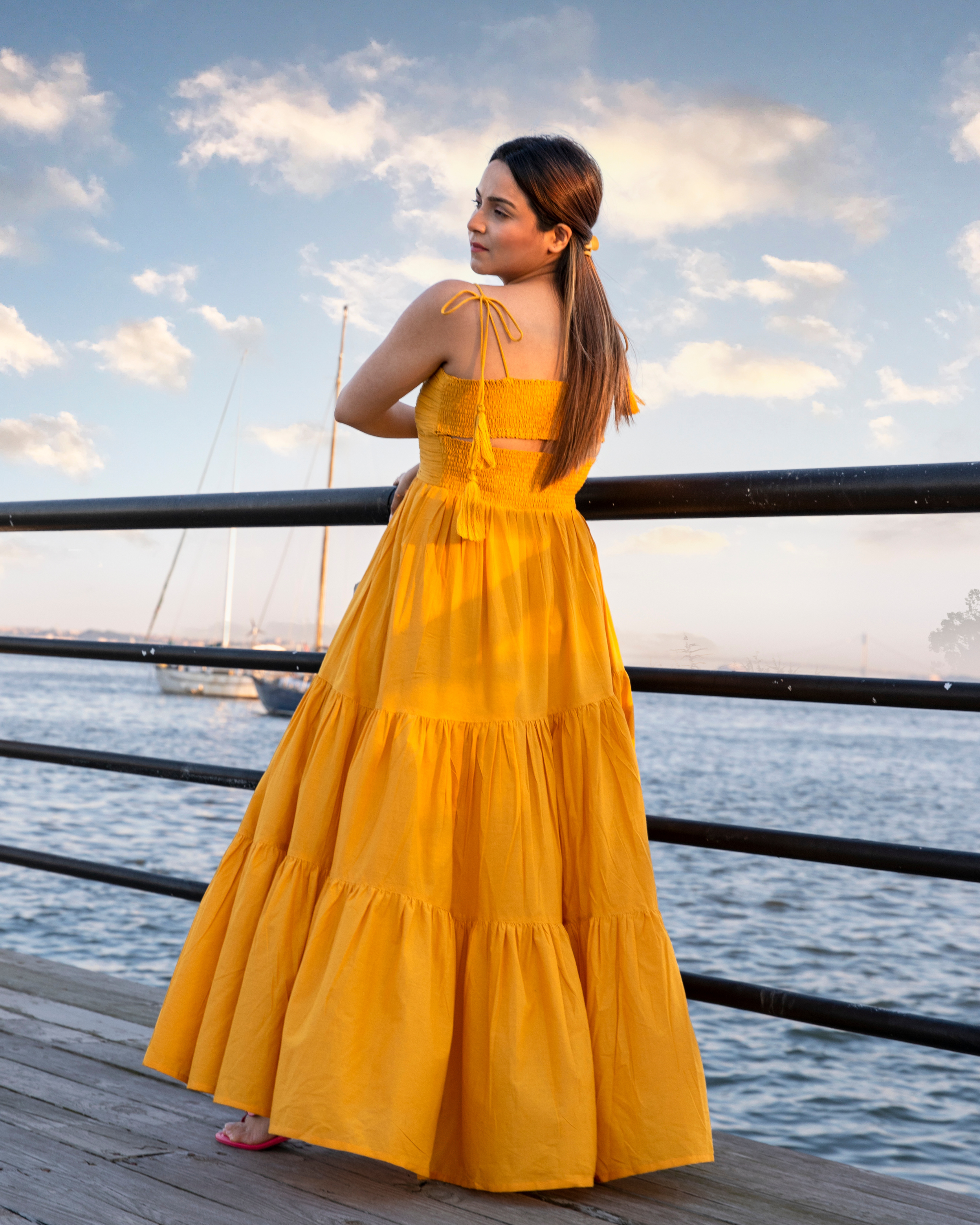 asy, breezy, and playful, our Perry Tier Cotton Dress in a stunning yellow hue is a perfect companion for your trips. The knot-me string straps and tiers give a perfect punch of elegance and glam to the dress. You can wear a belt or just carry an oversized brown handbag to spruce up your look....