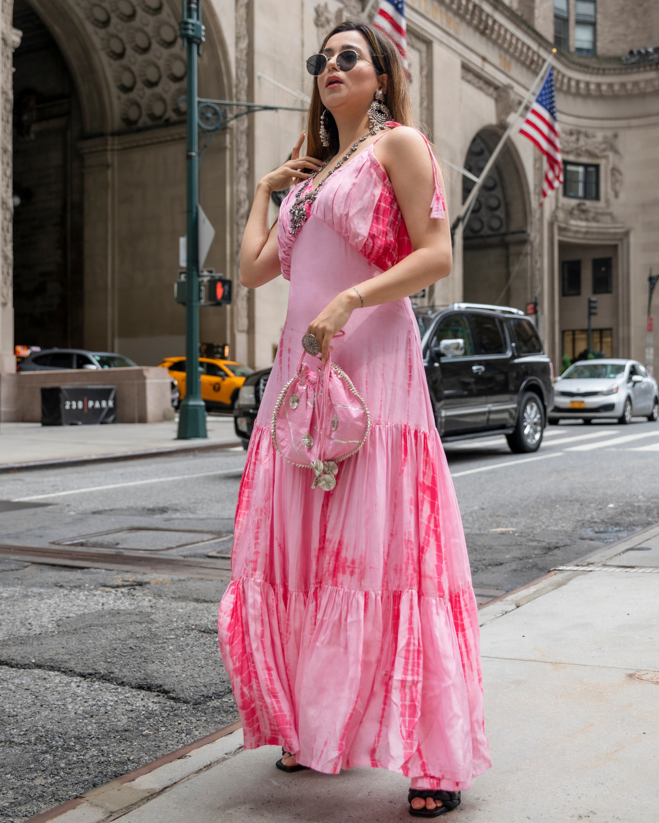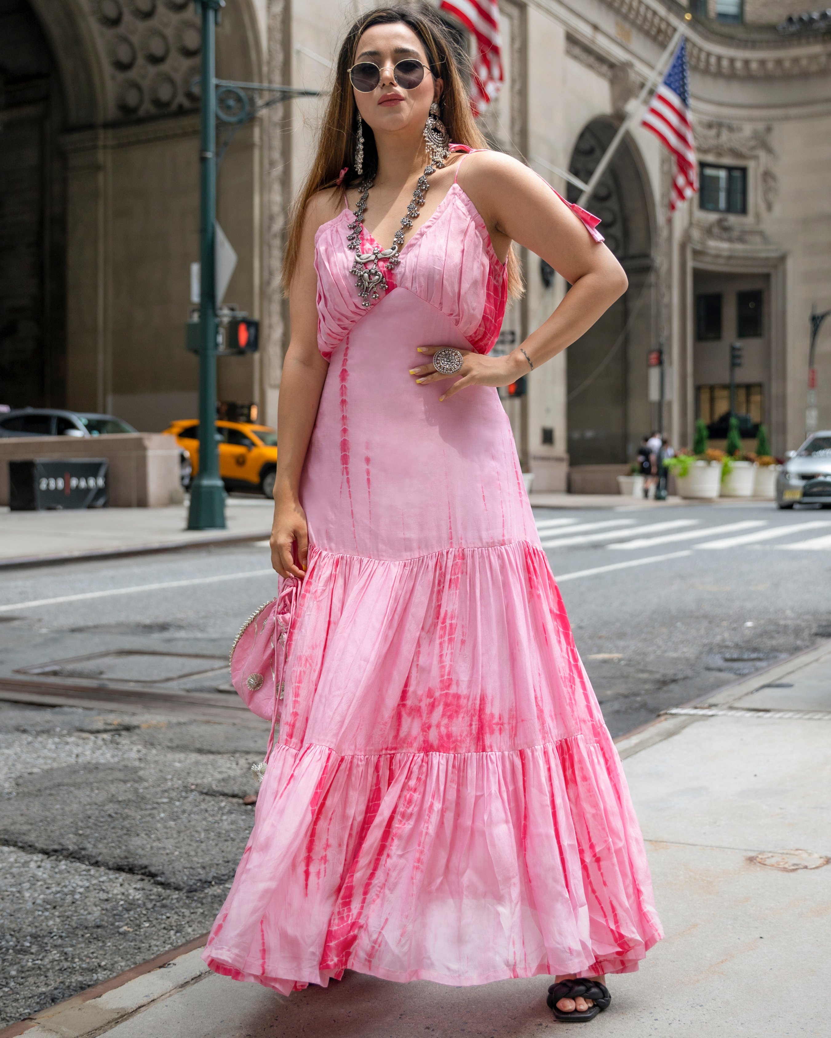 Pink Tie Dye Tier Dress . Color: Pink Dress Fabric: Silk Neckline: V CARE: Dry Clean Only Model Size: Model is wearing S Size Model Height: 5'7"...