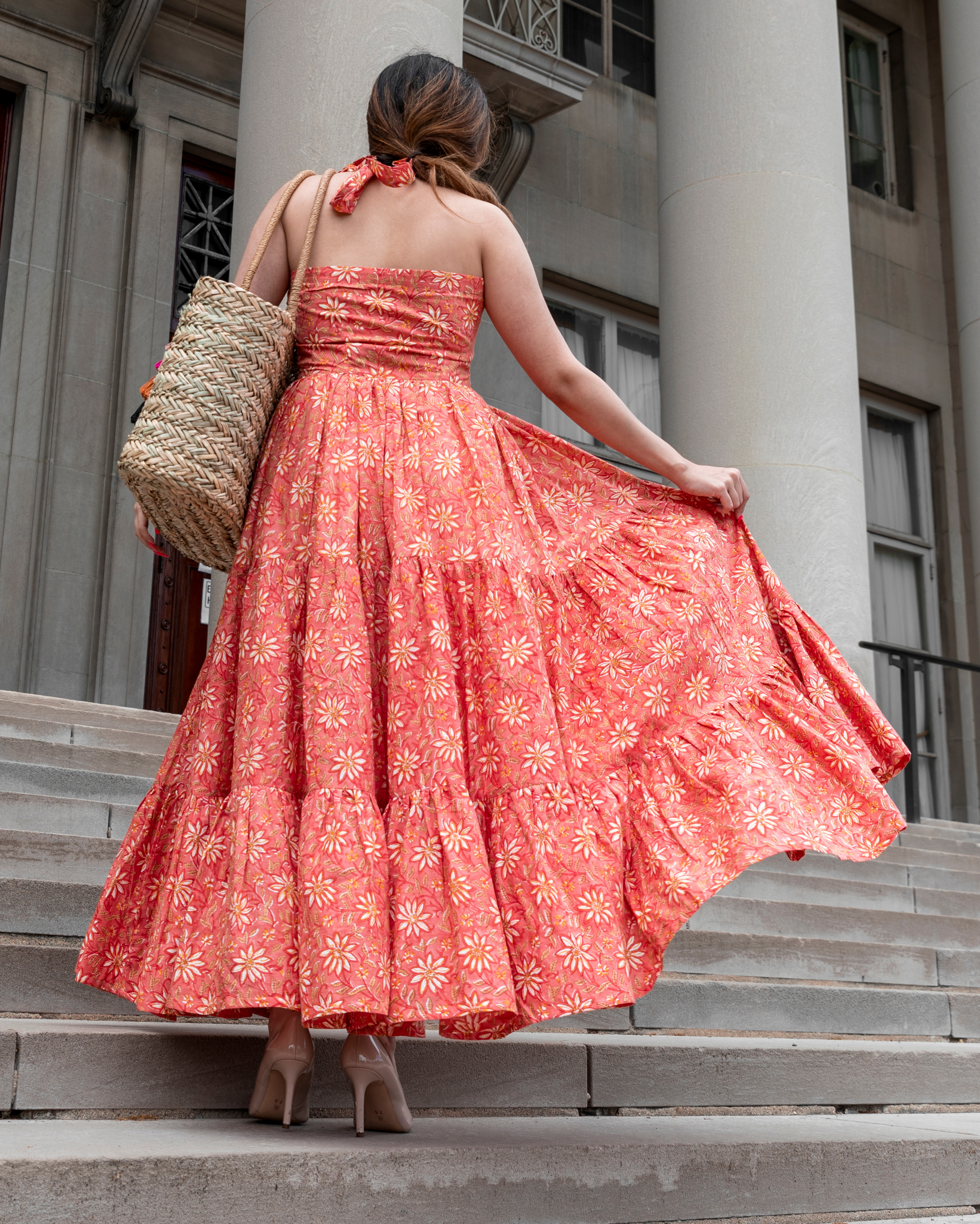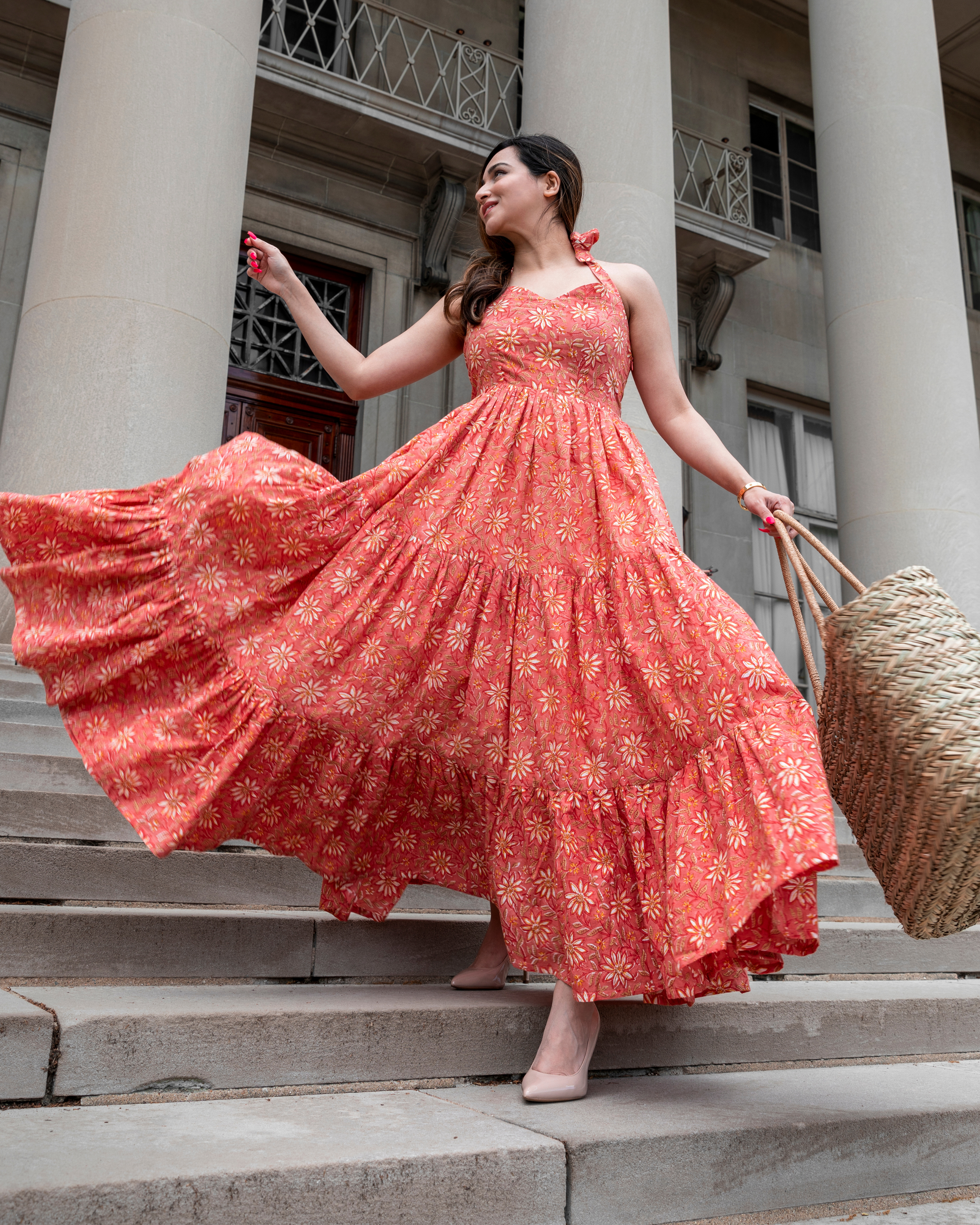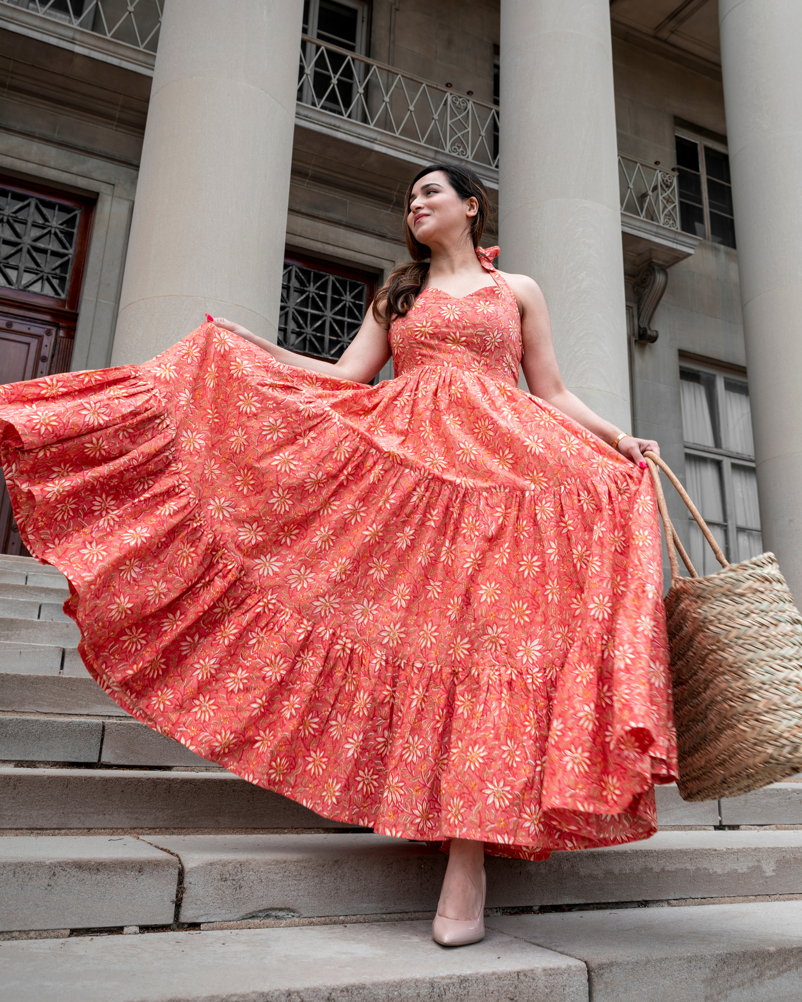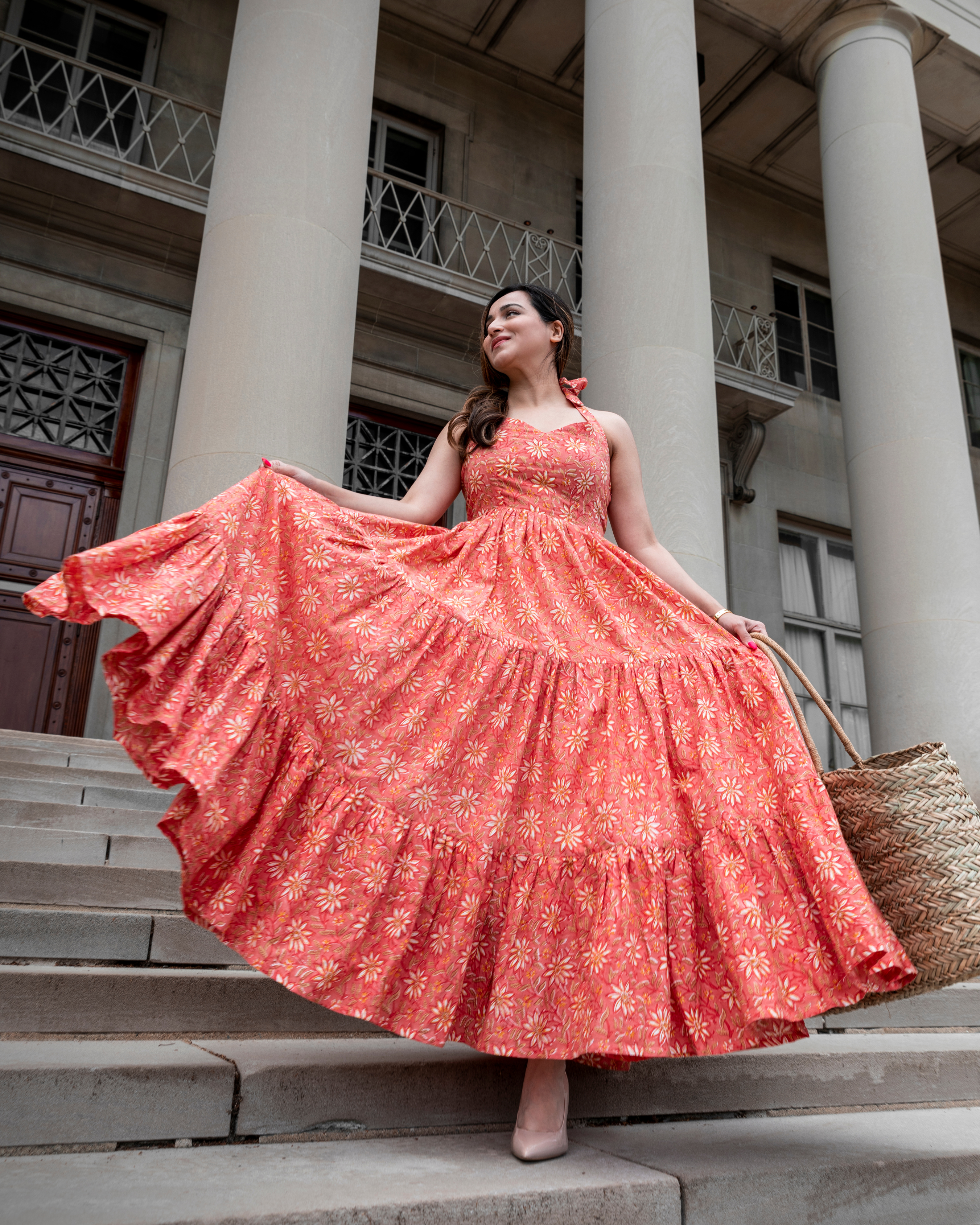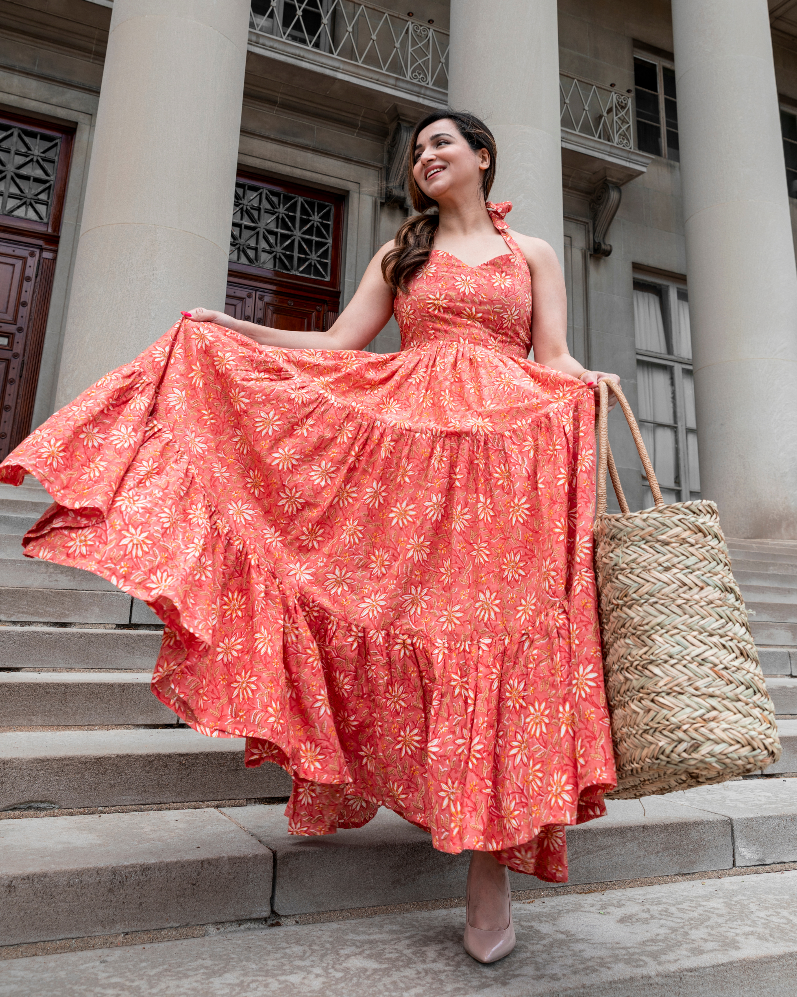 Peach Cotton Tier Handblock dress. Color: Peach Dress Fabric: Cotton Neckline: Halter CARE: Gentle Handwash Only Model Size: The model is wearing S Size Model Height: 5'7"...