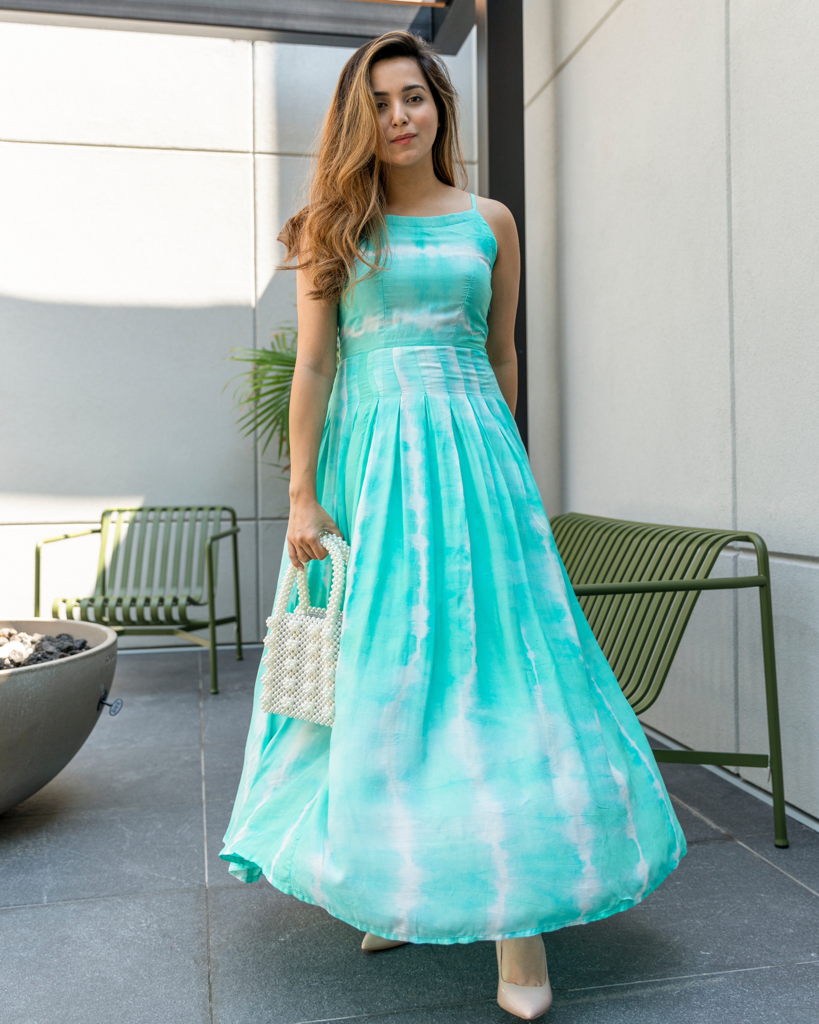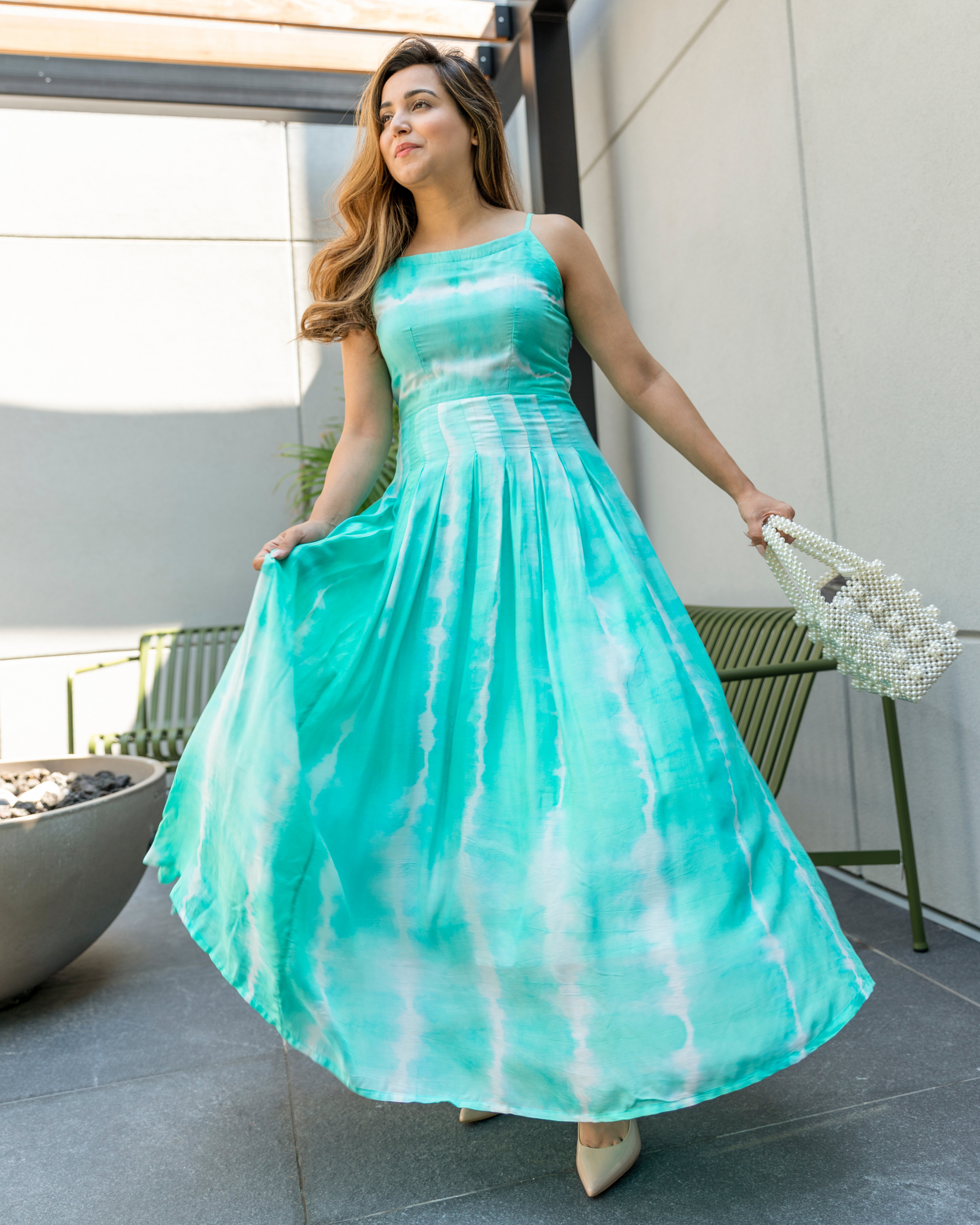 Blue Tie and Dye Dress . Color: Sea Green Dress Fabric: Silk Neckline: Square CARE: Dry Clean Only Model Size: Model is wearing S Size Model Height: 5'7"...
