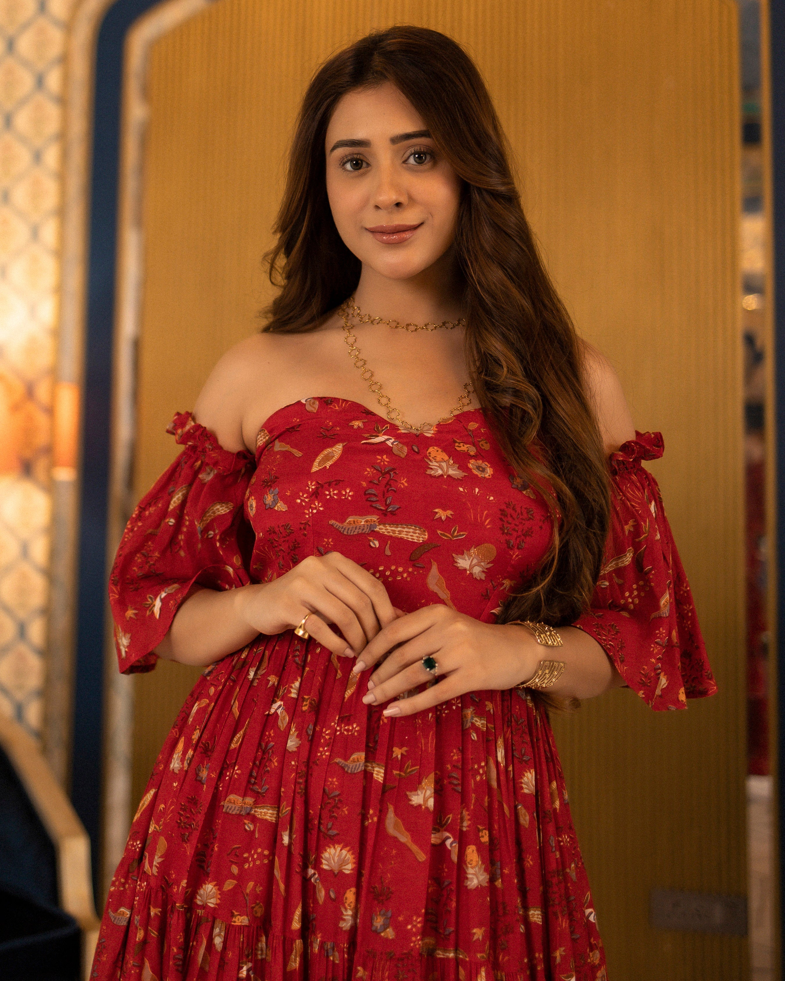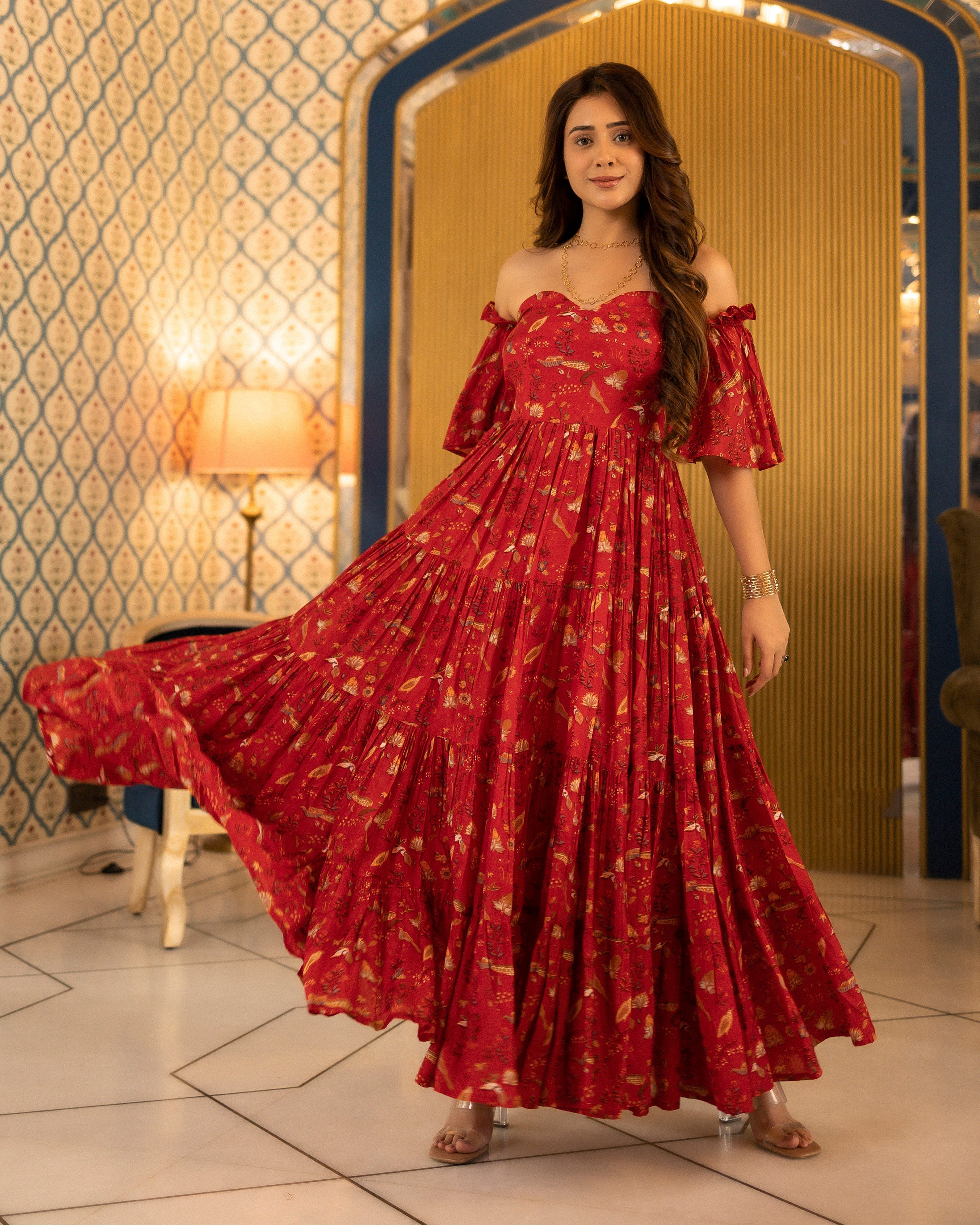 Beauty comes in various forms, and the Twyla dress embodies the concept of being "pretty hot." Created using the finest muslin material, its red hue adorned with a delicate floral jaal print makes it an ideal choice for daytime events and parties.......