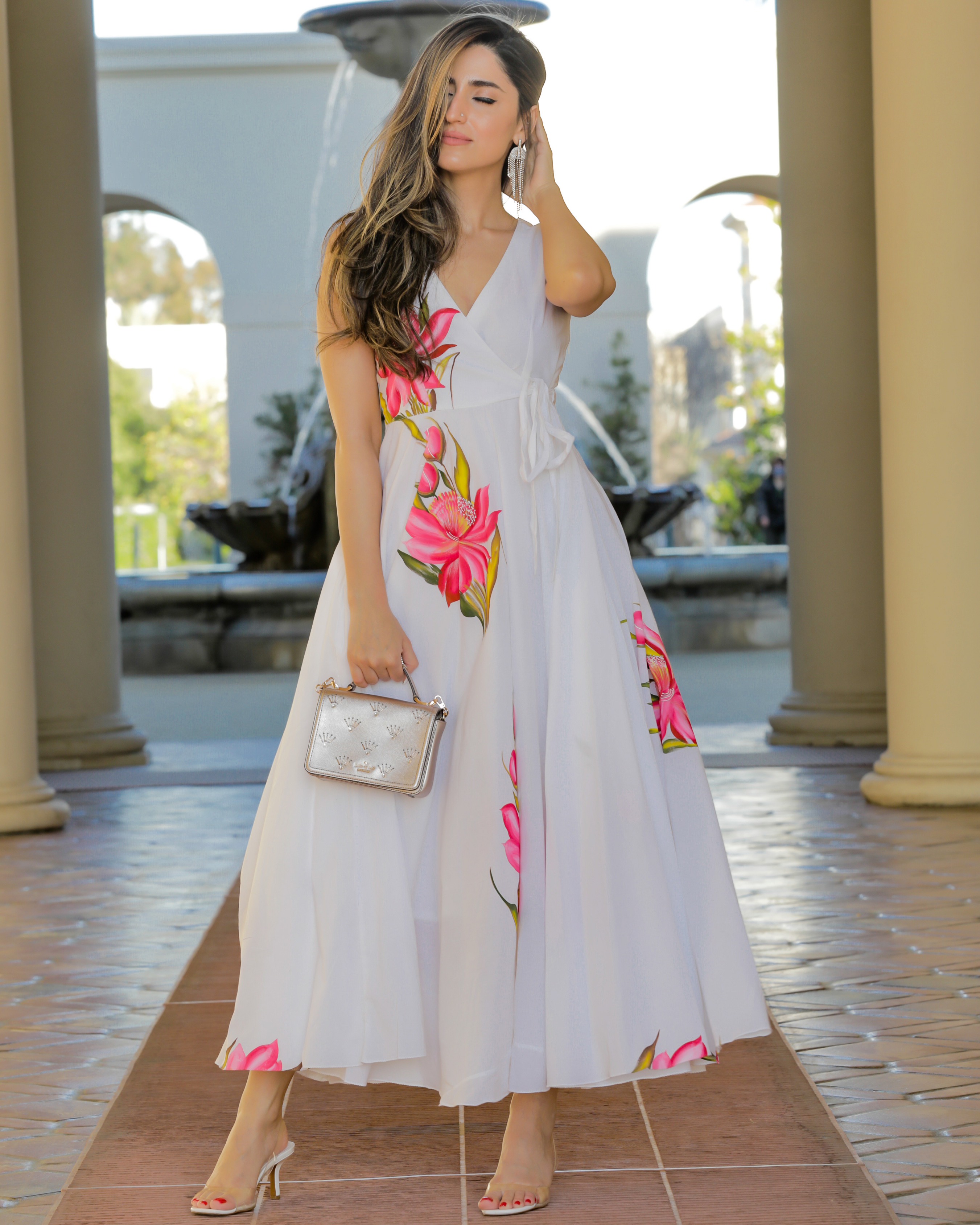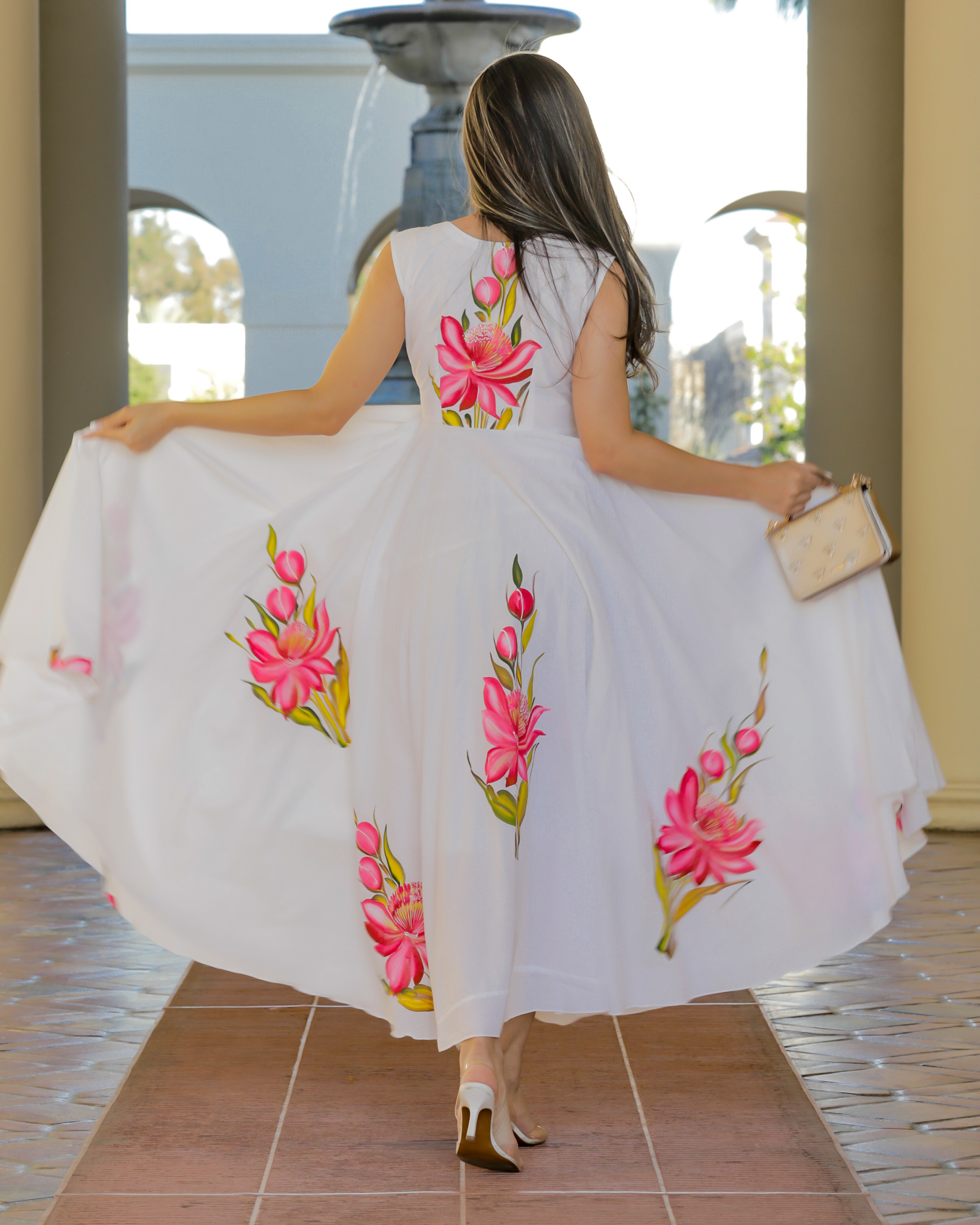 WHITE Cotton HANDPAINTED DRESS . Color: White Dress Fabric: Cotton Neckline: Angrakha CARE: Gentle Handwash Only Model Size: Model is wearing S Size Model Height: 5'7"...