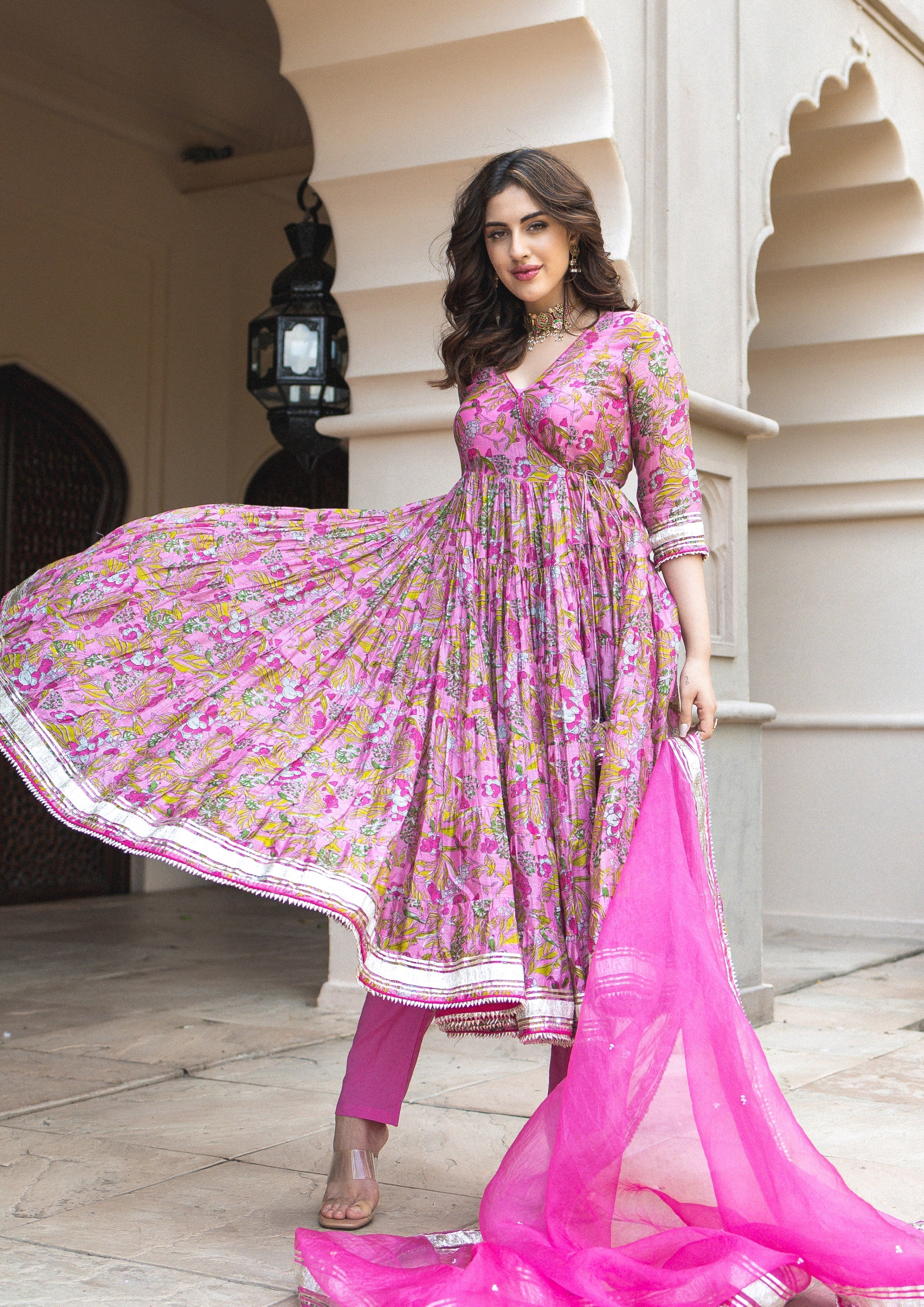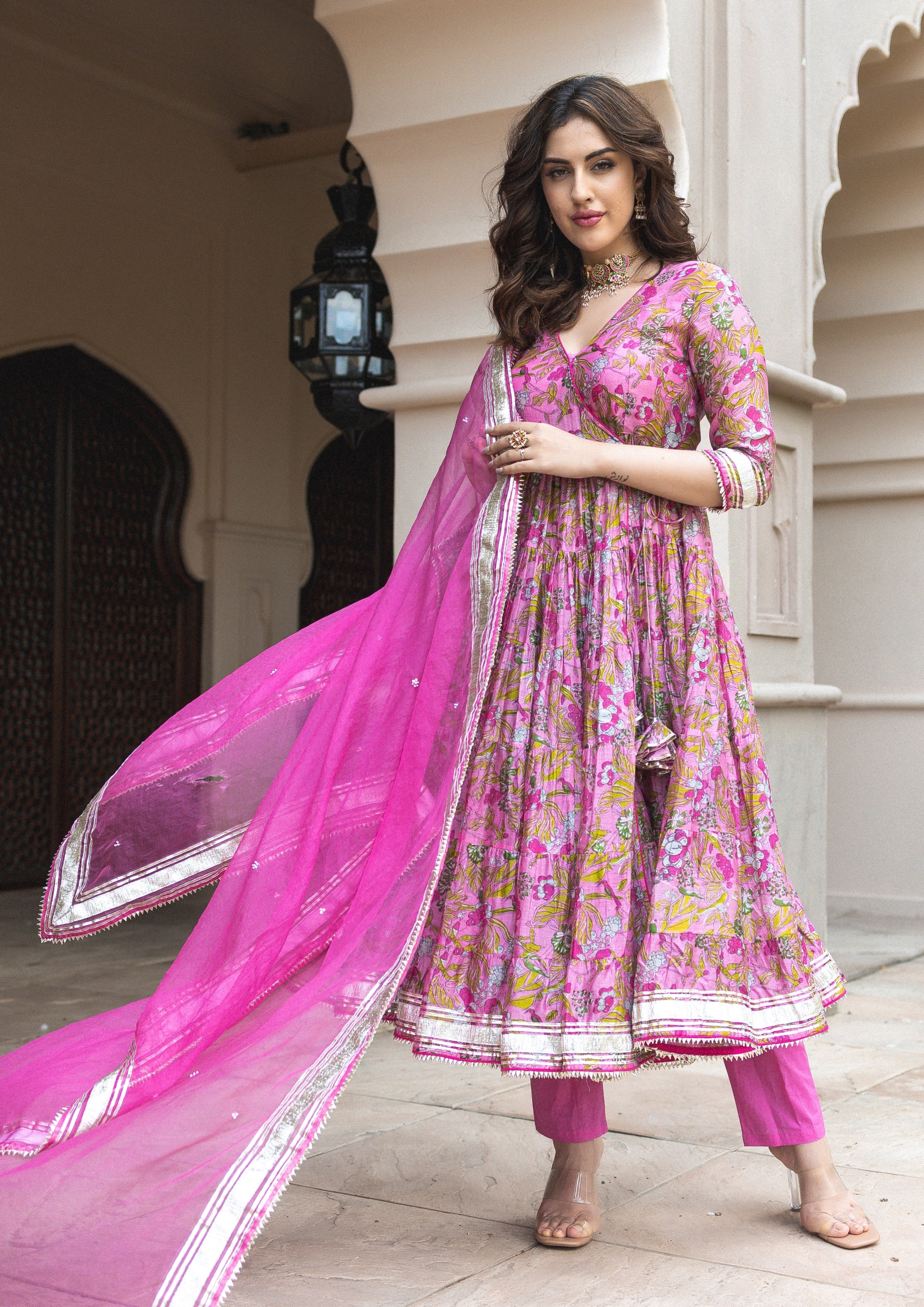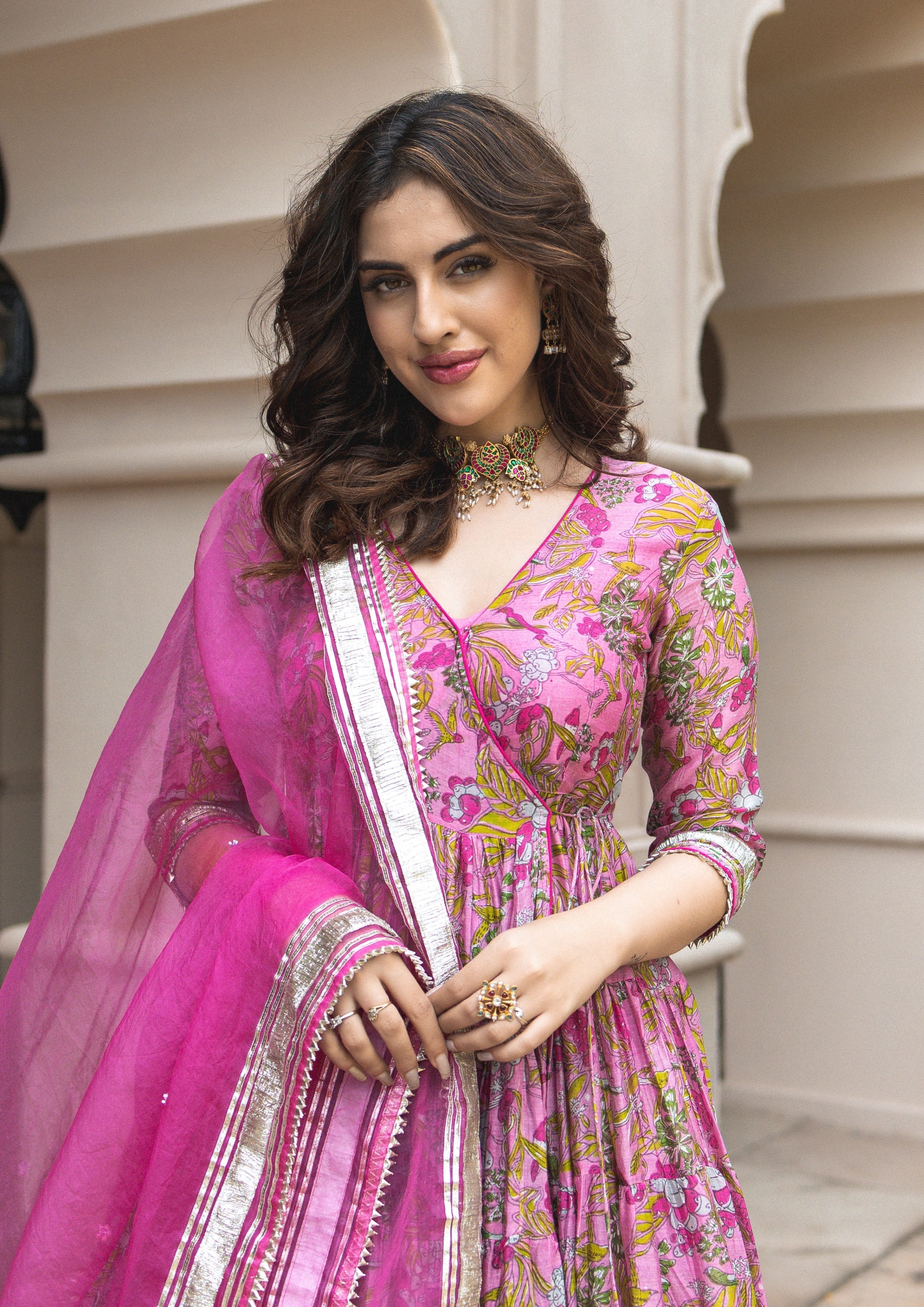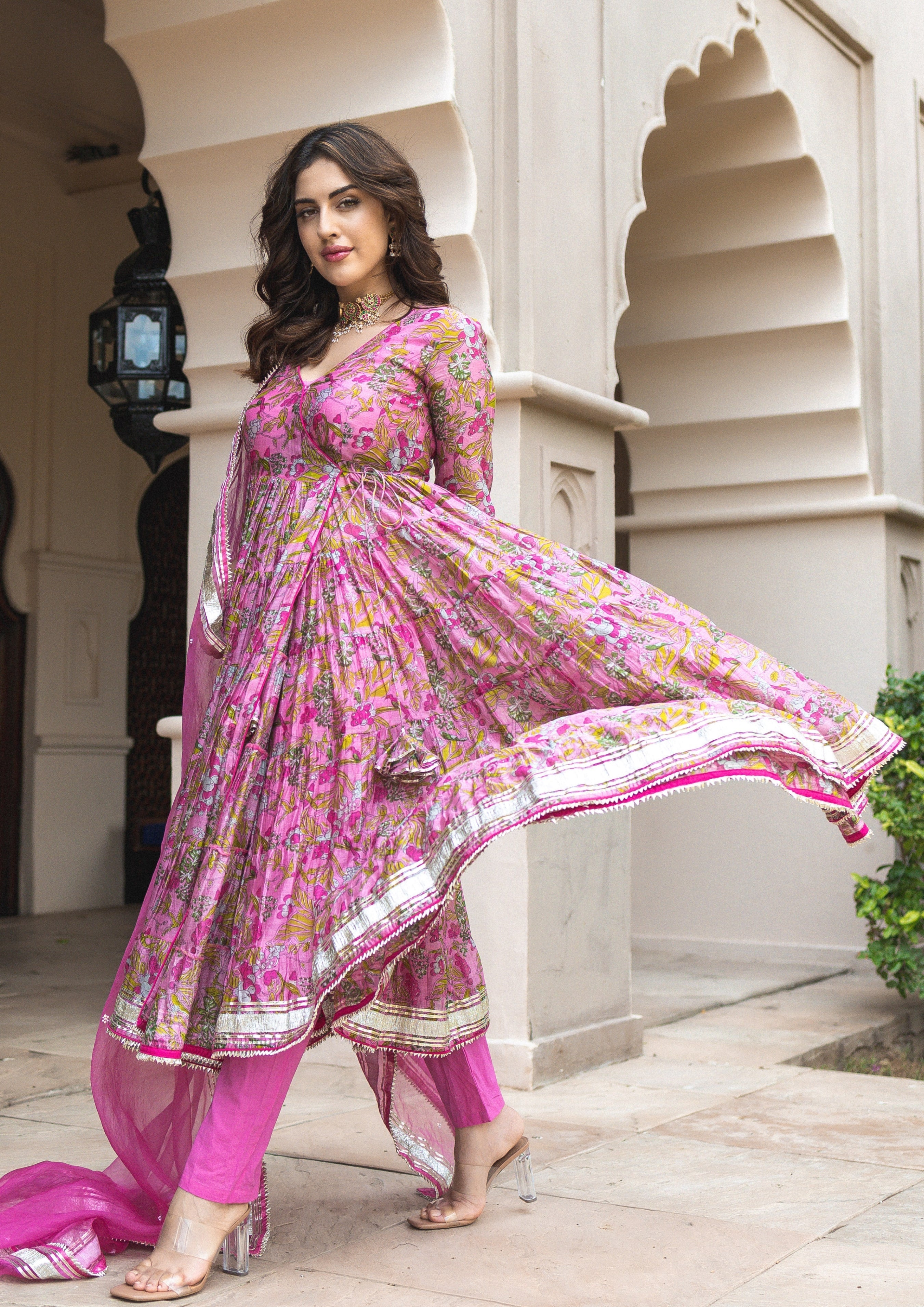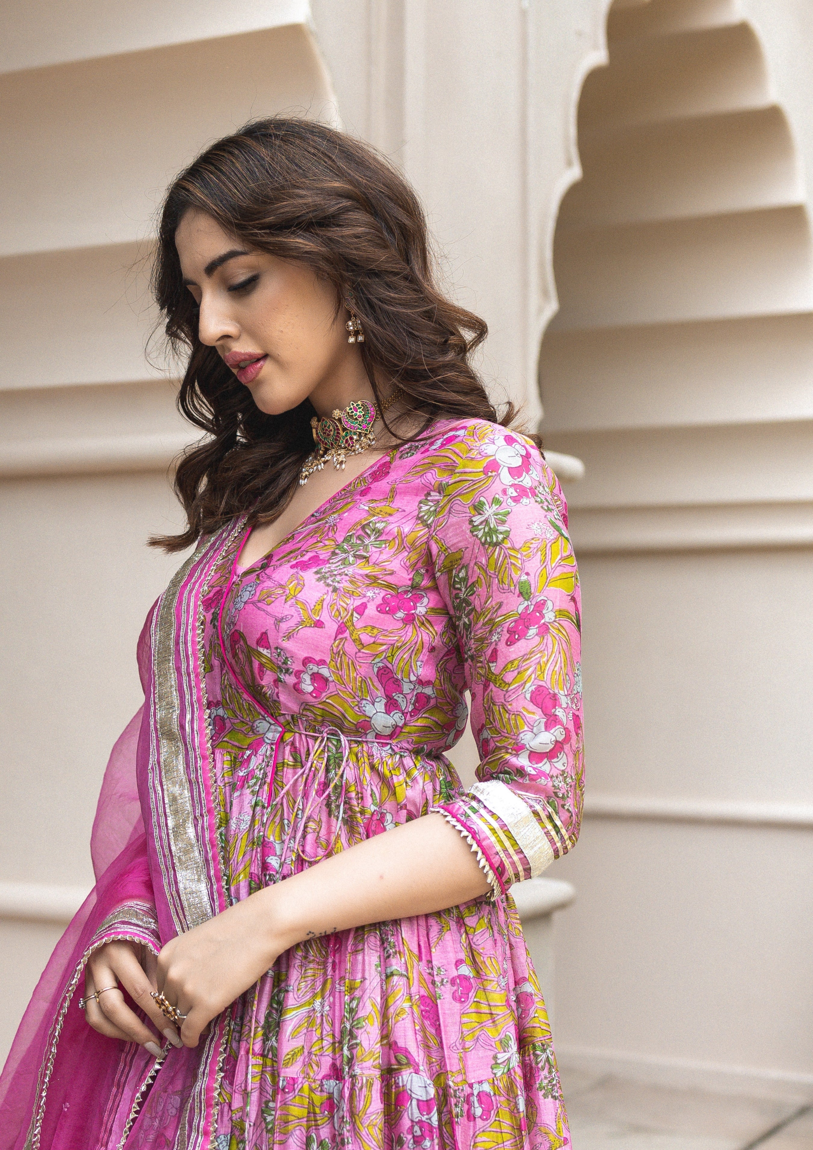 1099-3125 [Color = Pink ] [Size = XS, S, M, L, XL, XXL, 3XL, 4XL, 5XL] Yelena Chanderi Angrakha Suit Se...